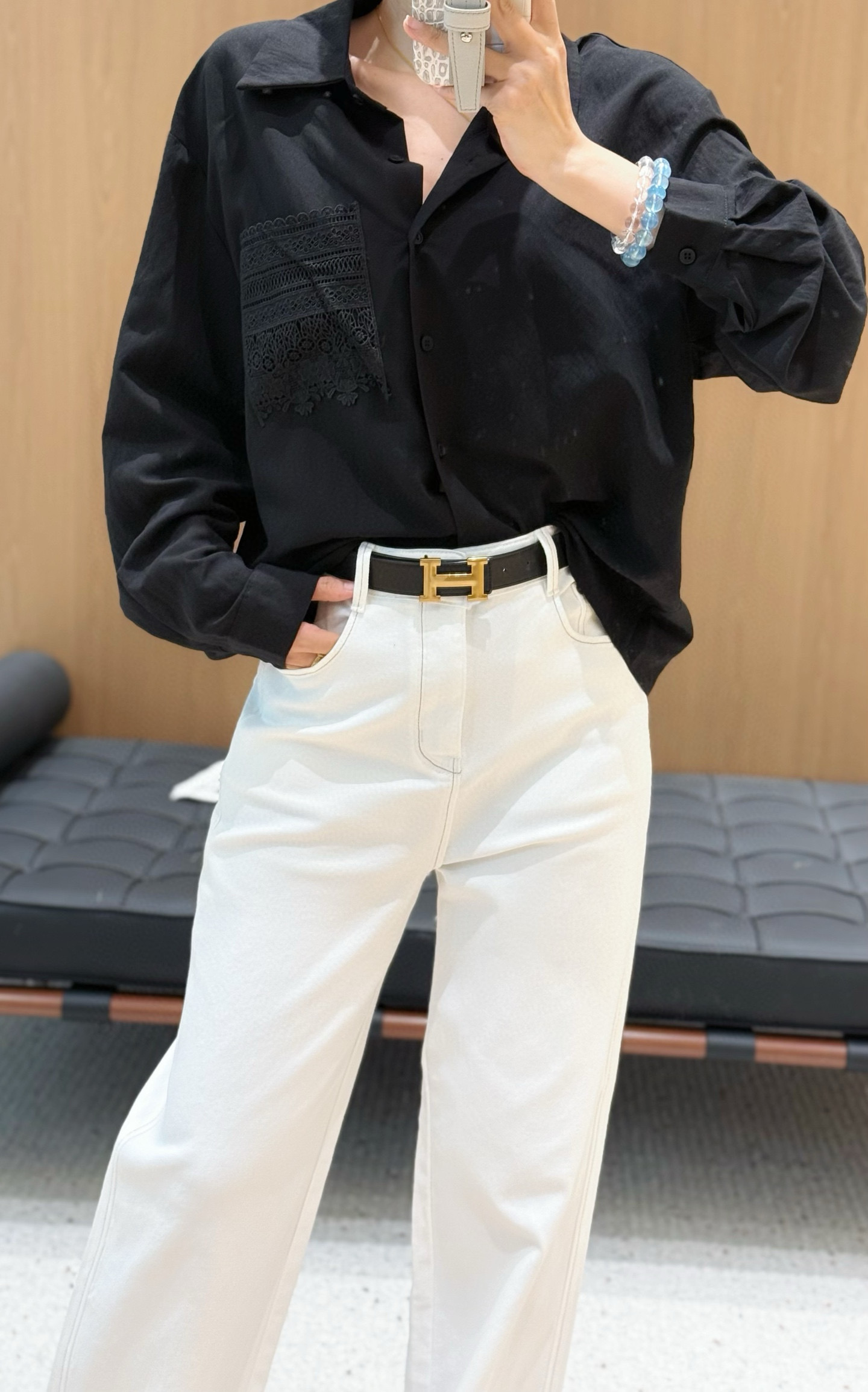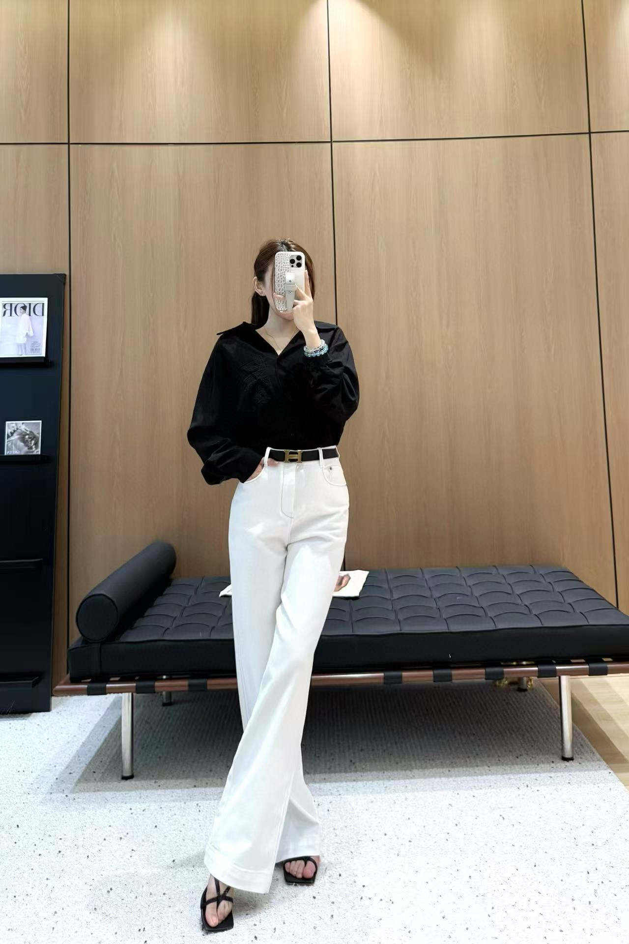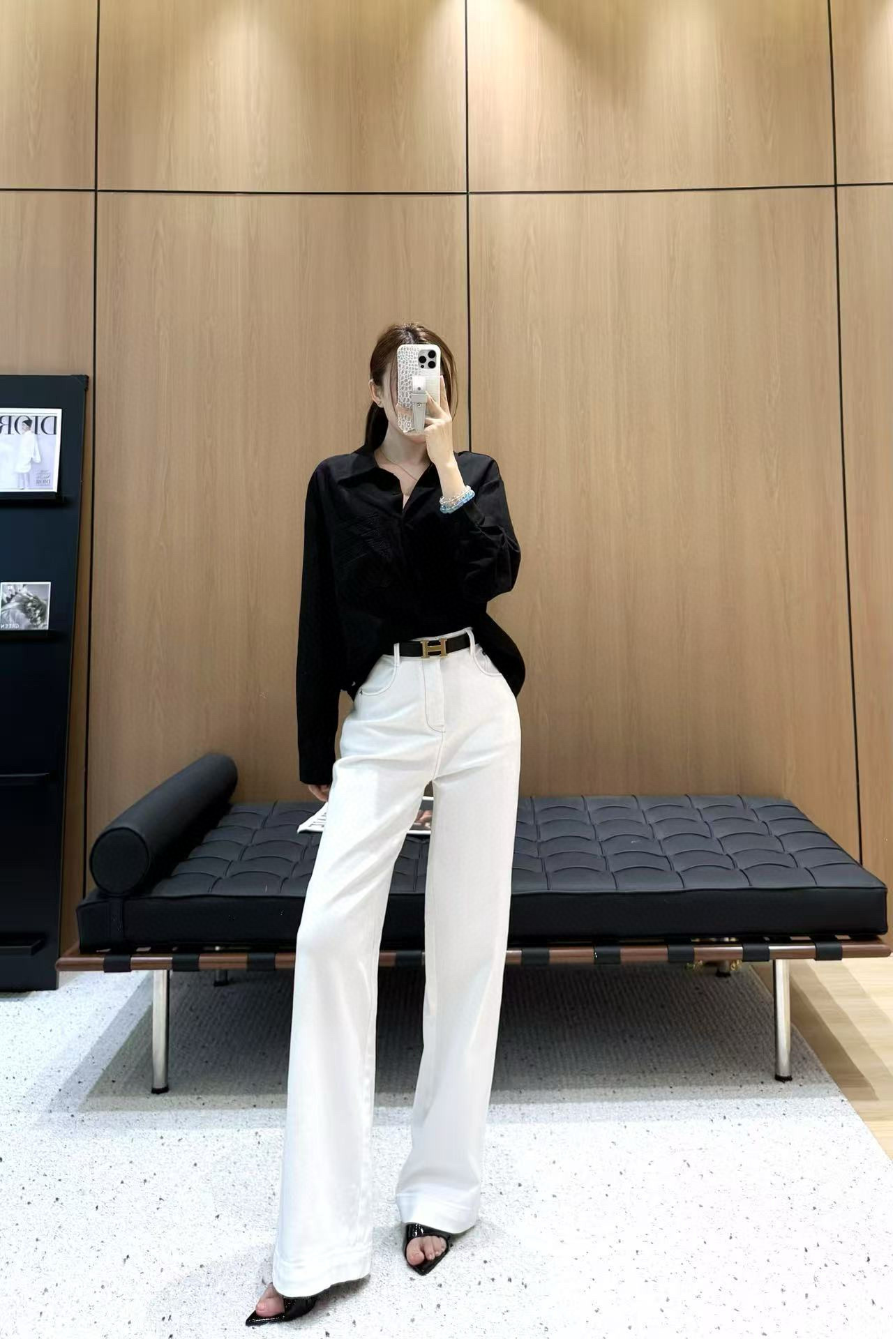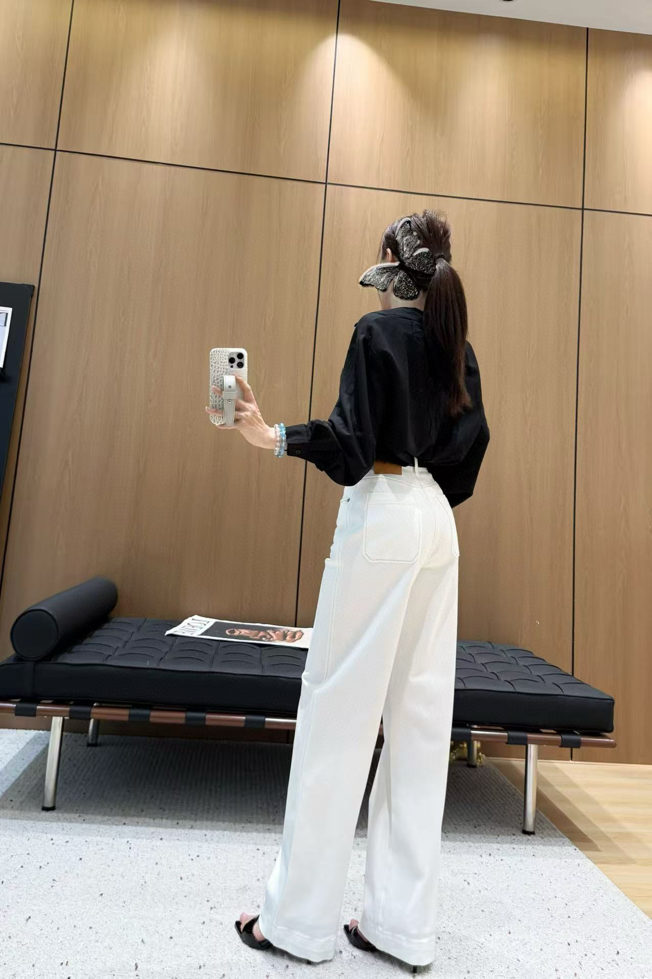 2025 Designer White Denim Jeans with Belt, High-Waisted, Straight Leg