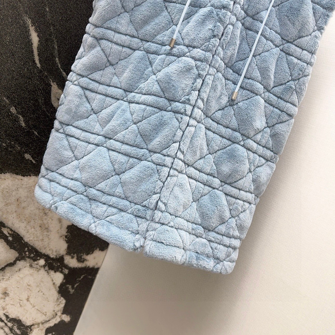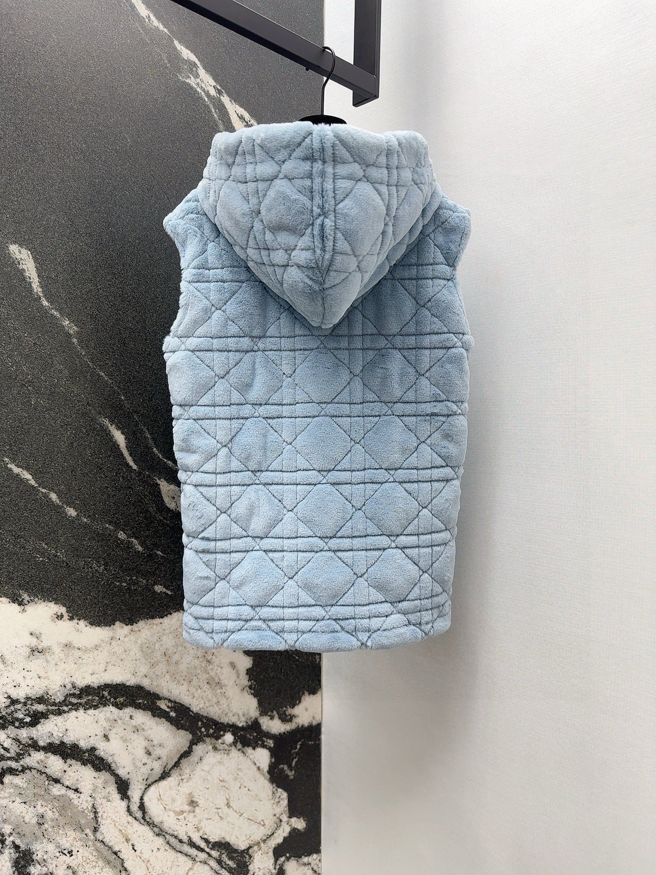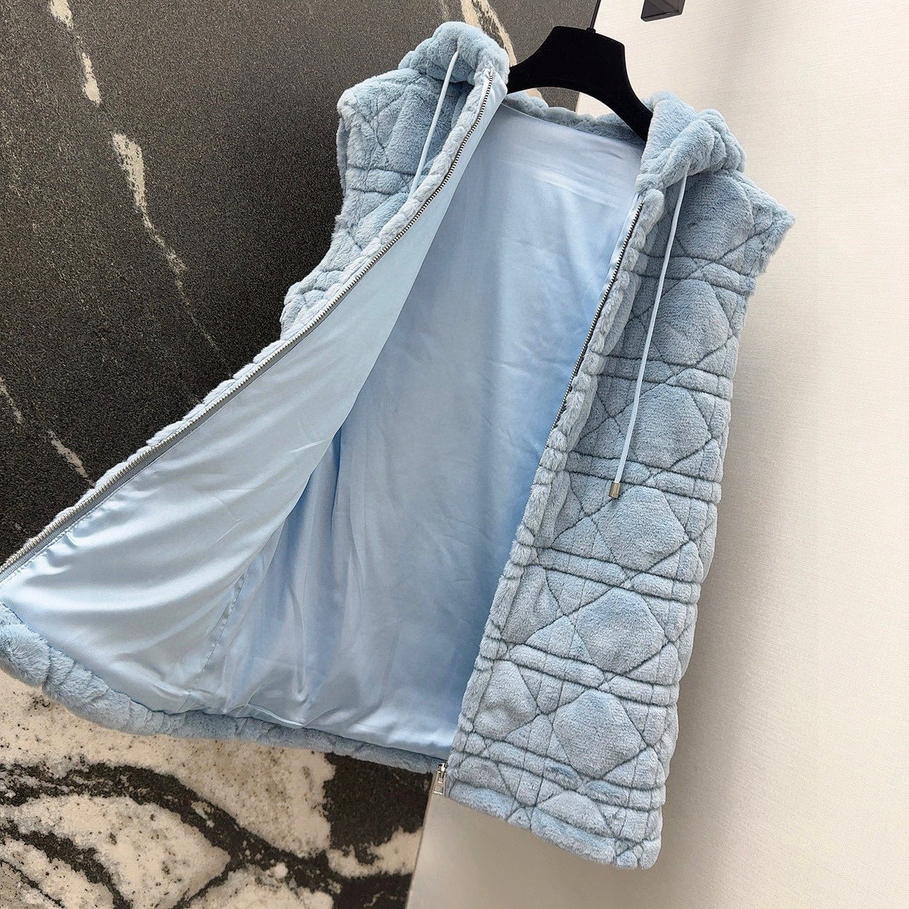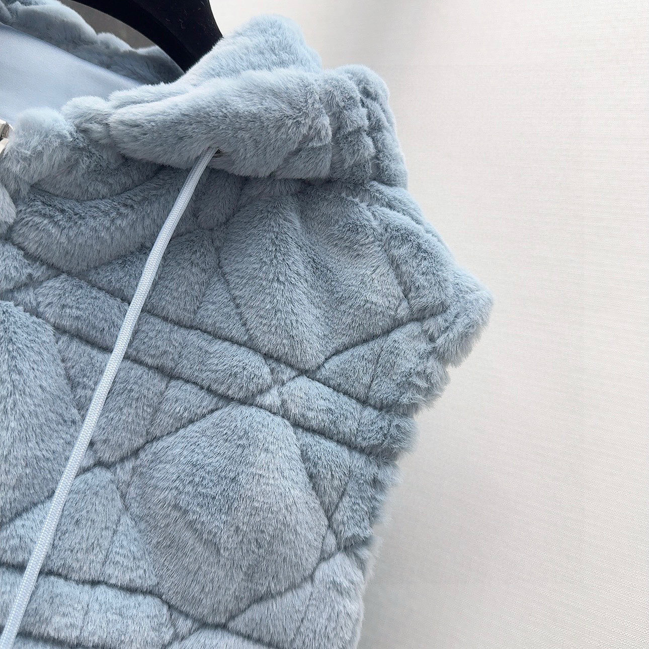 Stay warm and stylish with this baby blue faux fur vest. Features diamond quilting, a cozy hood, and a relaxed fit for everyday wear.