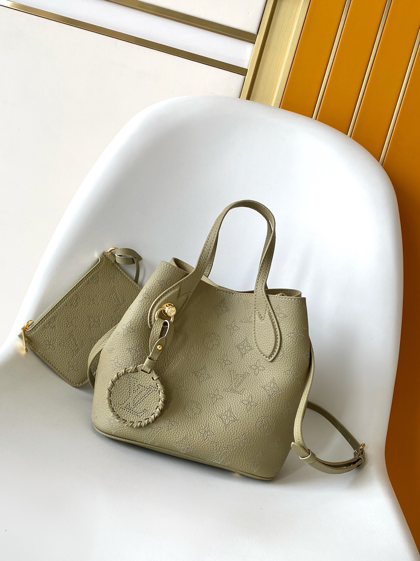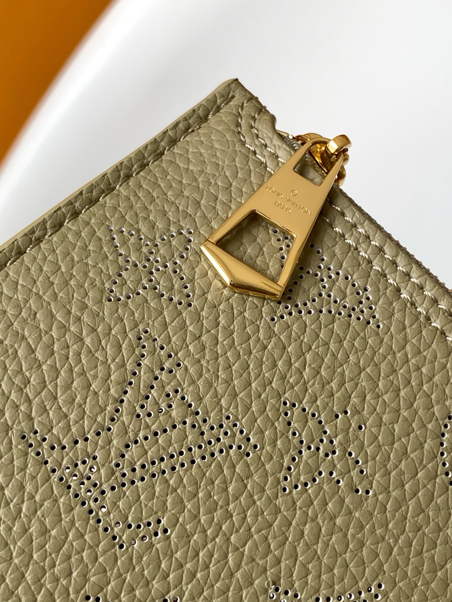 The Blossom small handbag combines perforated khaki green leather with a removable pouch for effortless style and practicality.