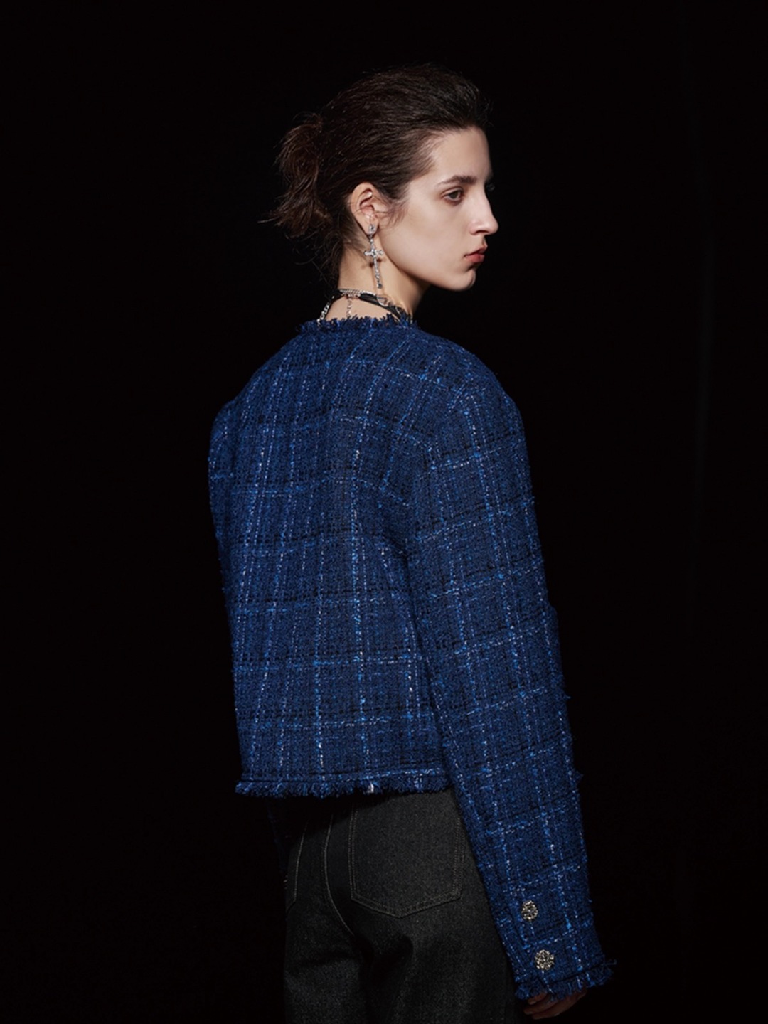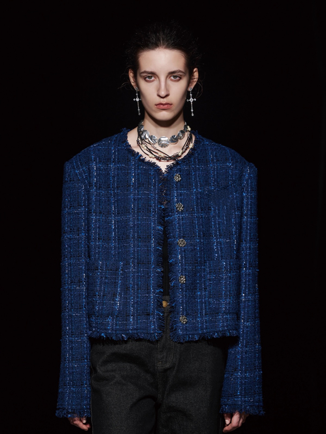 Elevate your style with this blue wool-blend tweed jacket. Featuring a classic Chanel-style silhouette, shoulder pads, and frayed edges.