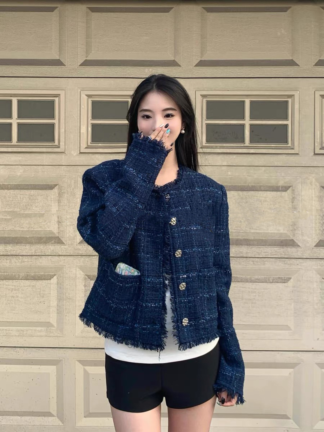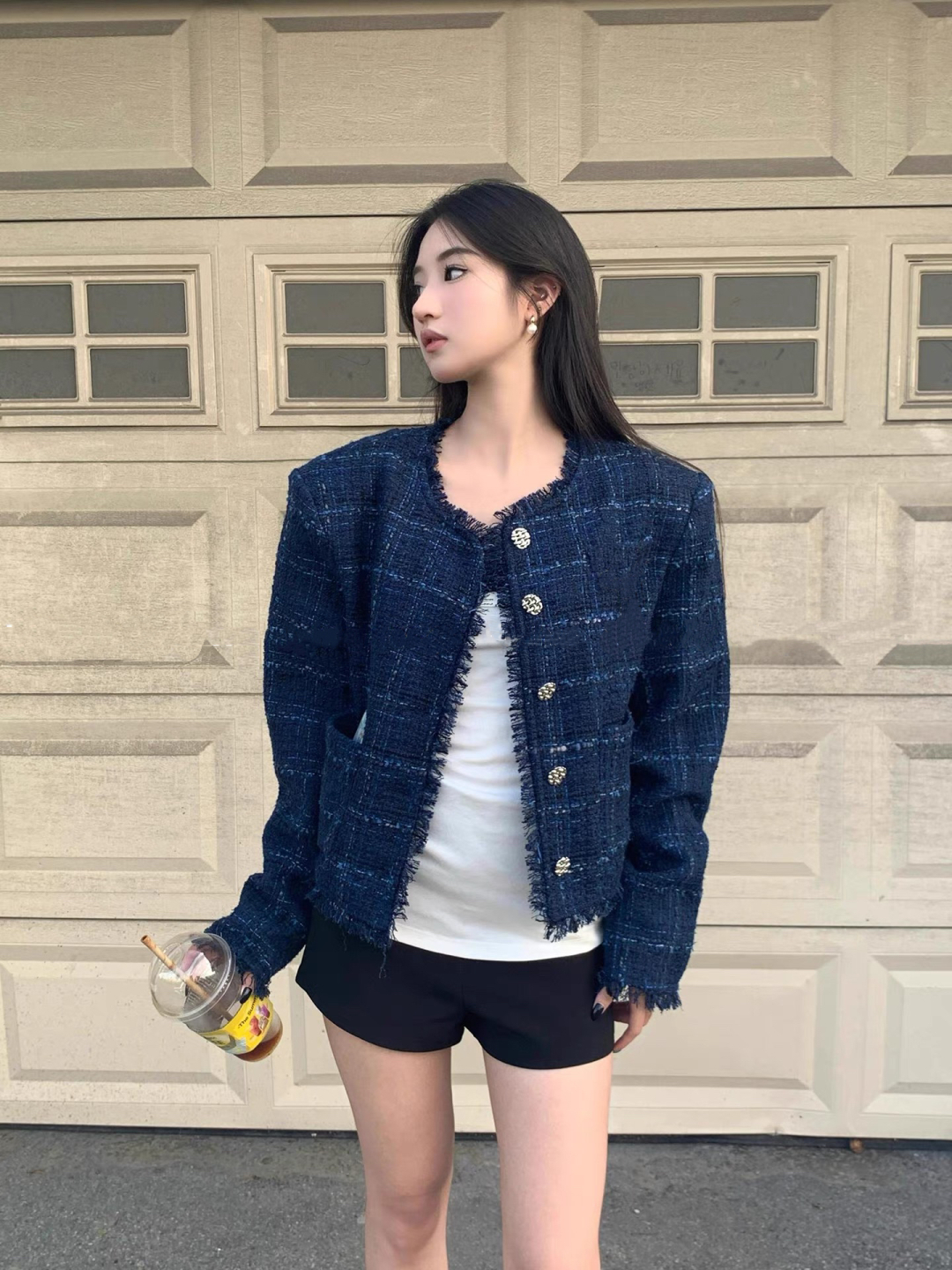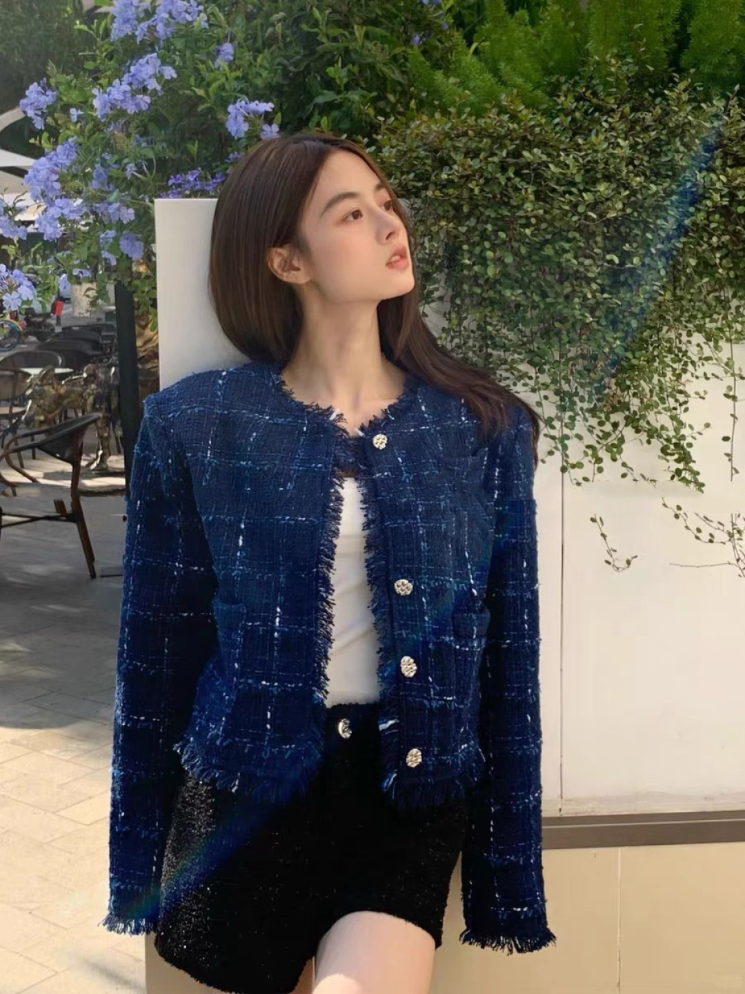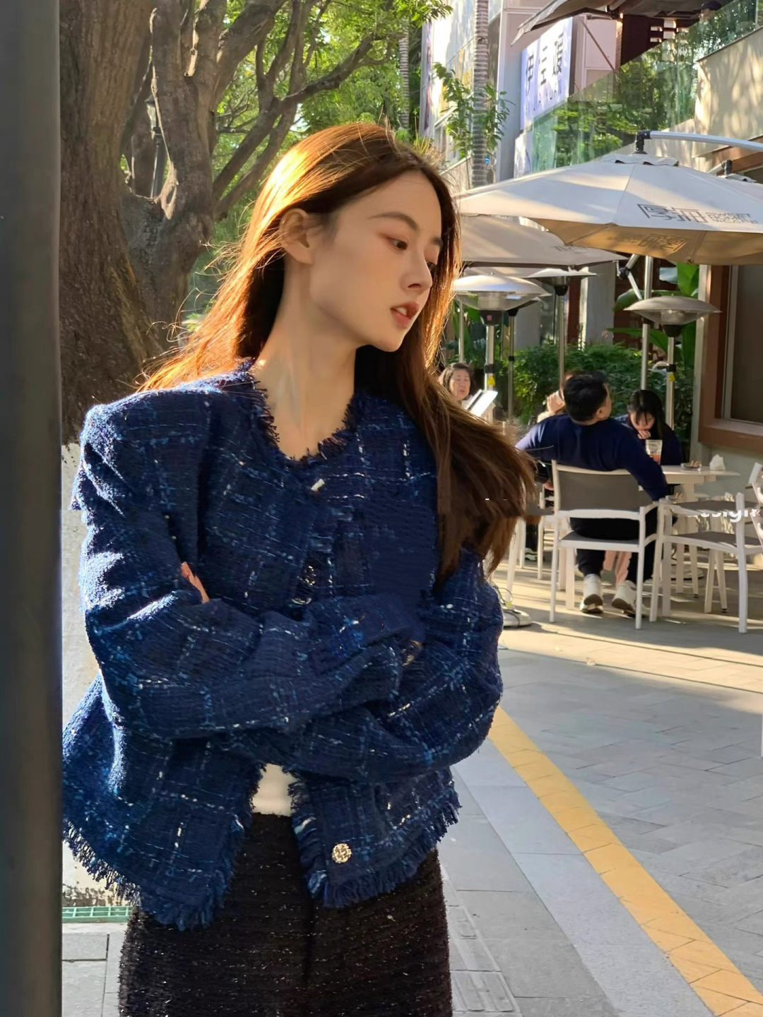 This blue tweed jacket is a stunning addition to any wardrobe, blending classic elegance with modern details. Inspired by the iconic Chanel style, it offers a sophisticated look perfect for both casual and formal occasions.