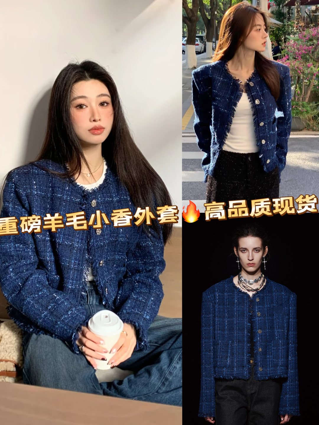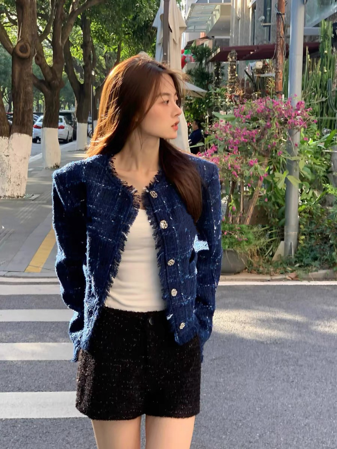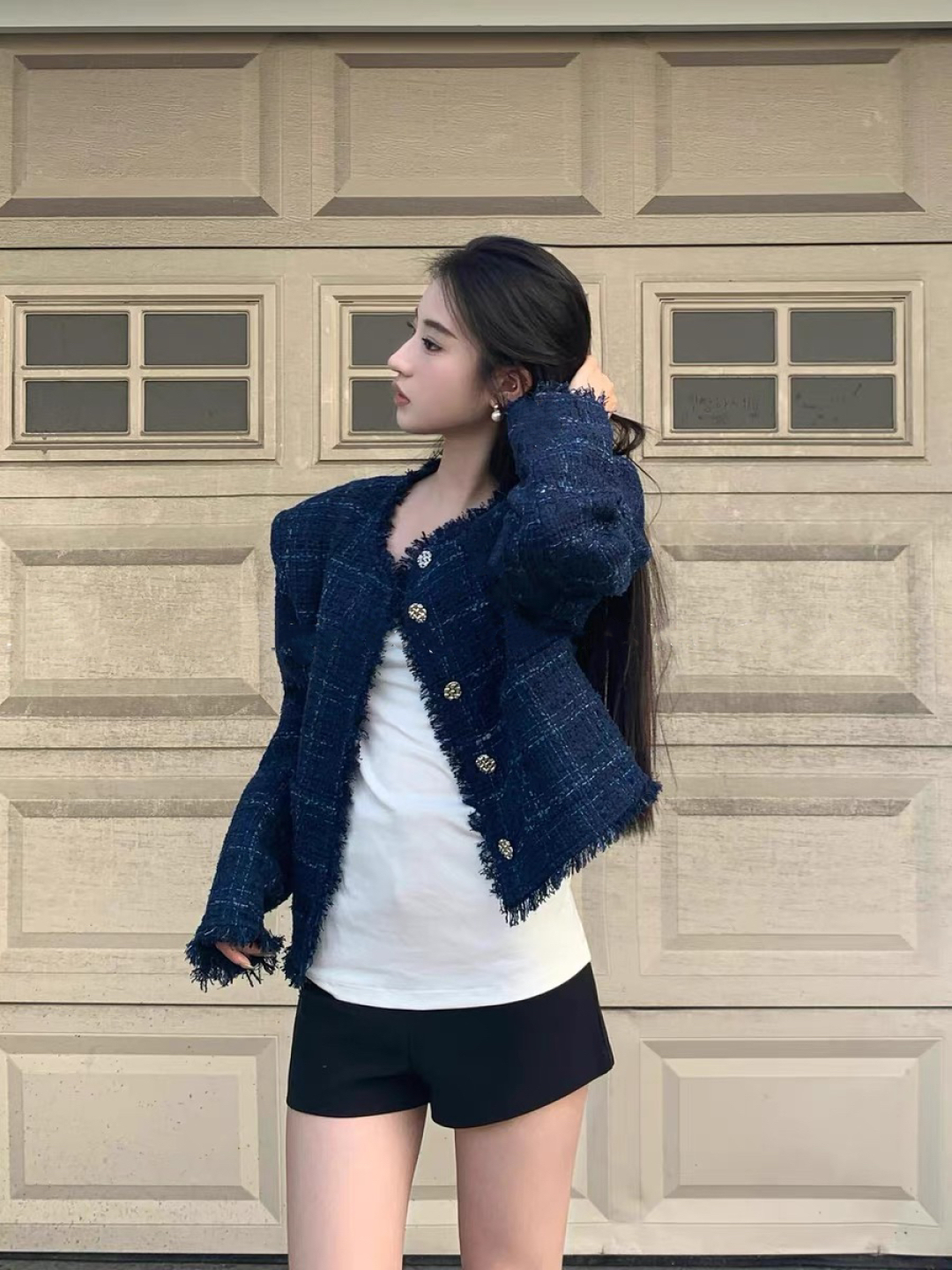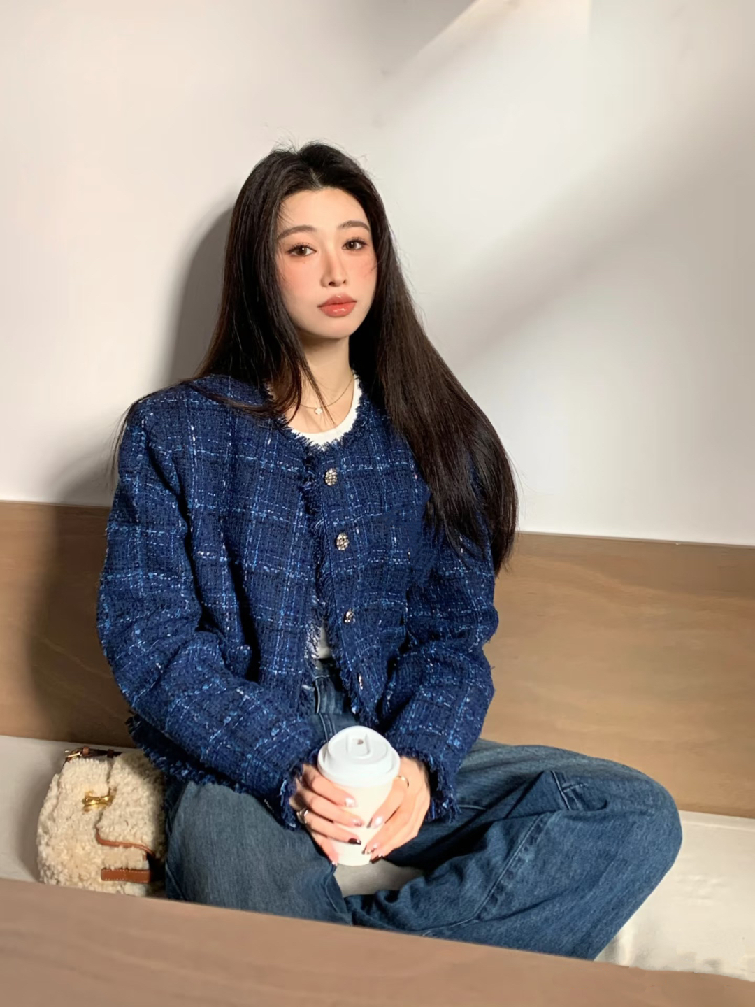 This blue tweed jacket is a stunning addition to any wardrobe, blending classic elegance with modern details. Inspired by the iconic Chanel style, it offers a sophisticated look perfect for both casual and formal occasions.