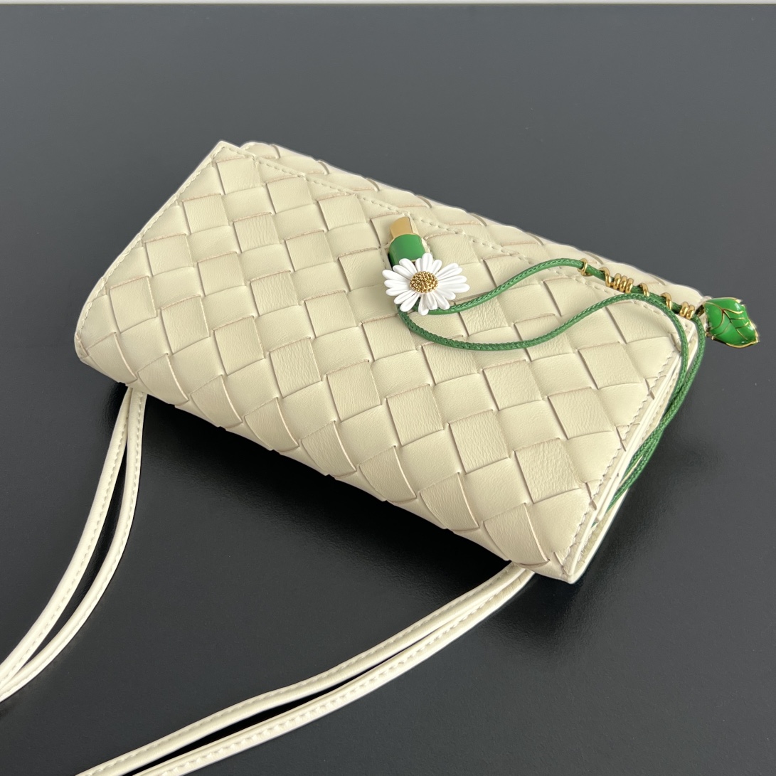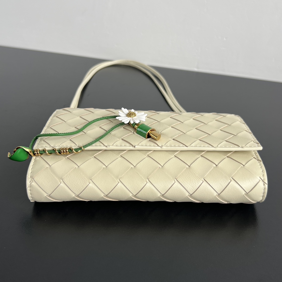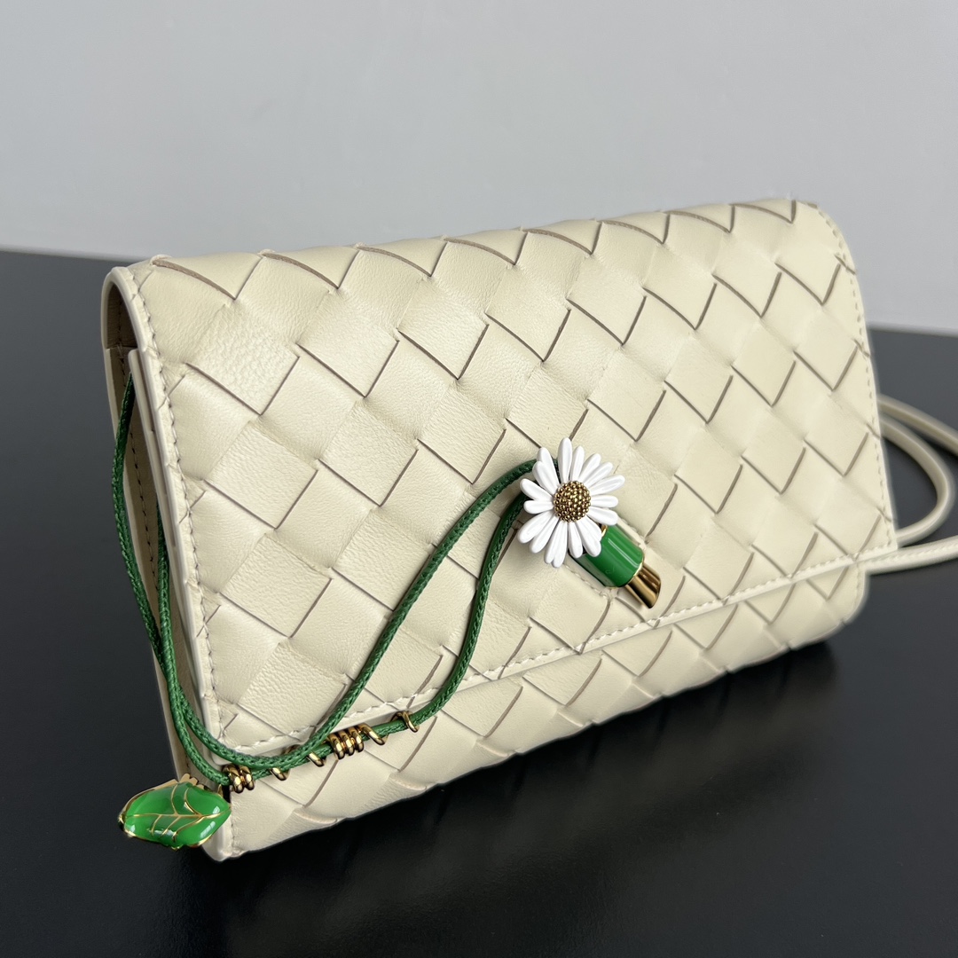 Charming Bottega Veneta crossbody with daisy detail. Crafted from woven leather, perfect for adding a touch of spring to any outfit. Dimensions: 19x13x2 cm.