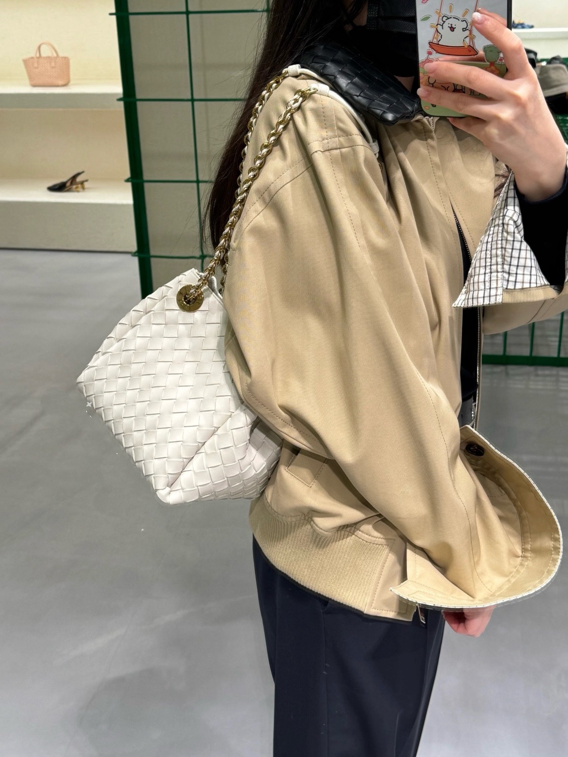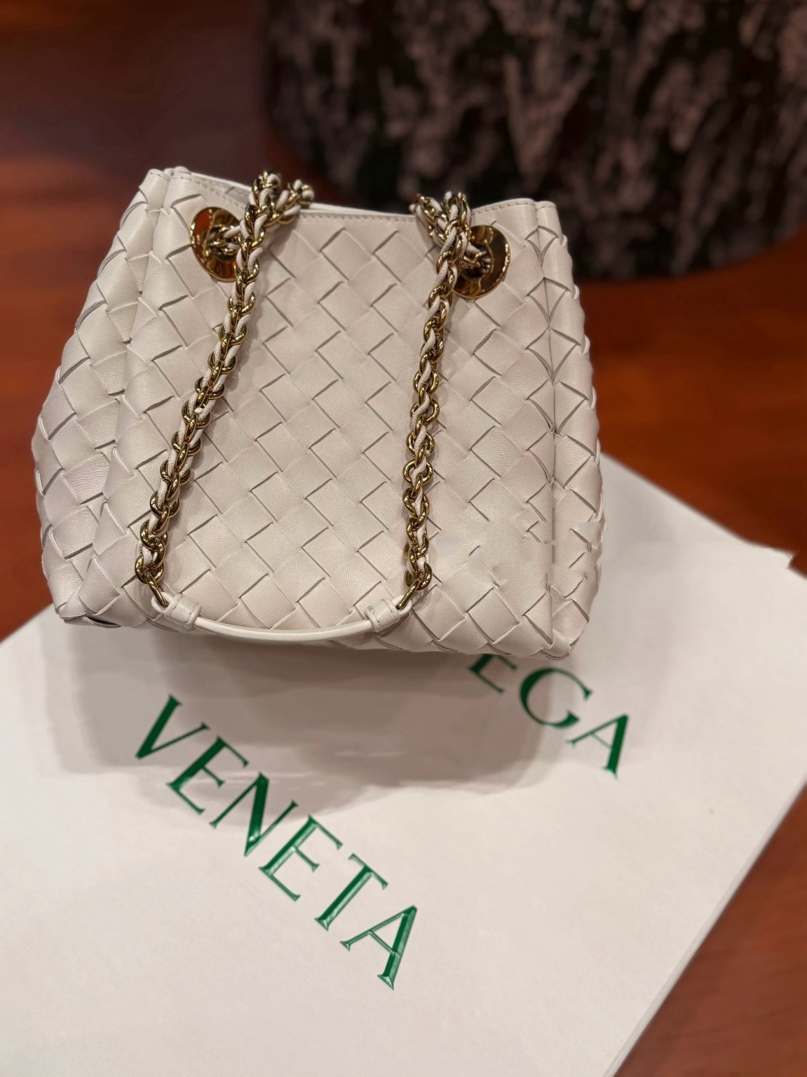 The Bottega Veneta Andiamo small chain bag is a delightful accessory that combines distinctive design with exquisite craftsmanship. Its unique shape and intricate woven leather make it a standout piece for any fashion enthusiast.