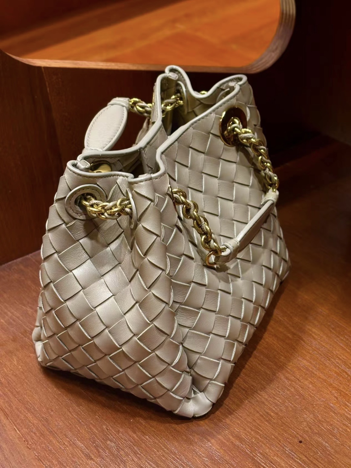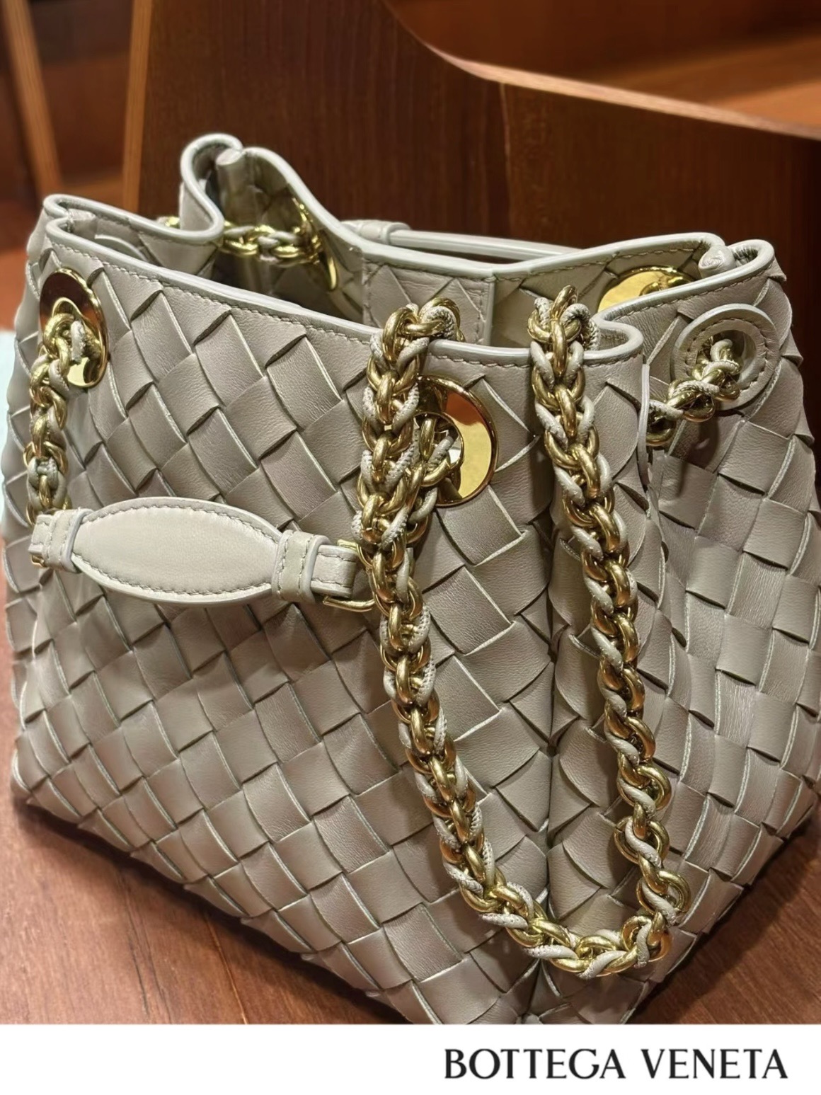 The Bottega Veneta Andiamo Small Chain Bag is a delightful accessory that combines unique design with the brand's signature craftsmanship. Its distinctive shape and luxurious details make it a standout piece for any fashion enthusiast.