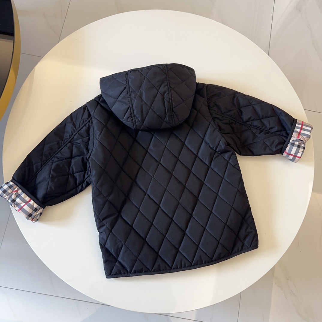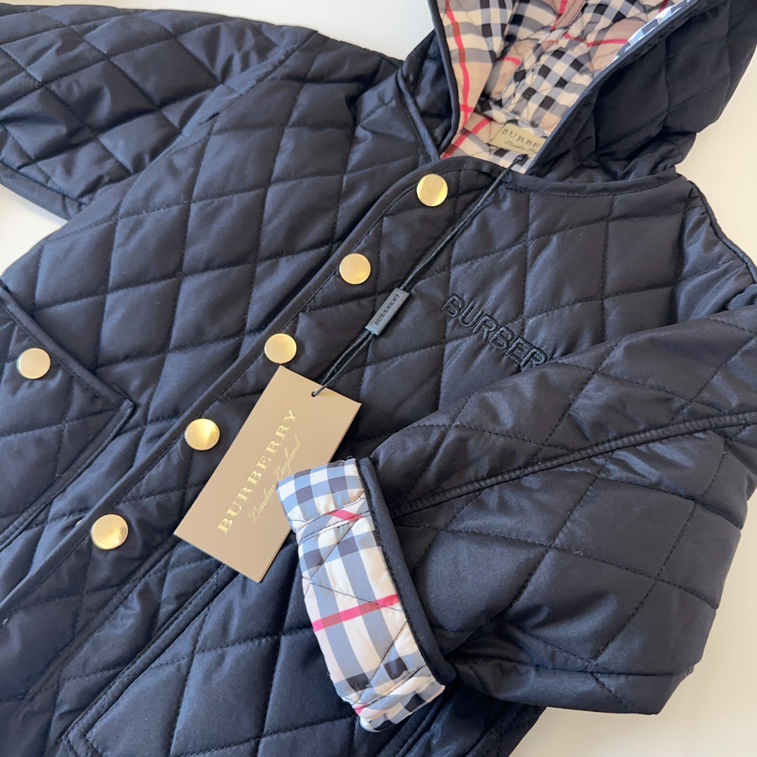 Classic Burberry kids' quilted jacket in soft cotton fabric, featuring signature check lining and embroidered logo detail. Comfortable and stylish outerwear.