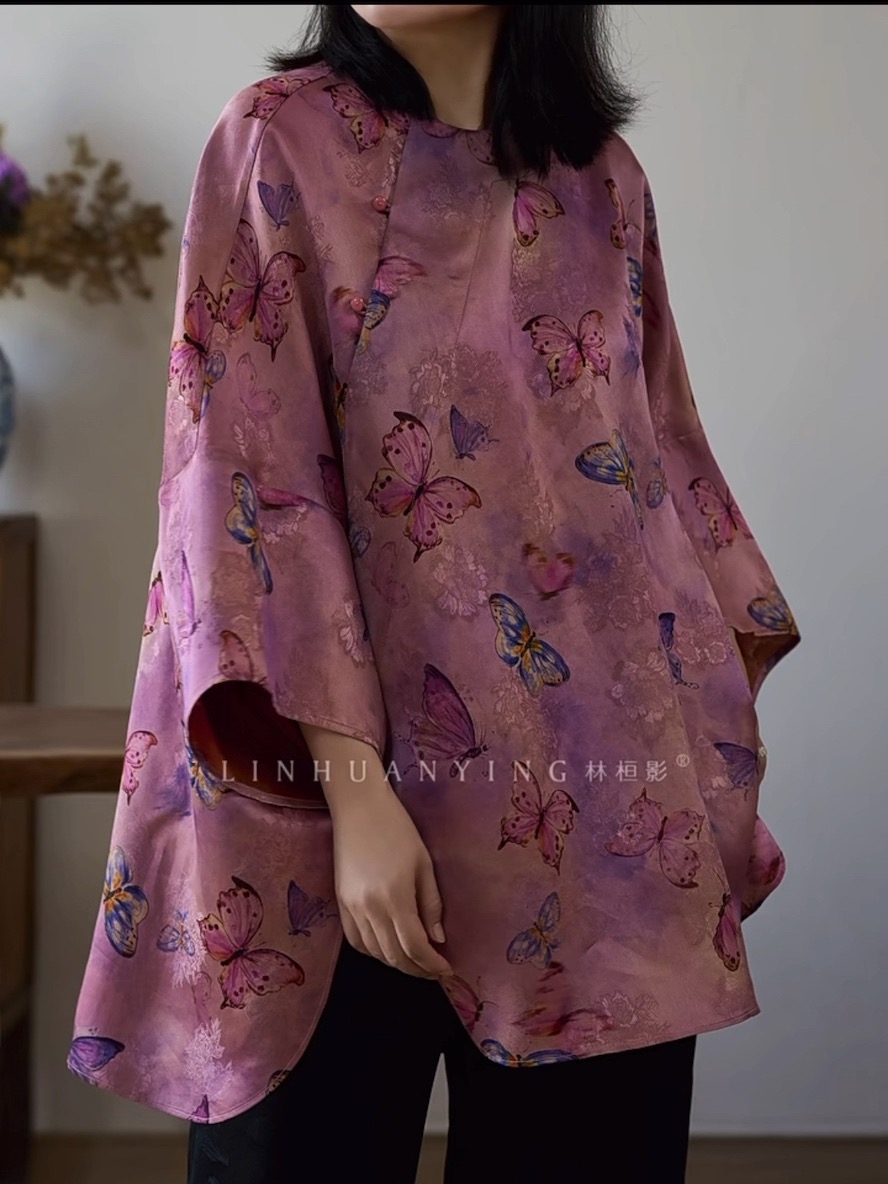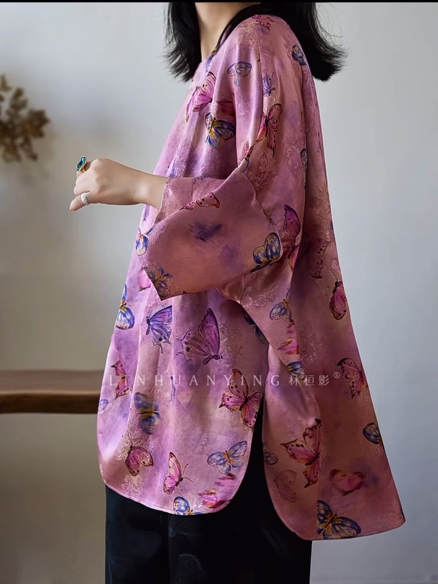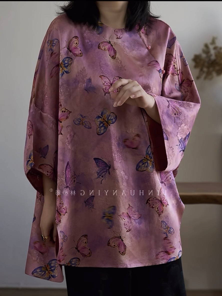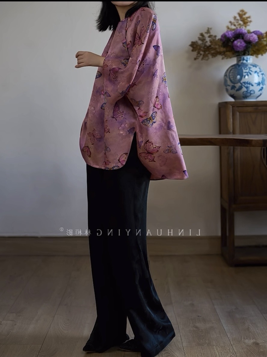 Butterfly Print Loose Fit Blouse, Relaxed New Chinese Style Top for Women