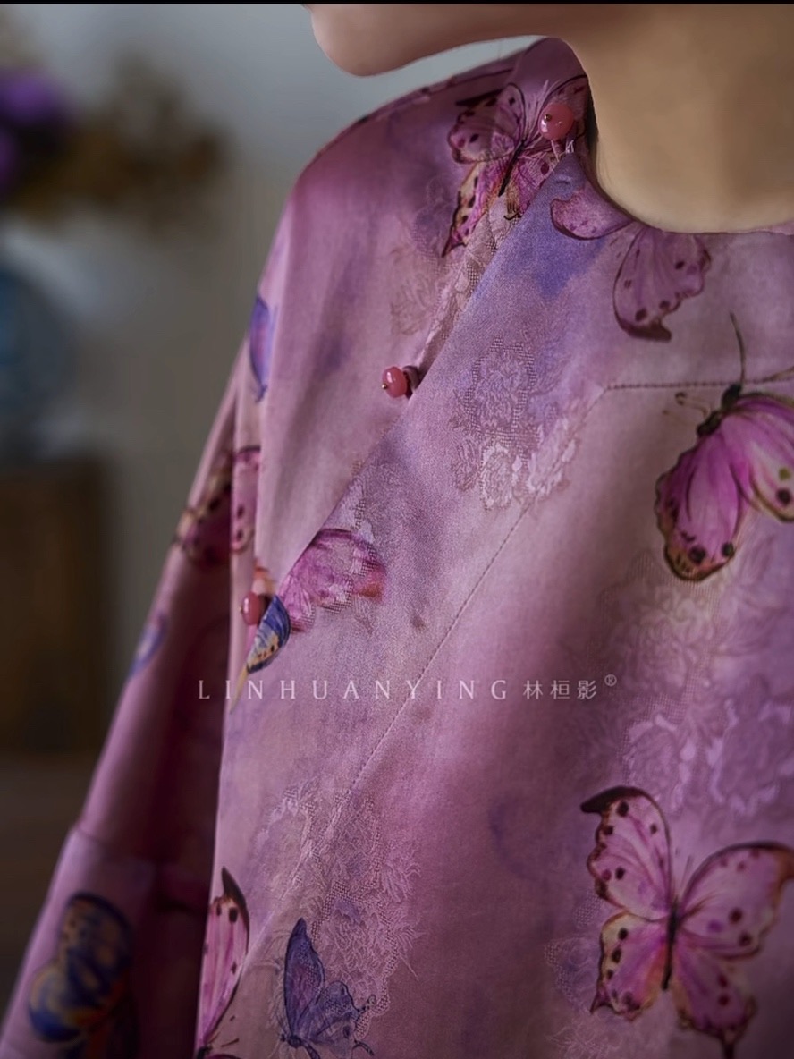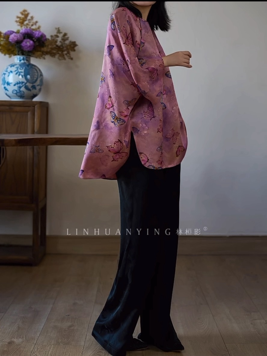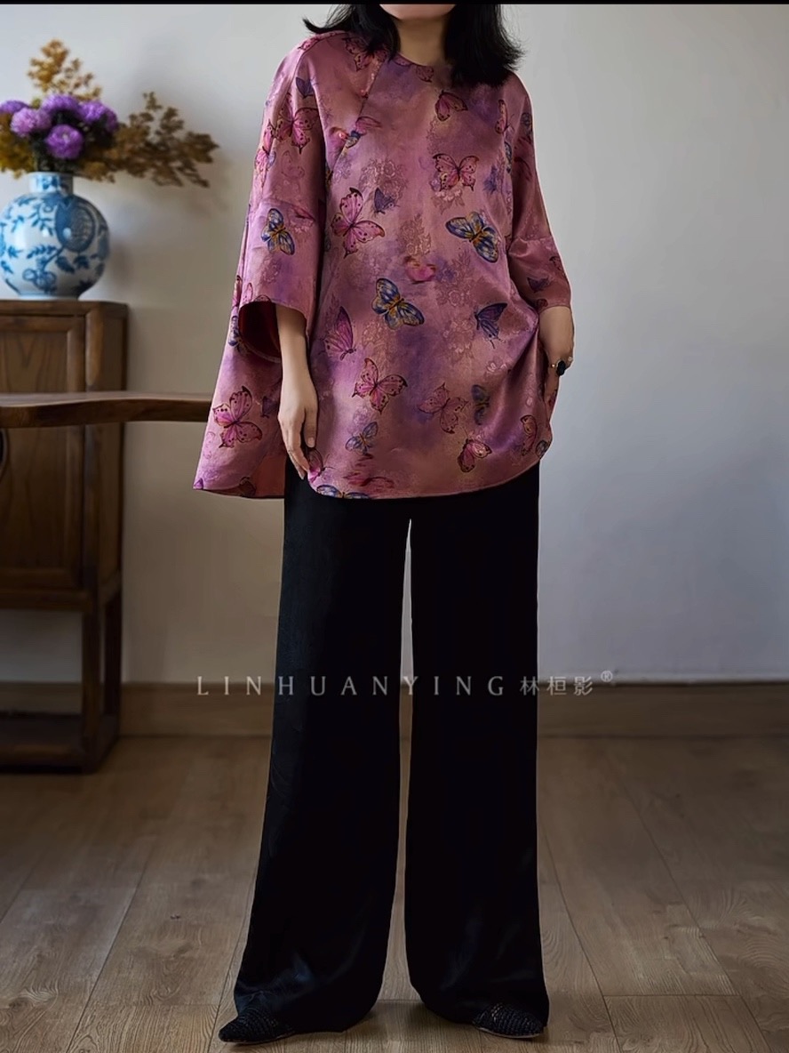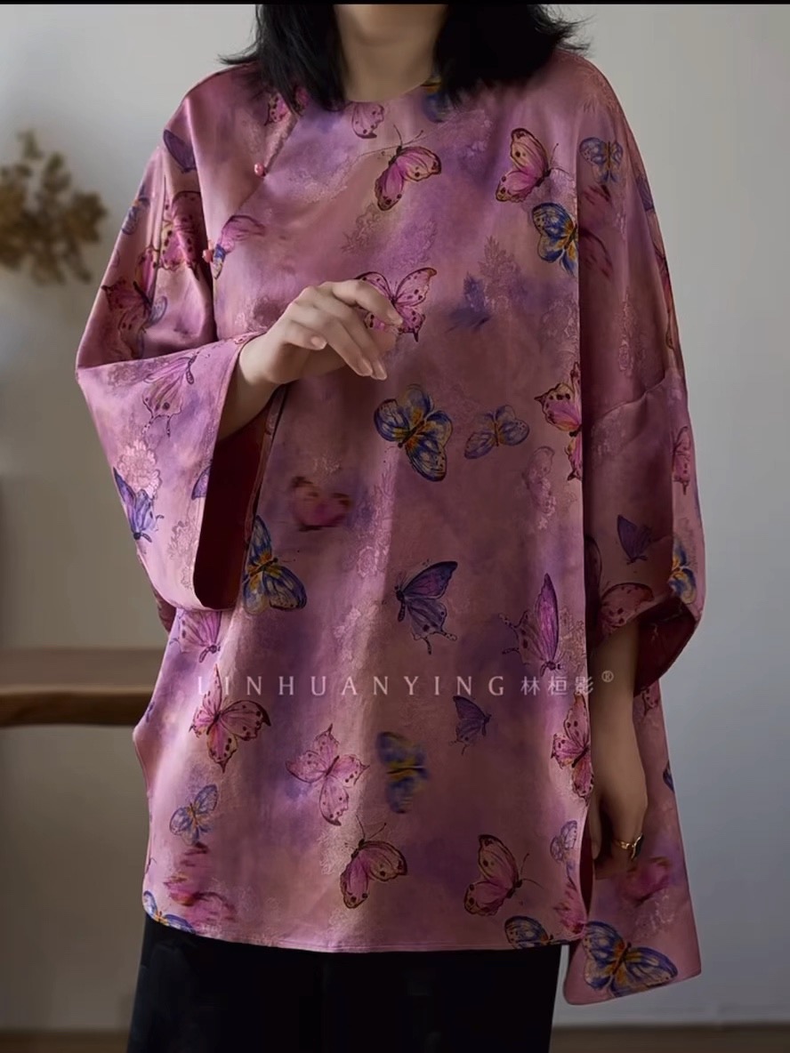 Butterfly Print Loose Fit Blouse, Relaxed New Chinese Style Top for Women