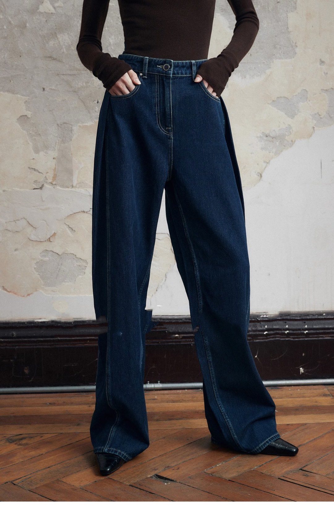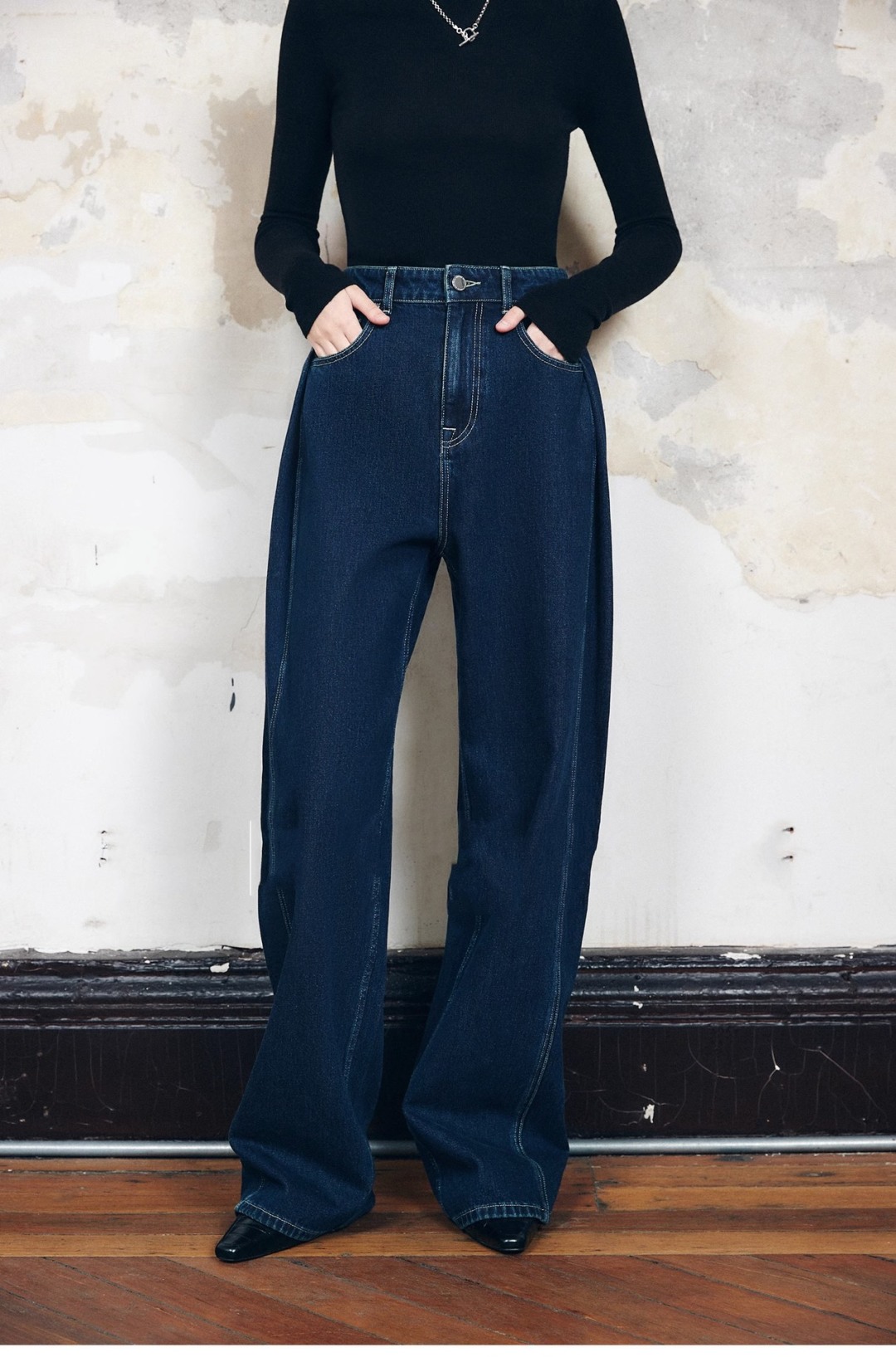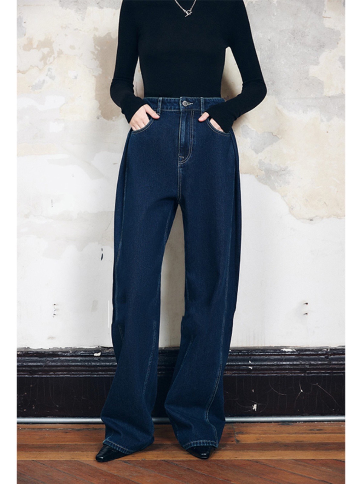 Tags: Comfortable Denim Pants, Dark Blue Wash Jeans, European Cotton Jeans, High Waisted Denim, Relaxed Fit Jeans, Wide Leg Jeans
