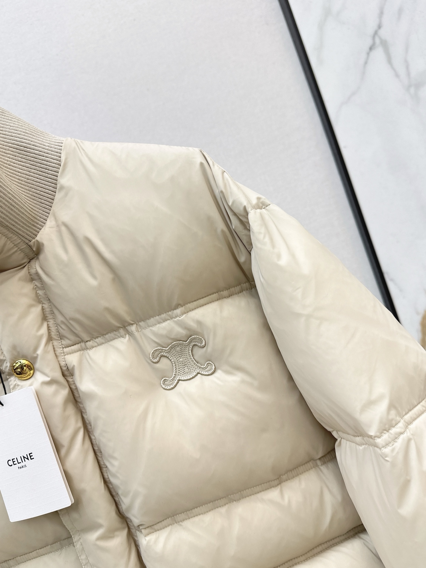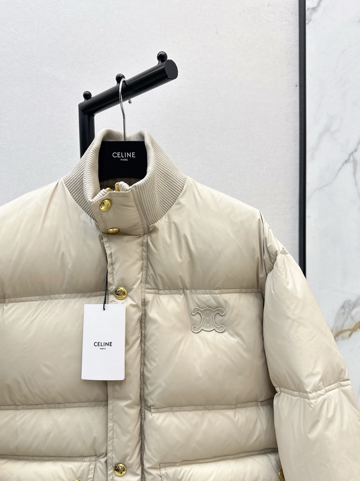 Tags: Celine Down Jacket, High Neck Down Coat, Luxury Outerwear, Patch Pocket Winter Coat, Triomphe Embroidery