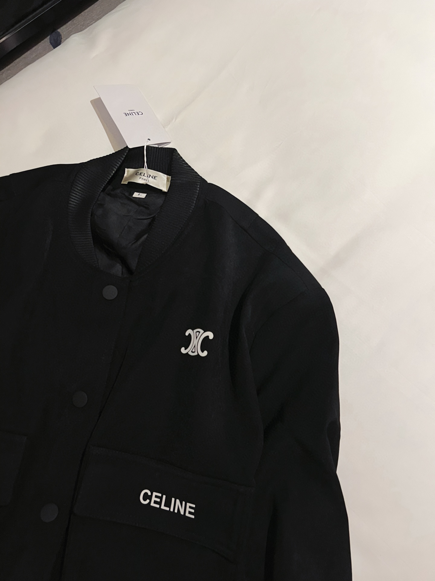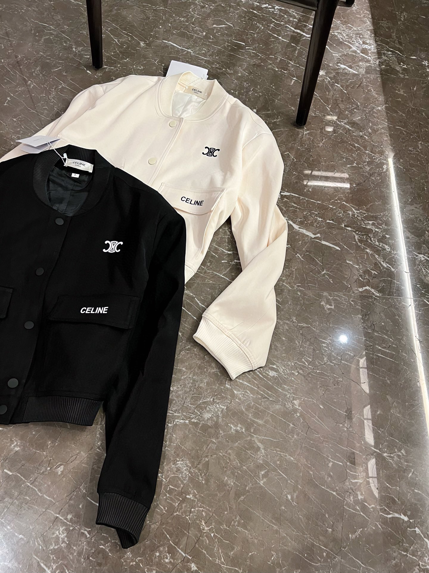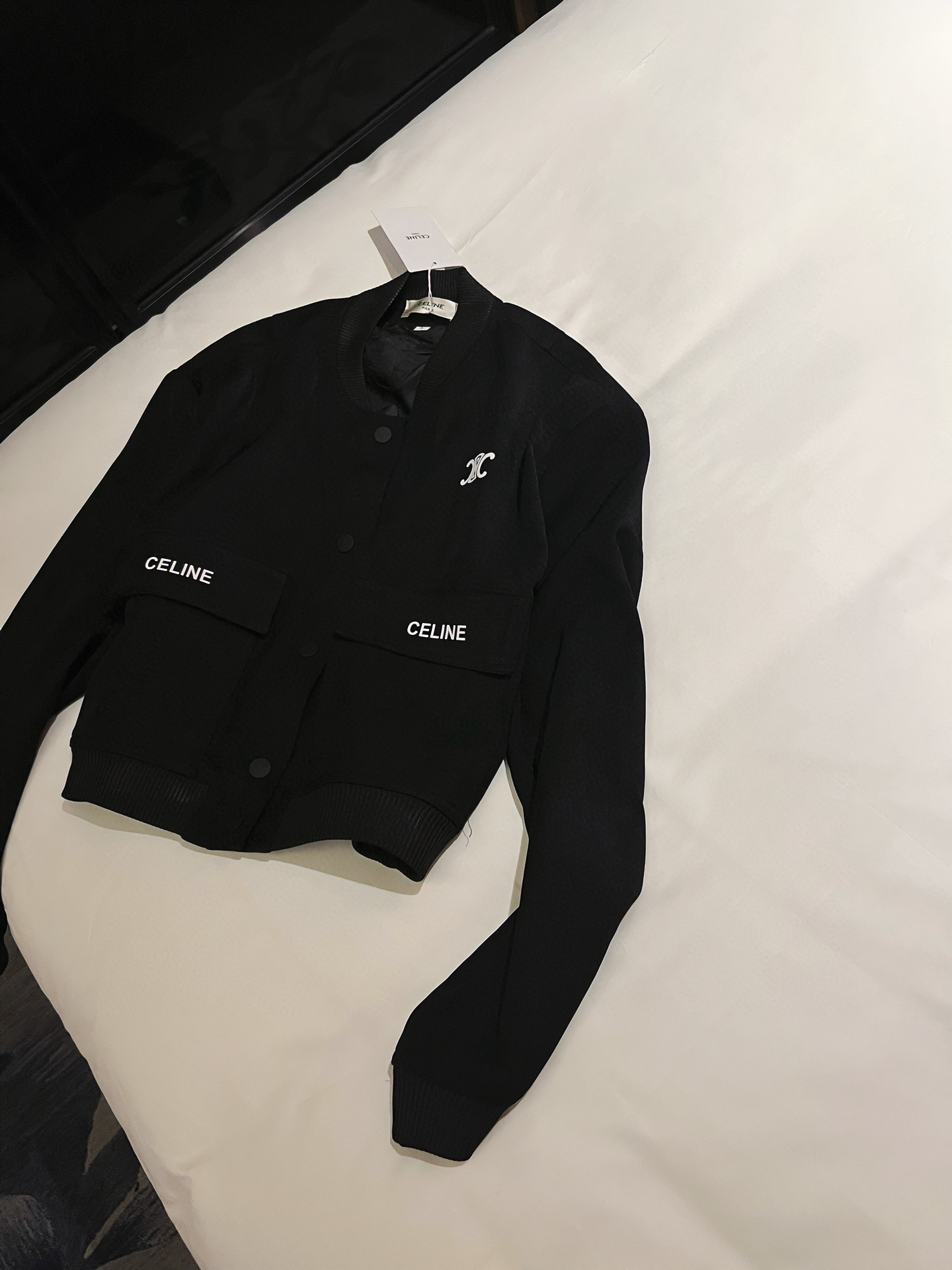 Elevate your style with this Celine printed jacket. A fashionable and versatile piece for any wardrobe. Available in black and white.