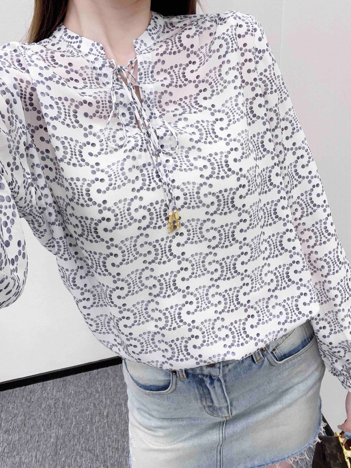 Elevate your style with Celine's printed silk blouse. Features a round neck, long sleeves, and drawstring detail for a chic, comfortable fit.