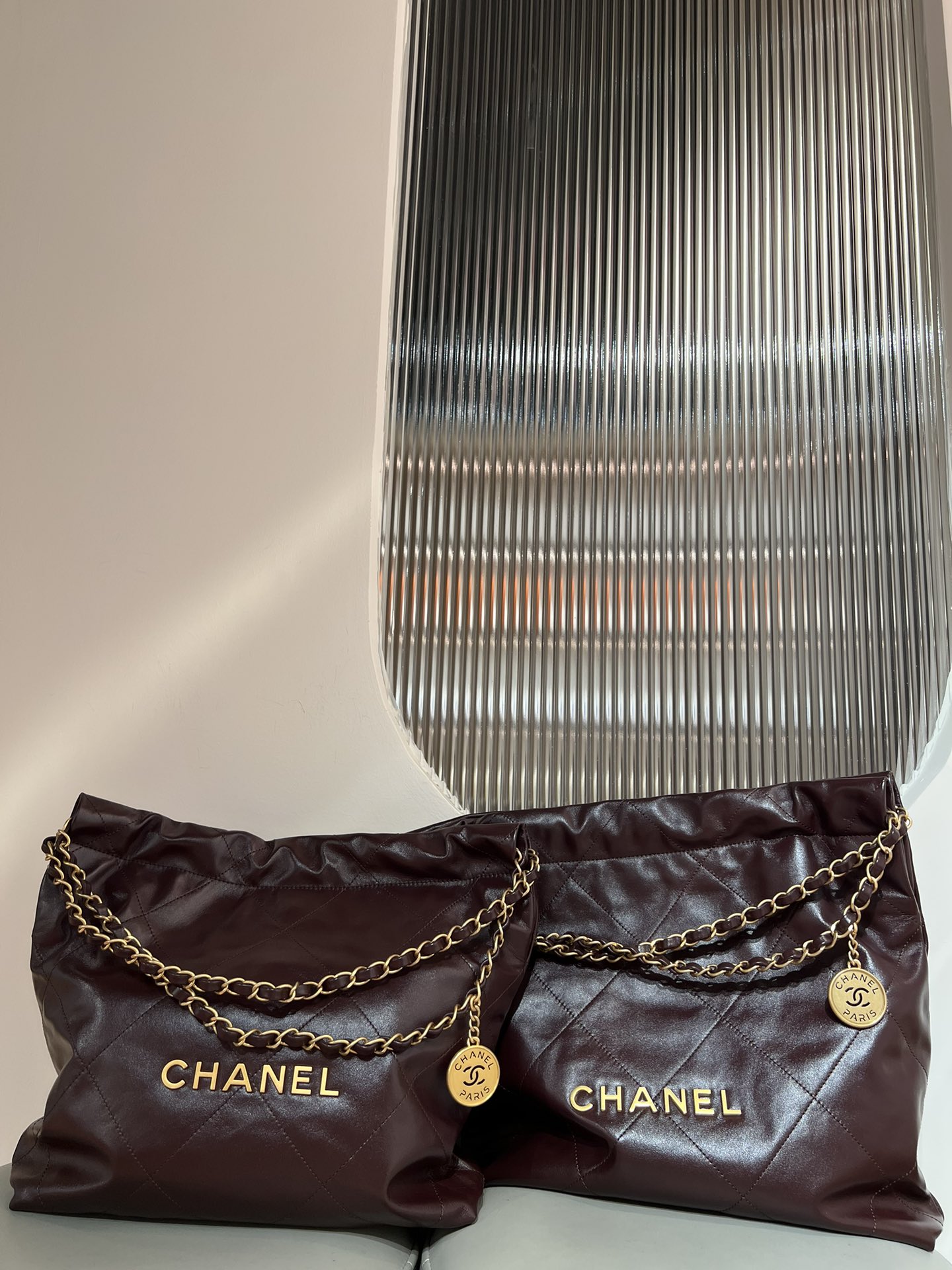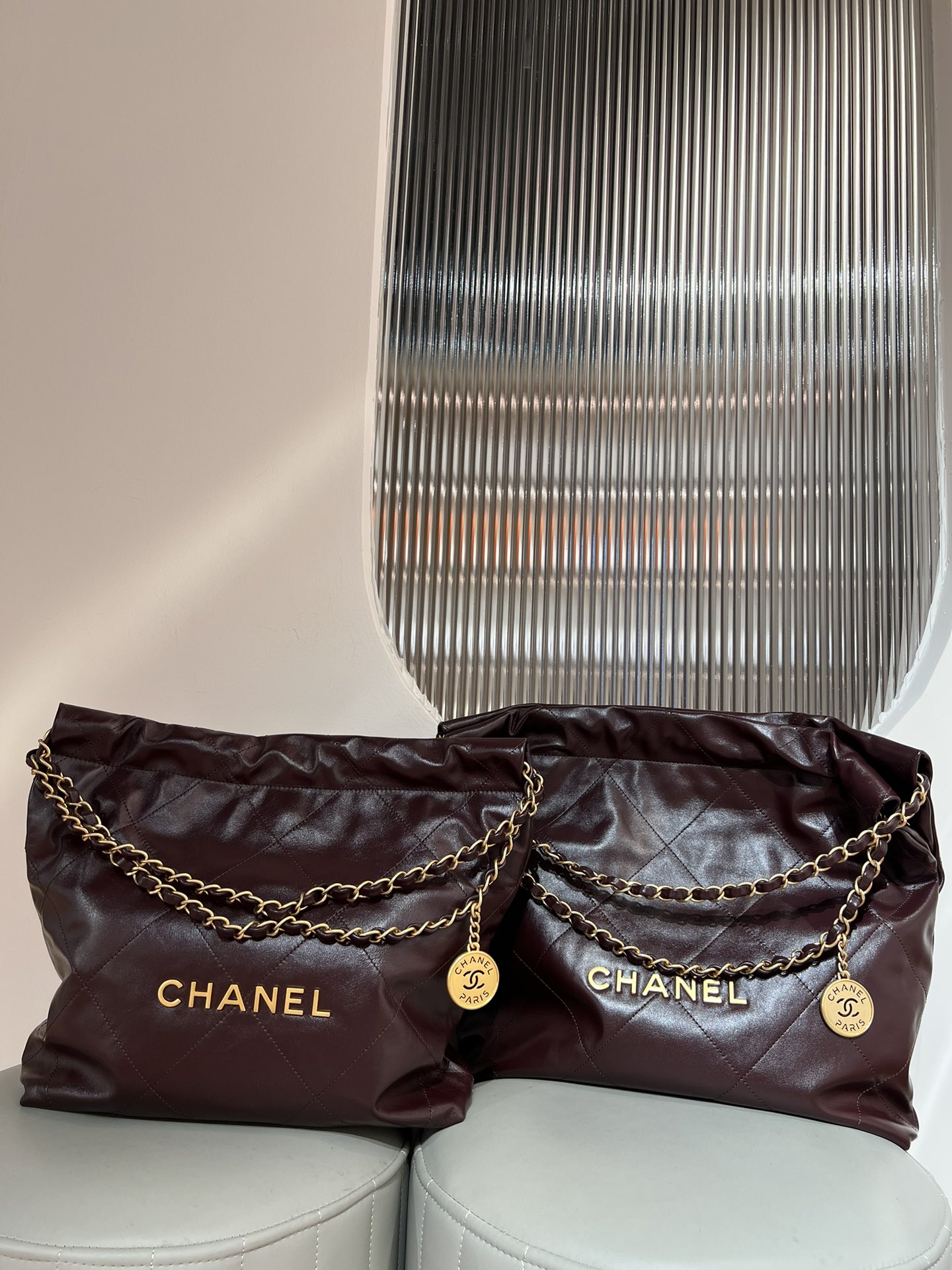 Elevate your style with the Chanel 22 Bag. Crafted from luxurious burgundy leather, featuring gold hardware and a chic chain.