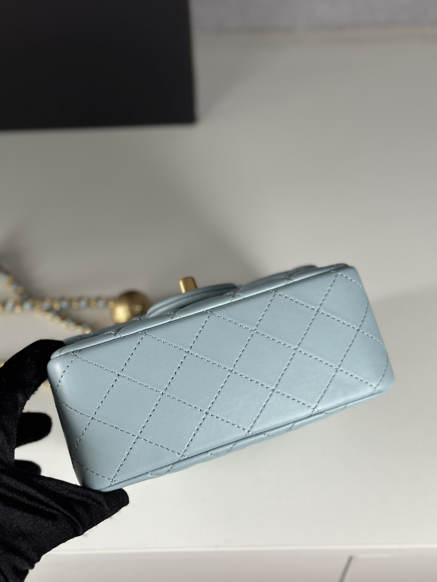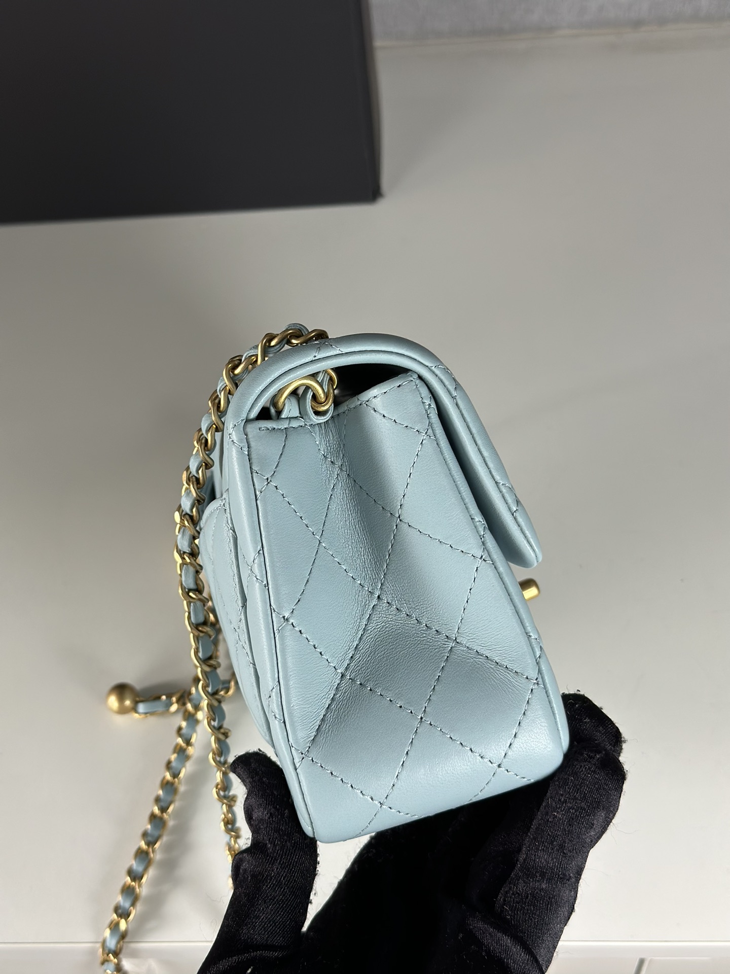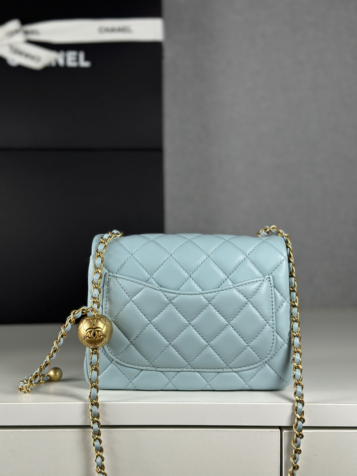 Tags: Adjustable Chain Bag, Chanel Flap Bag, Designer Handbag, Gold Ball Bag, Light Blue Chanel Bag, Quilted Leather Bag