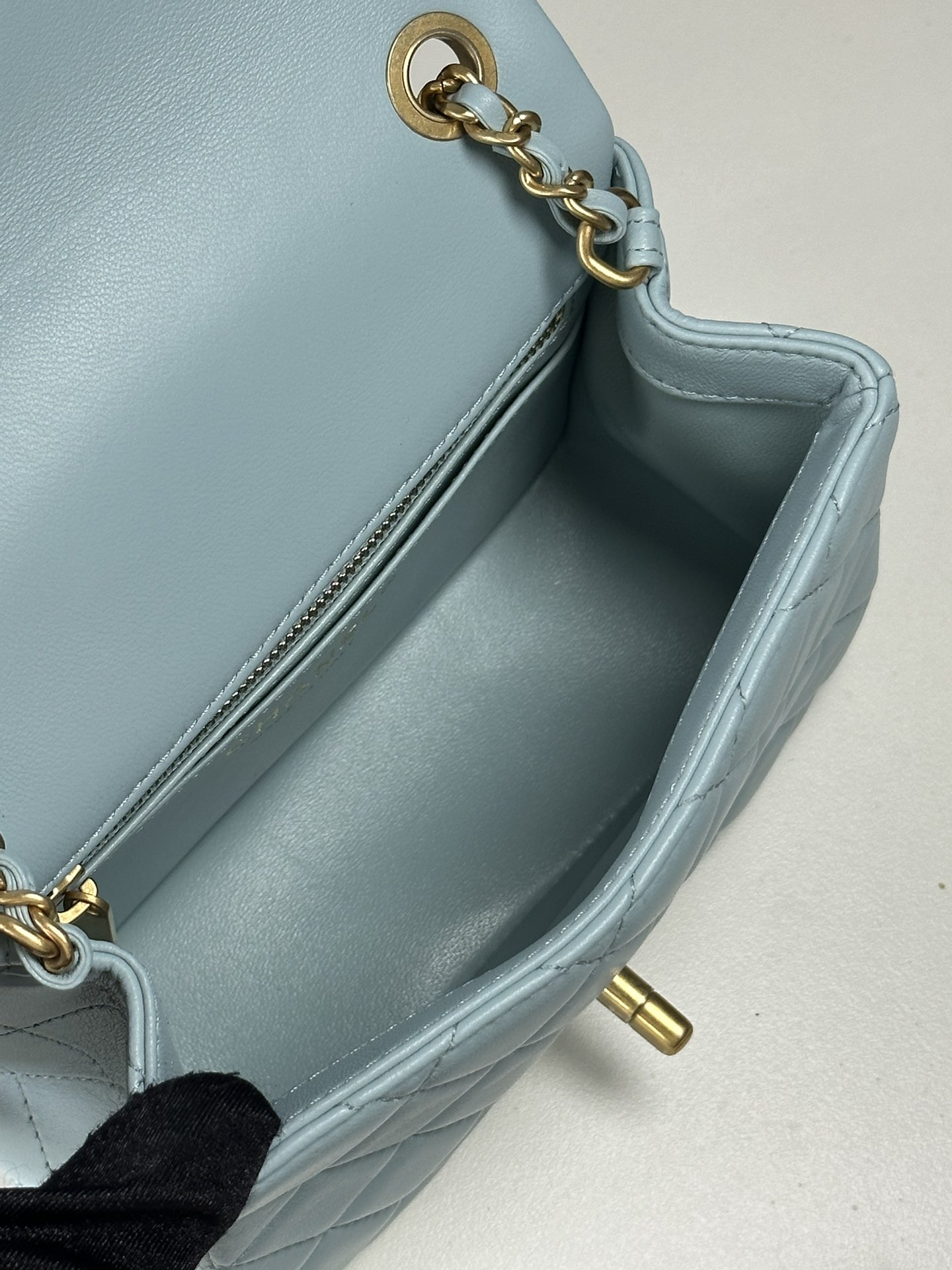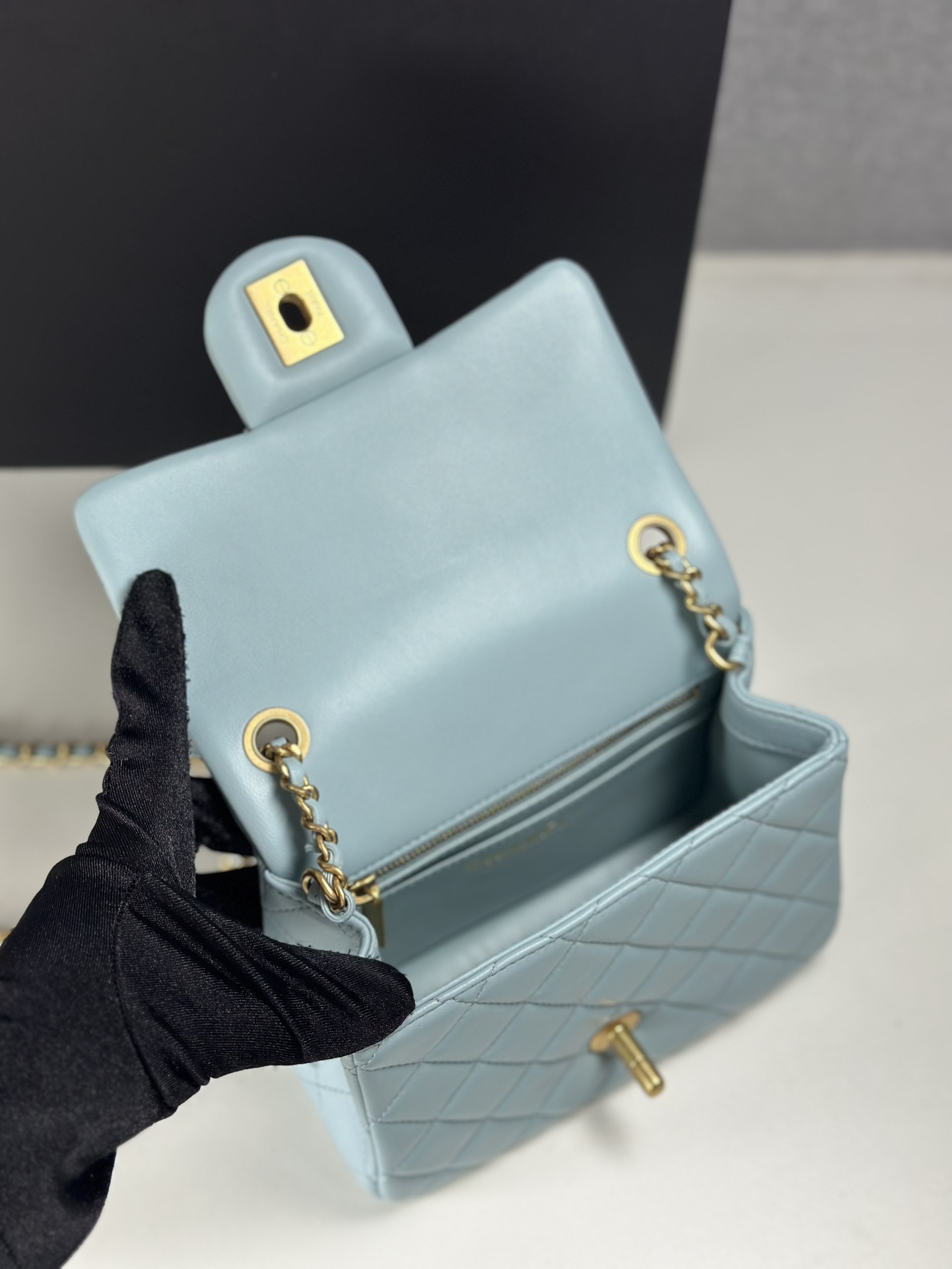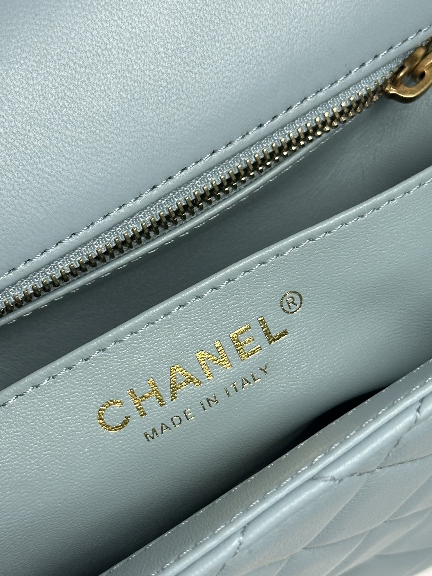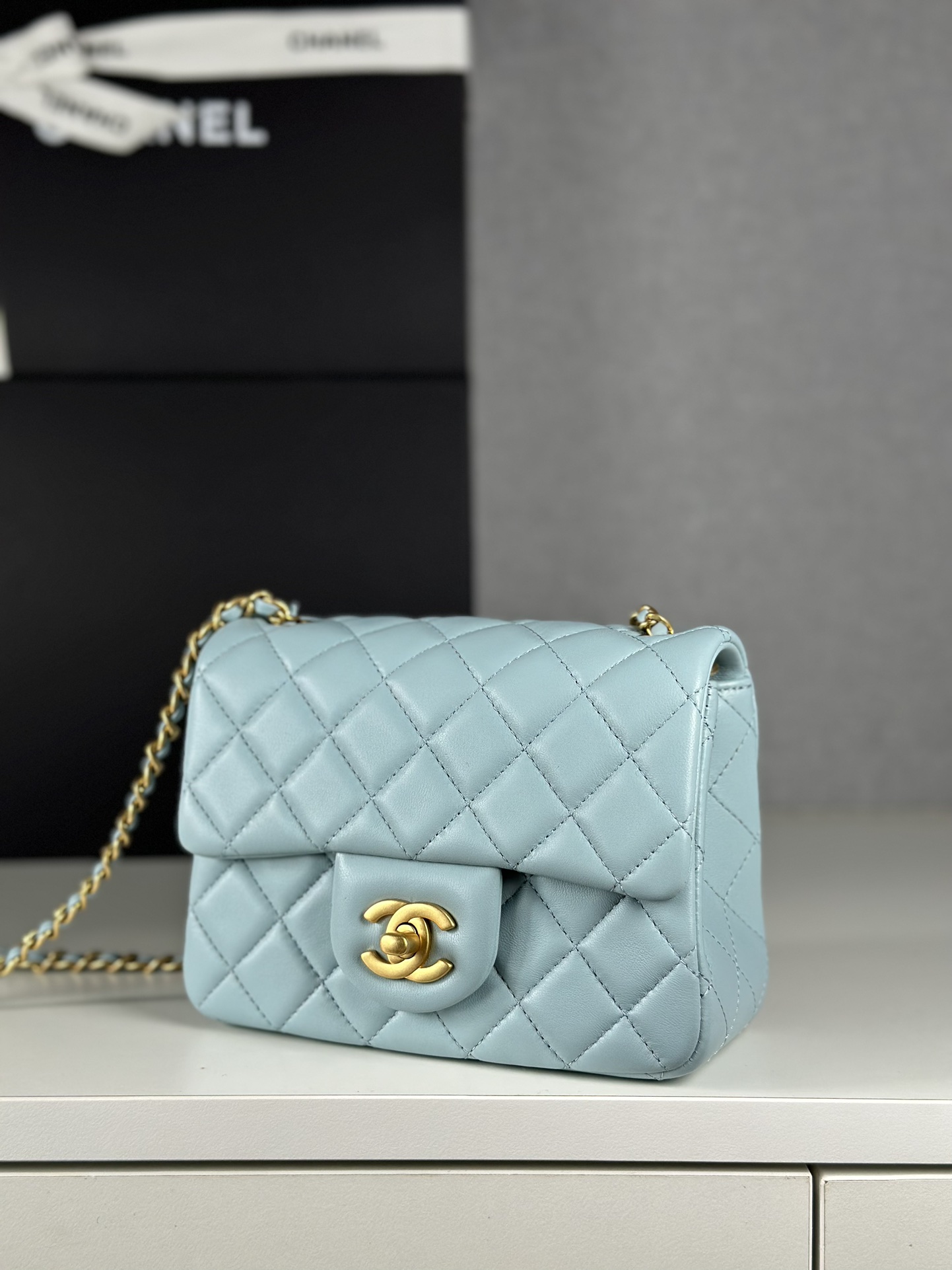 Tags: Adjustable Chain Bag, Chanel Flap Bag, Designer Handbag, Gold Ball Bag, Light Blue Chanel Bag, Quilted Leather Bag