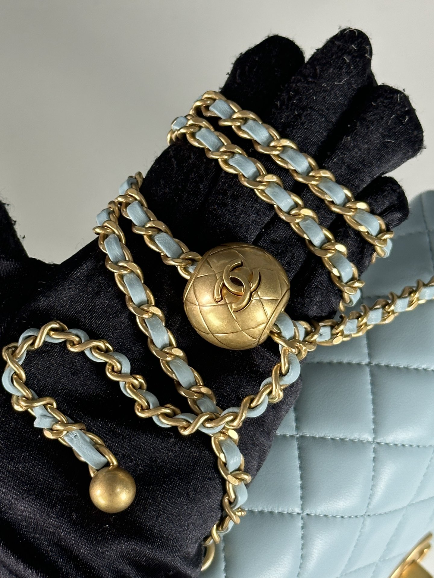 Chanel 24K Gold Ball Flap Bag, Light Blue Quilted Leather, Adjustable Chain