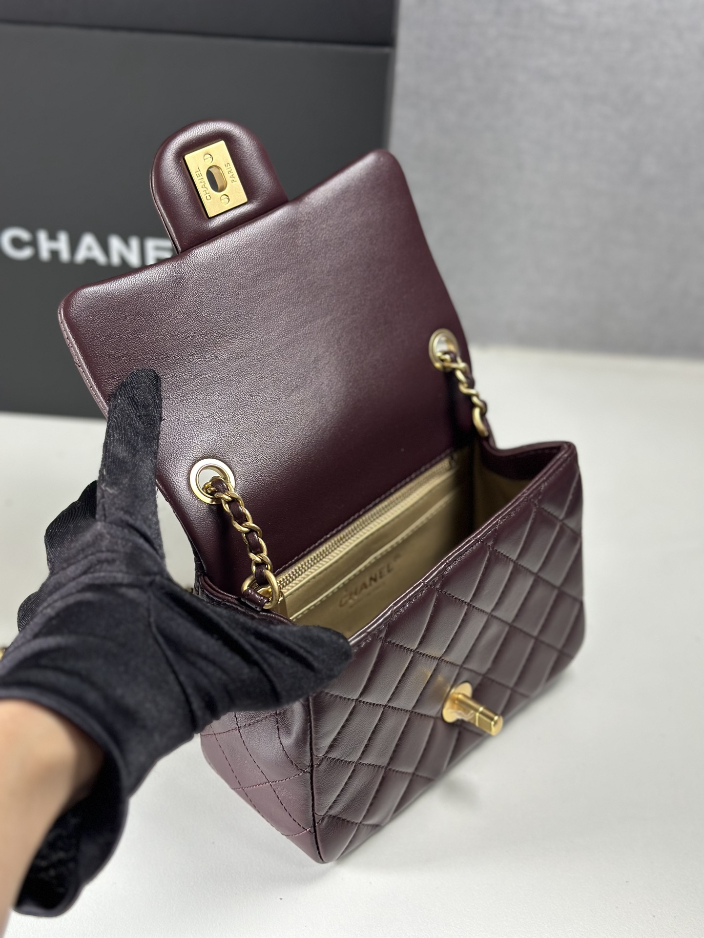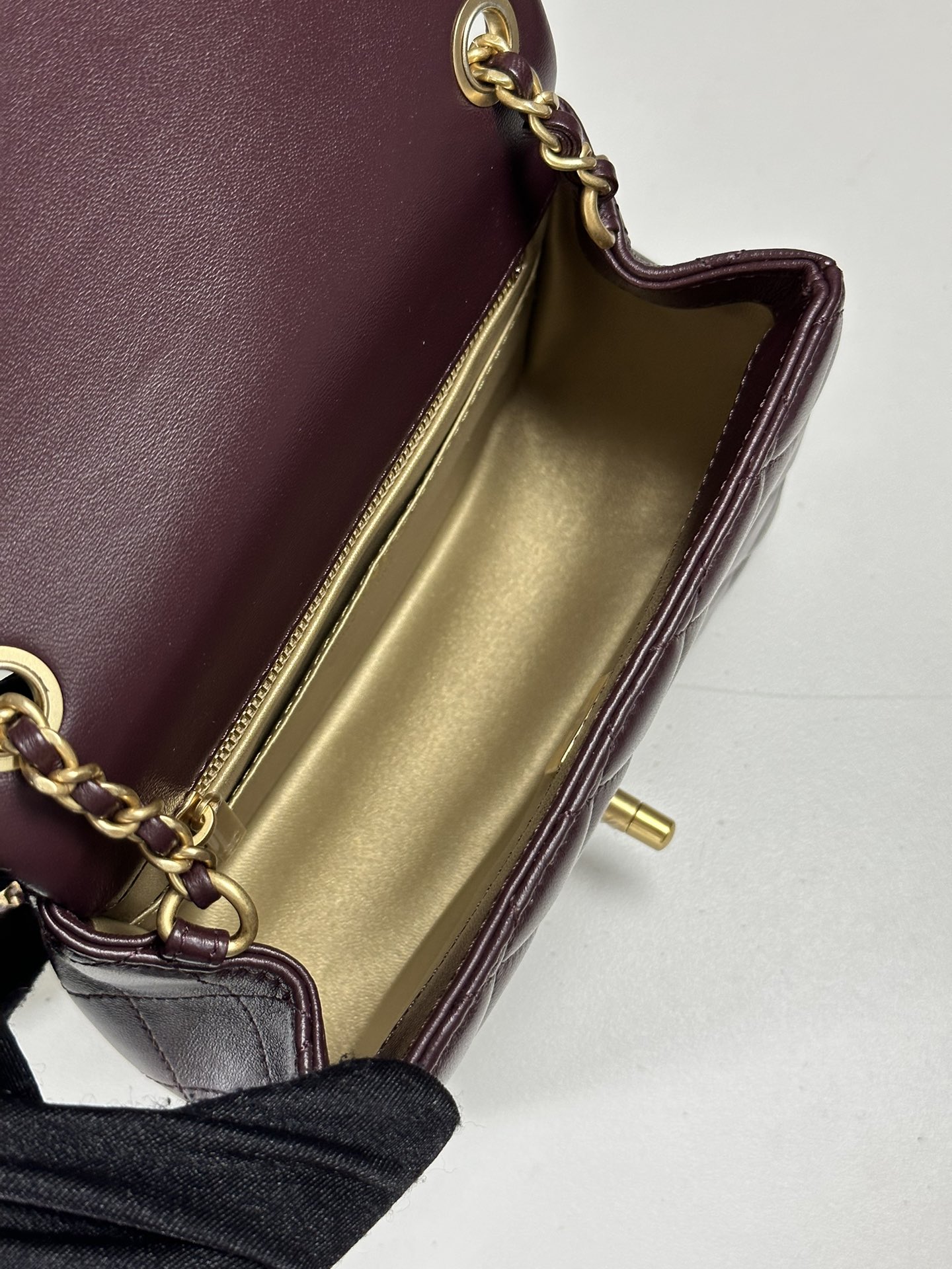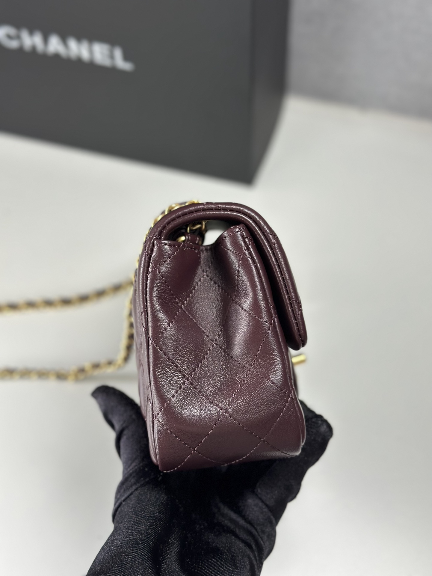 I was hesitant to purchase this bag online, but I'm so glad I did! It's exactly as described, and the packaging was impeccable. The burgundy leather is so soft and luxurious, and the golden hardware is just stunning.