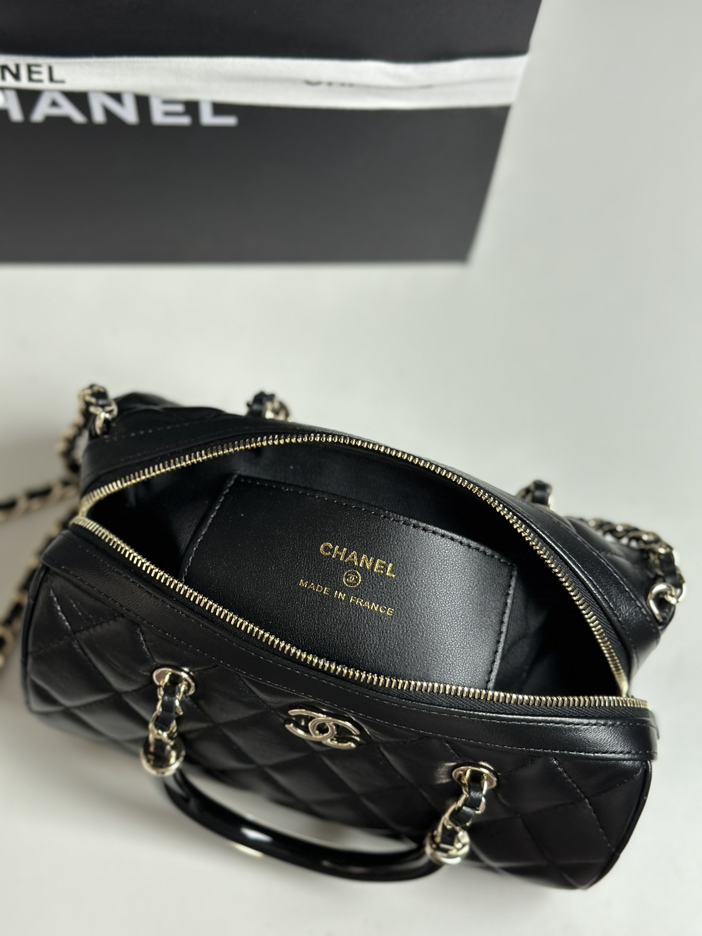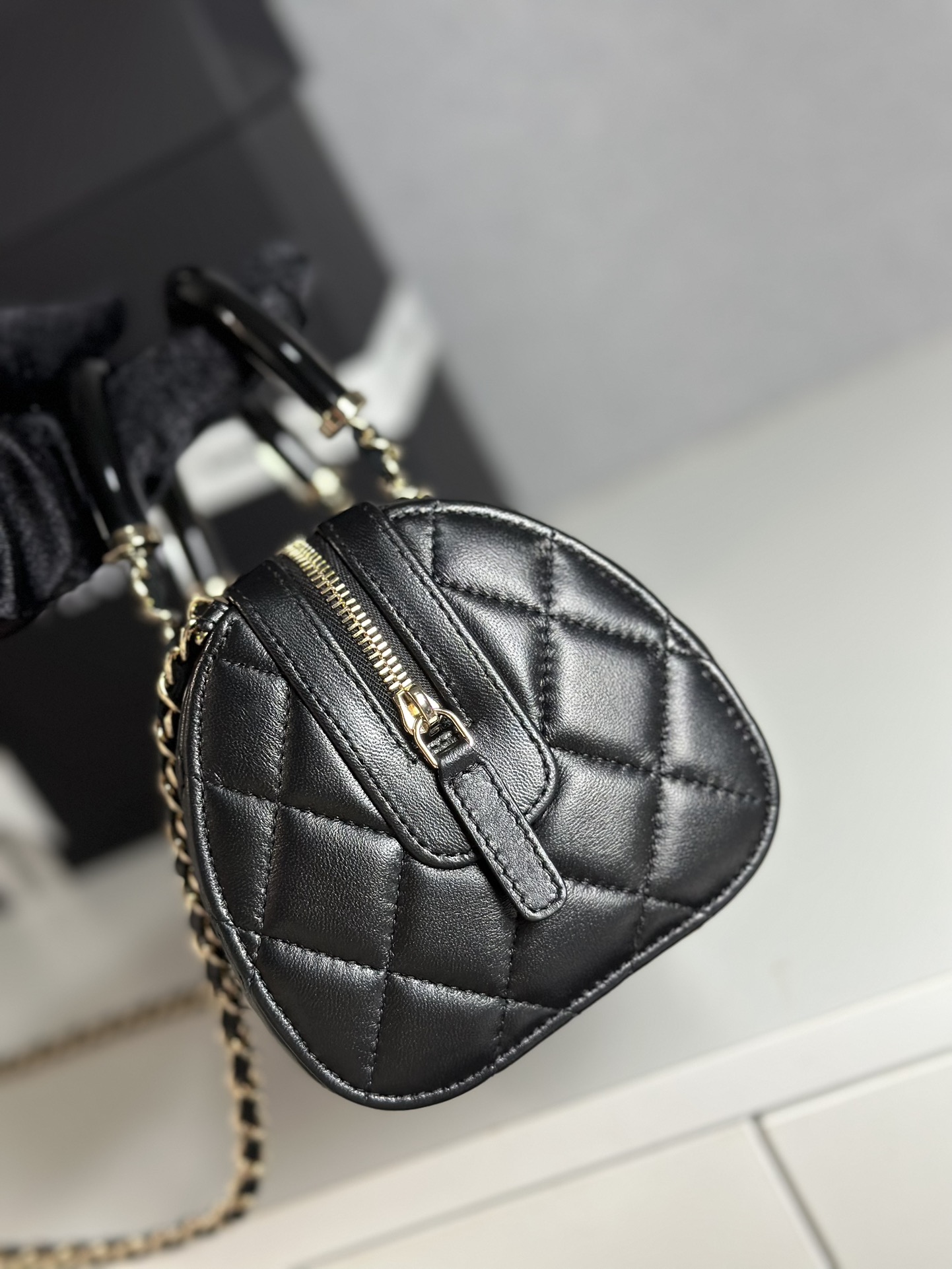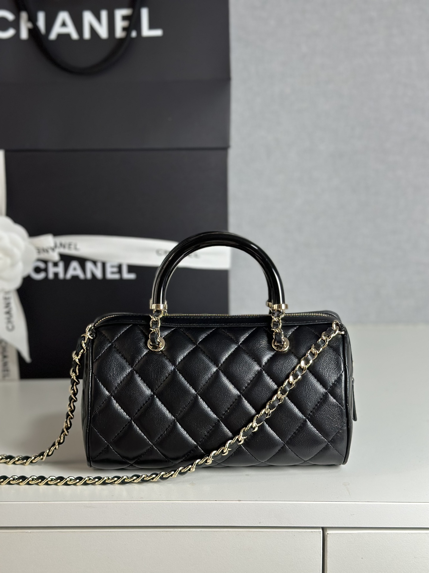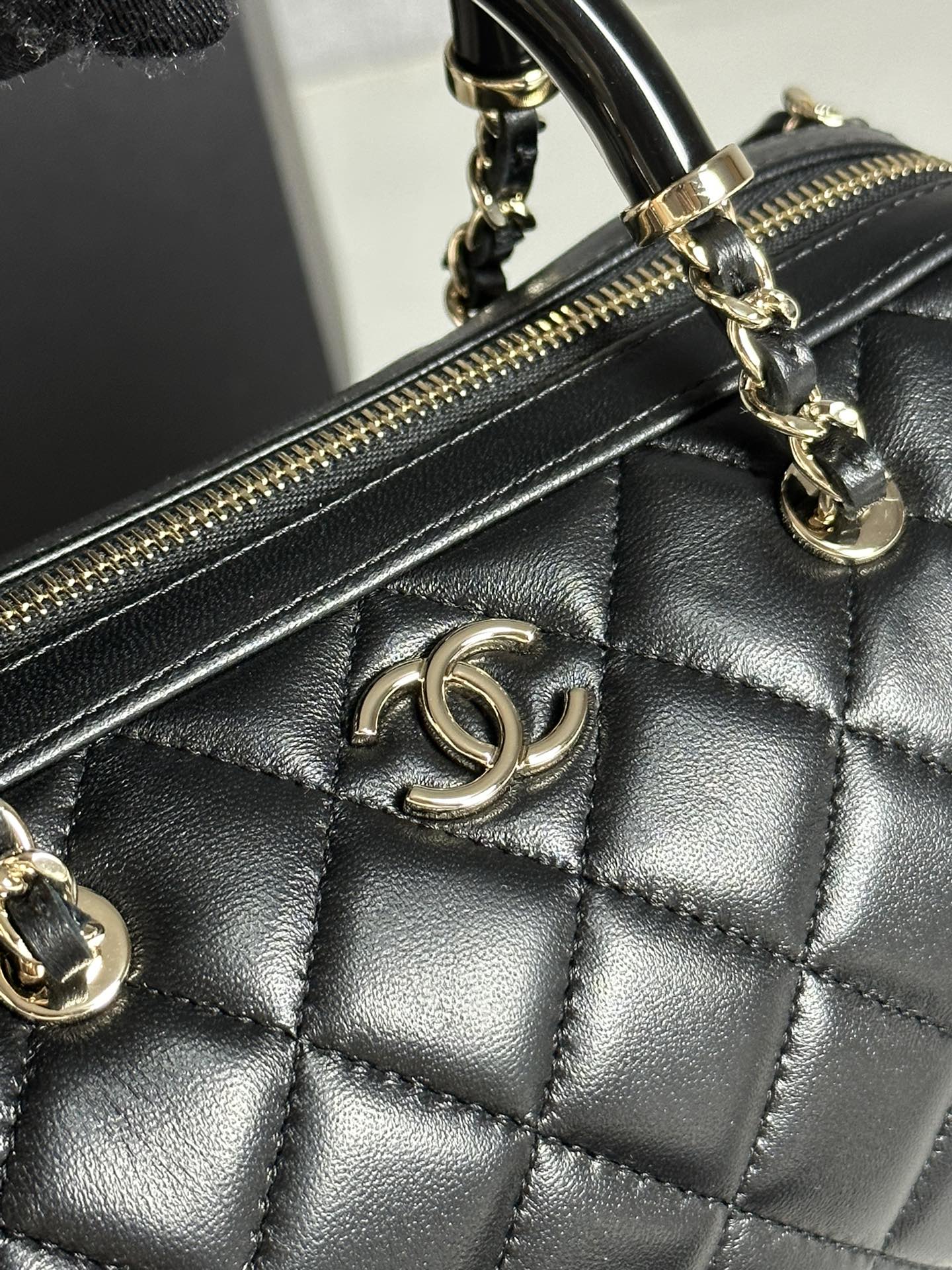 This Chanel mini bowling bag features a resin handle, lambskin leather, and gold-tone hardware. Perfect for carrying your essentials in style.