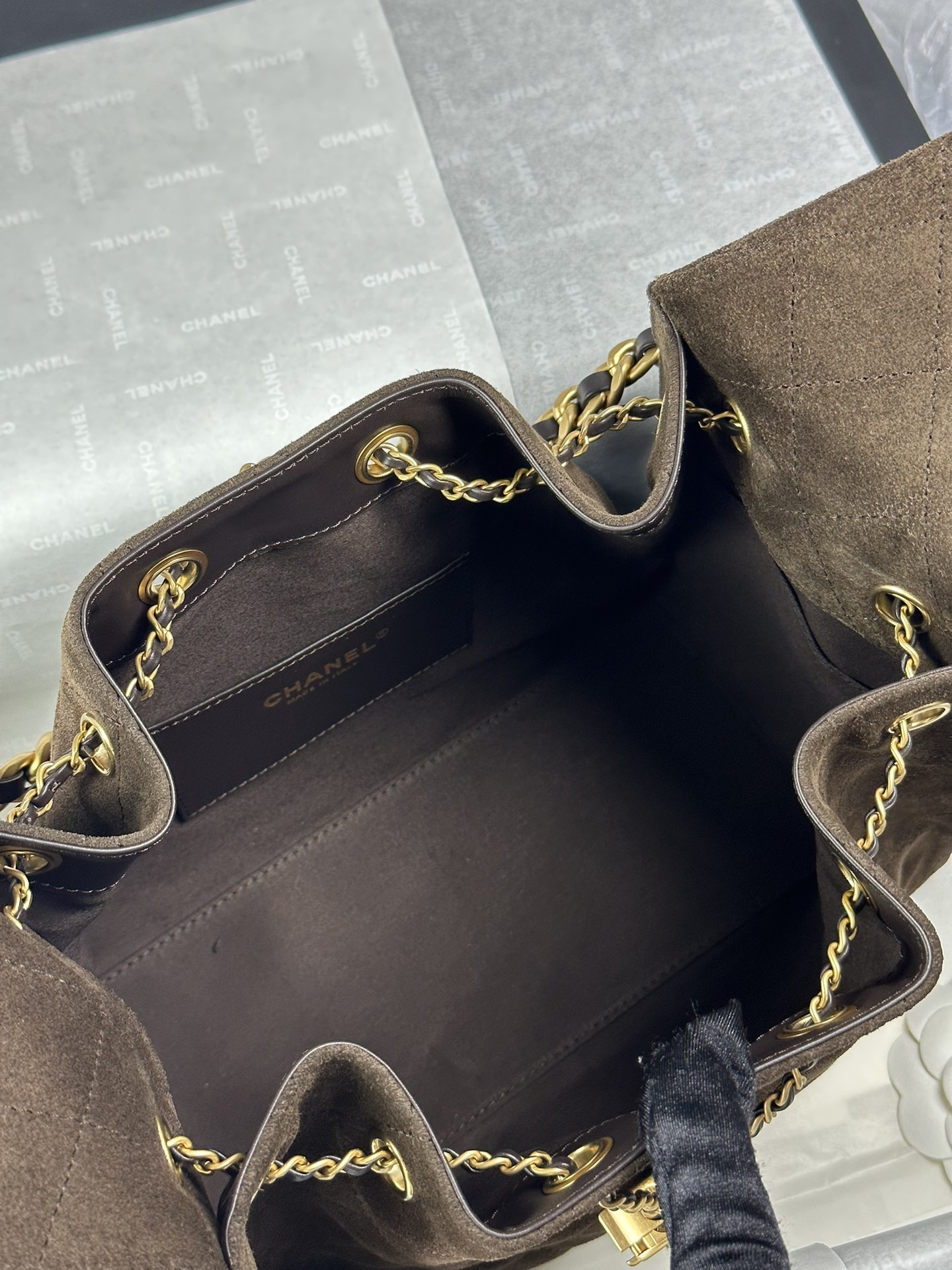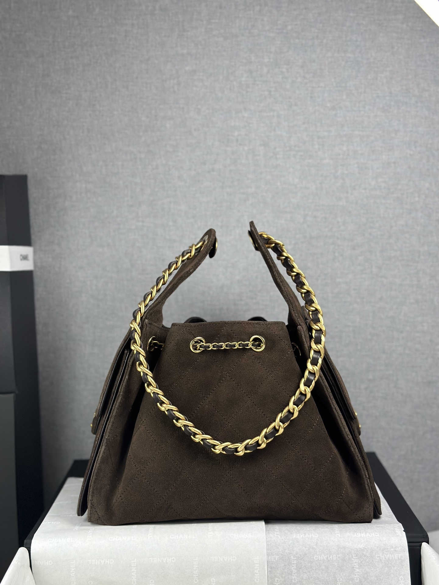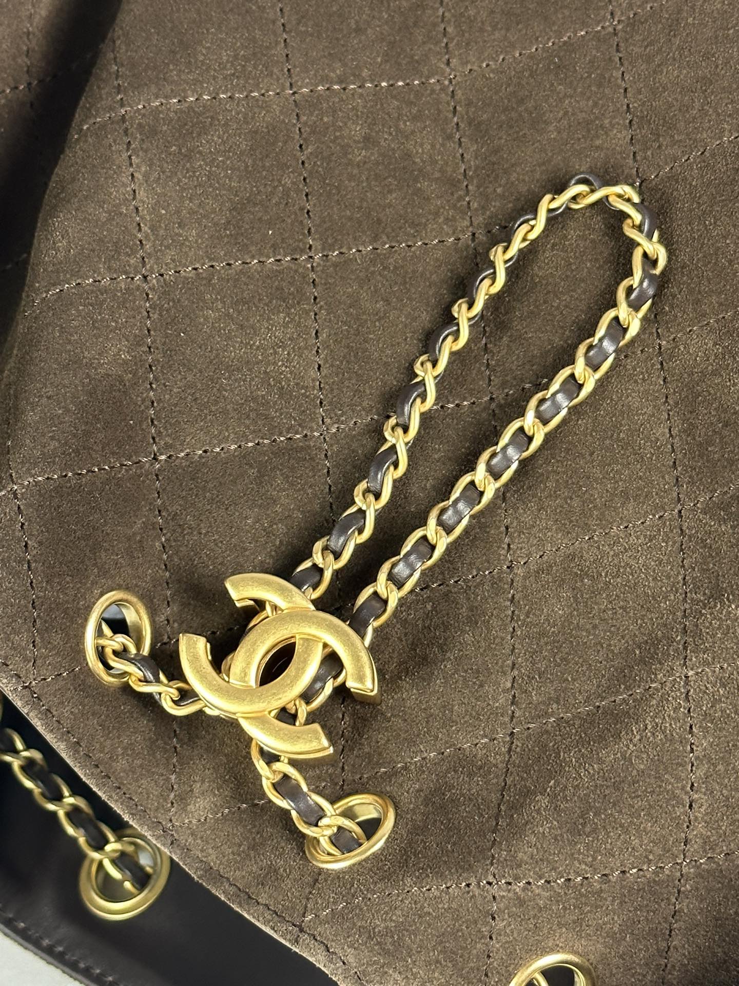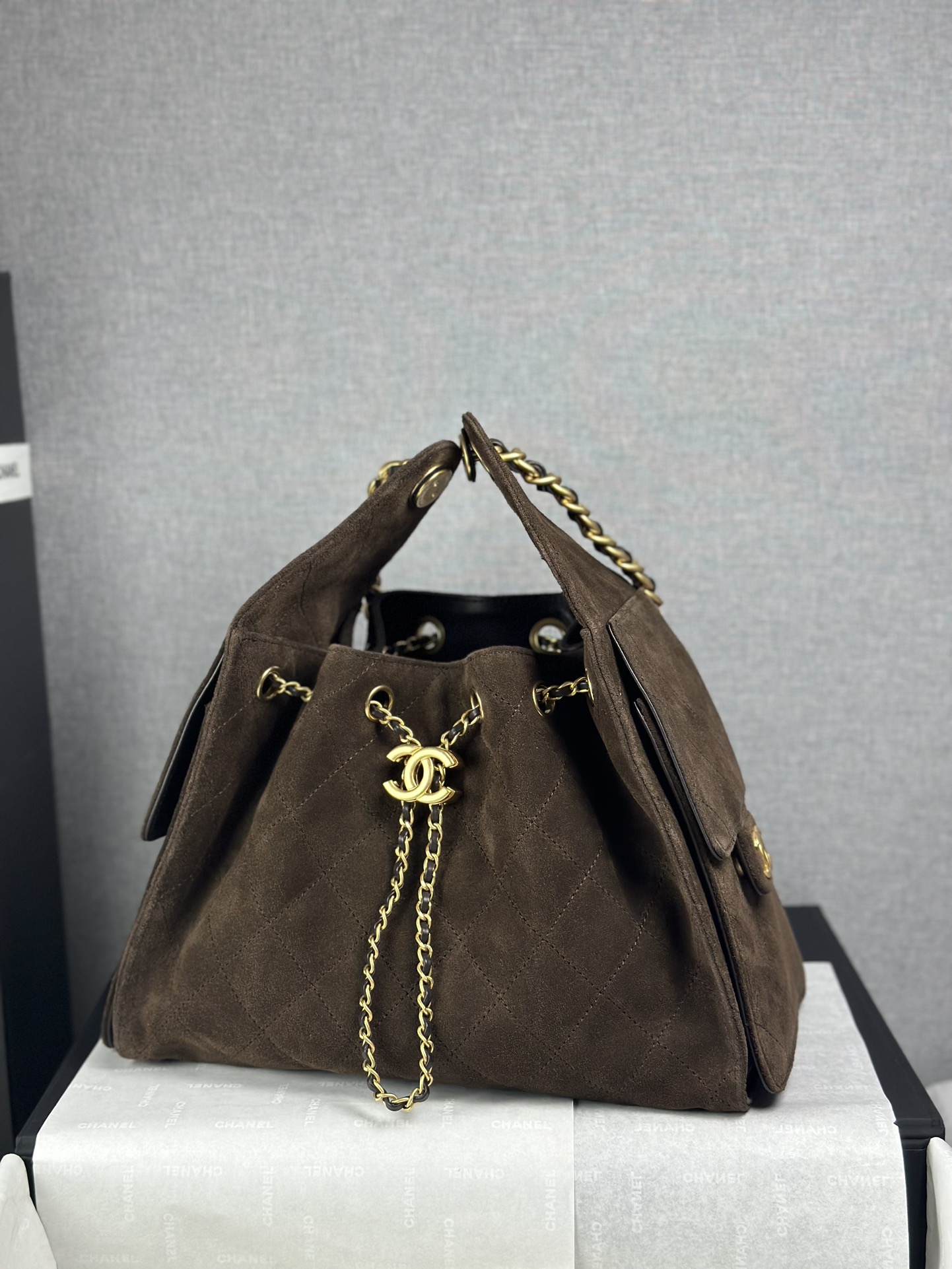The Chanel 25K hobo bag features soft suede, a drawstring closure, and a spacious interior. Perfect for adding a touch of luxury to your everyday style.