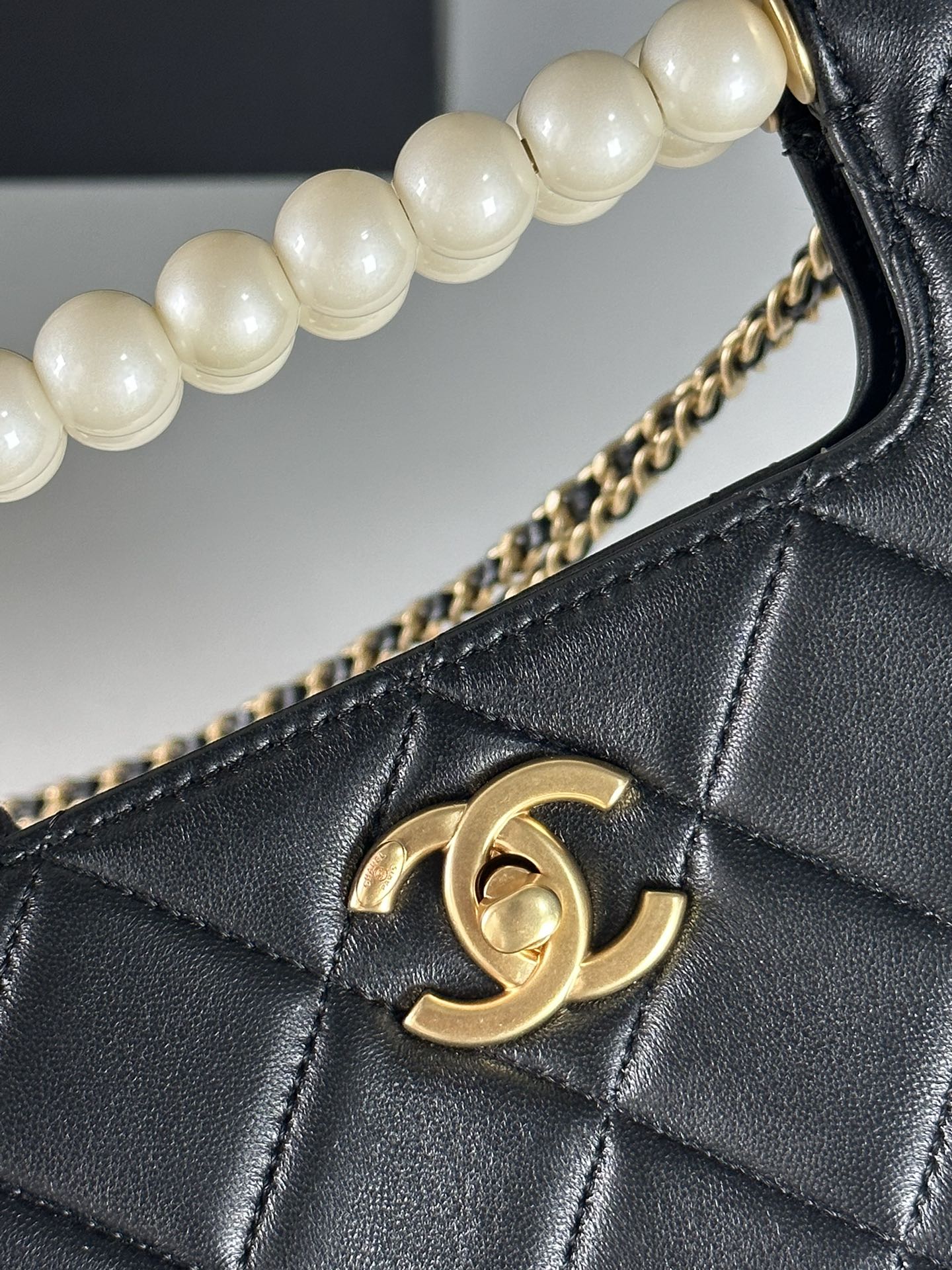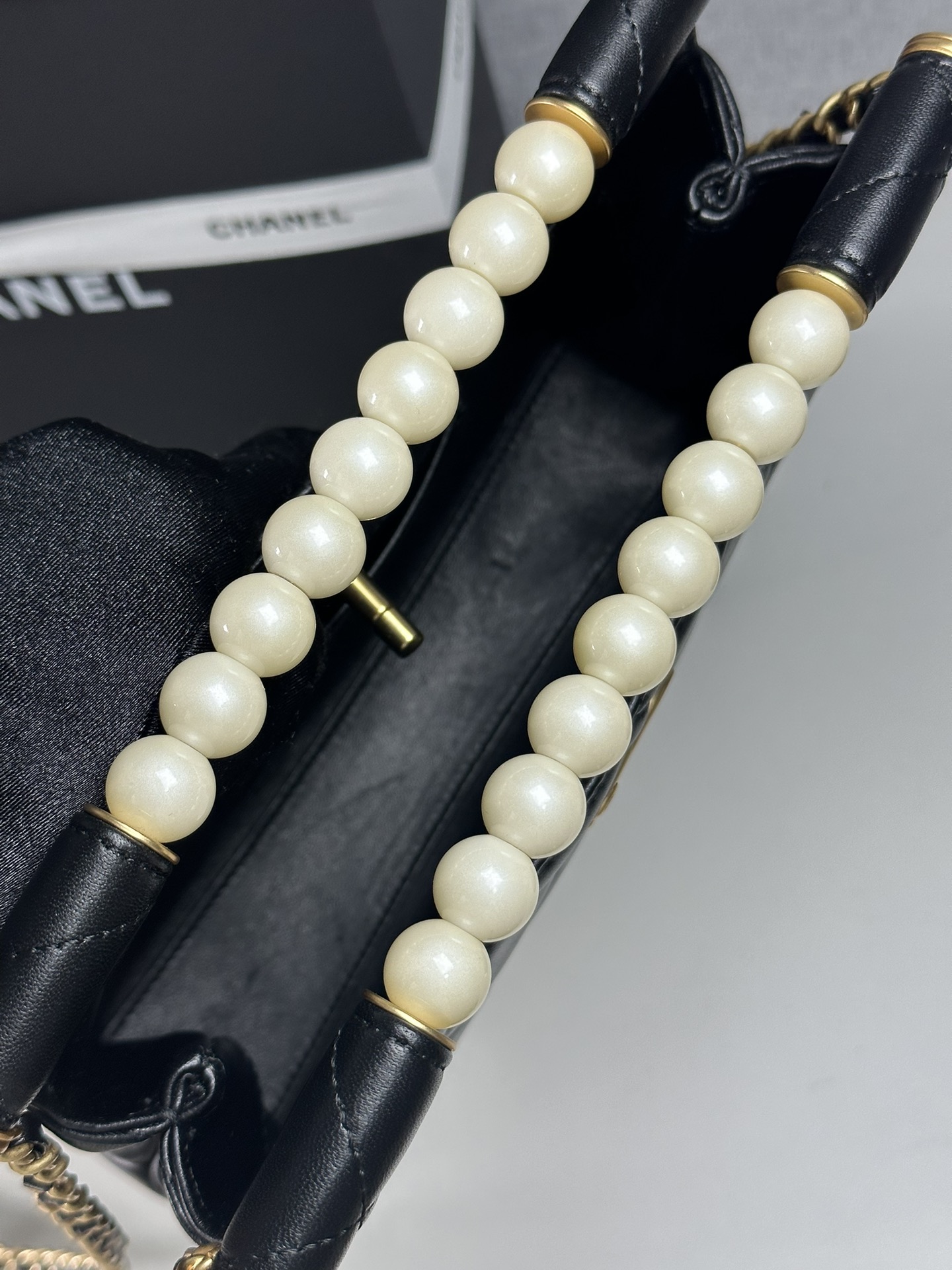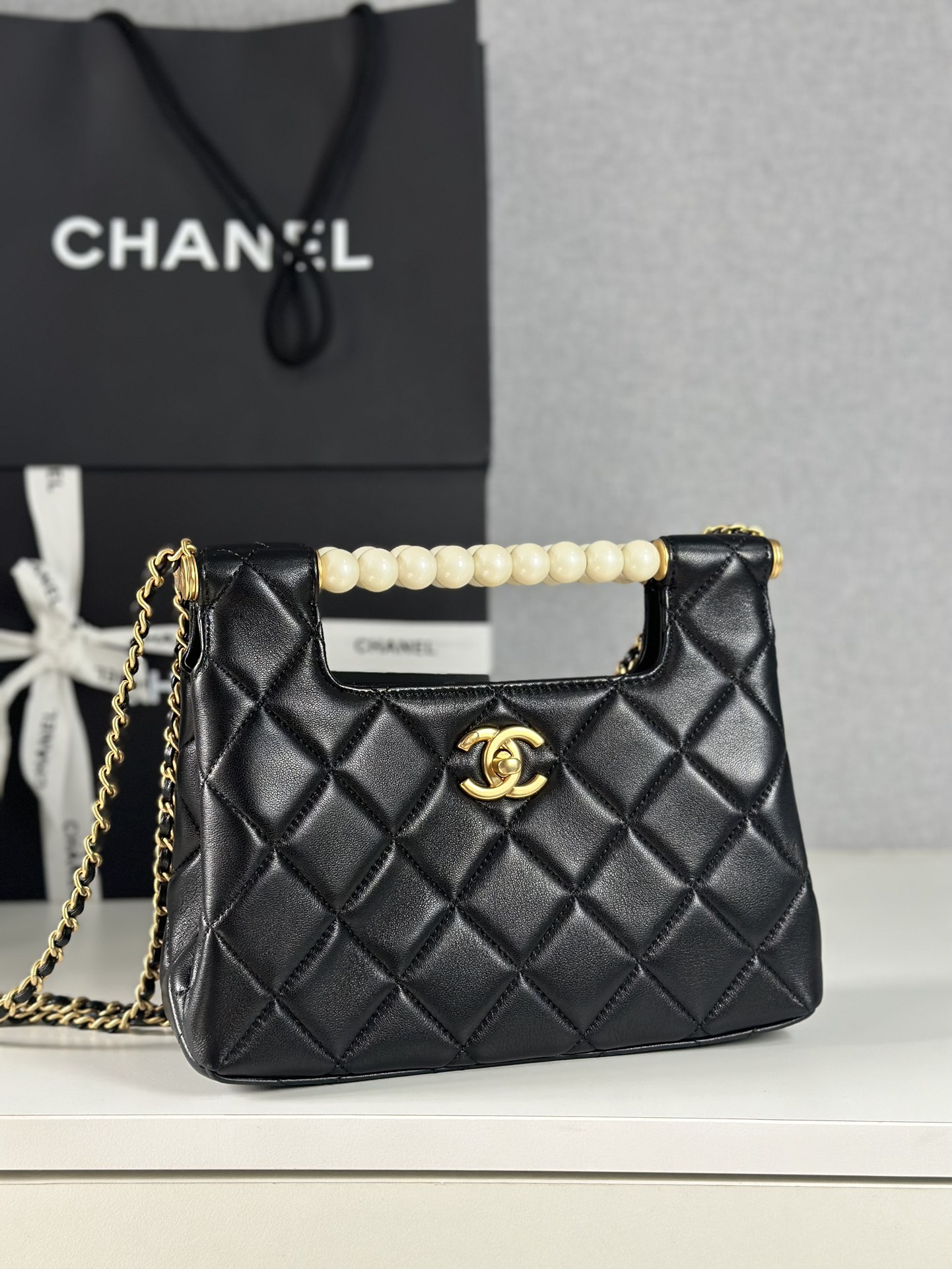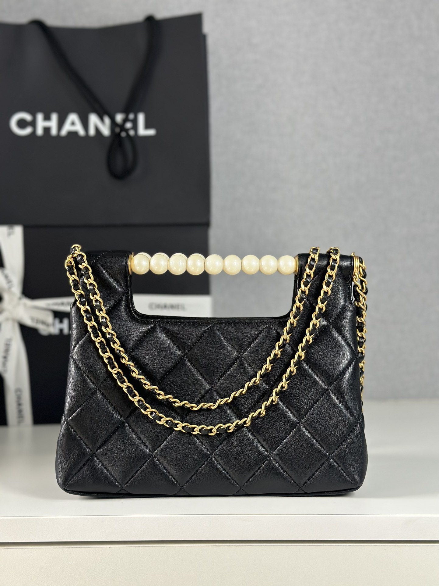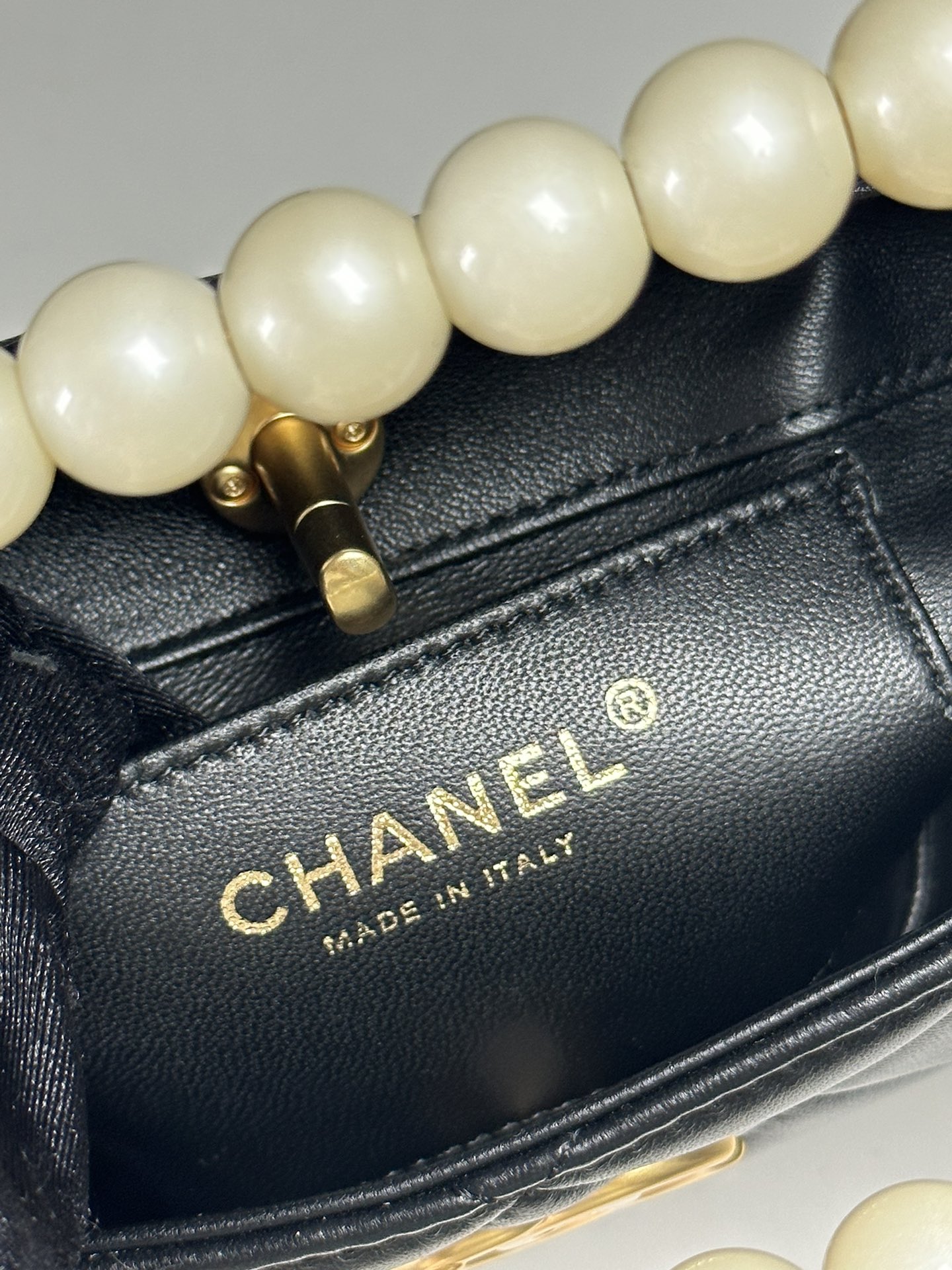 Elevate your style with this Chanel pearl handle flap bag. Crafted from luxurious lambskin, it features gold hardware and a unique pearl handle design.