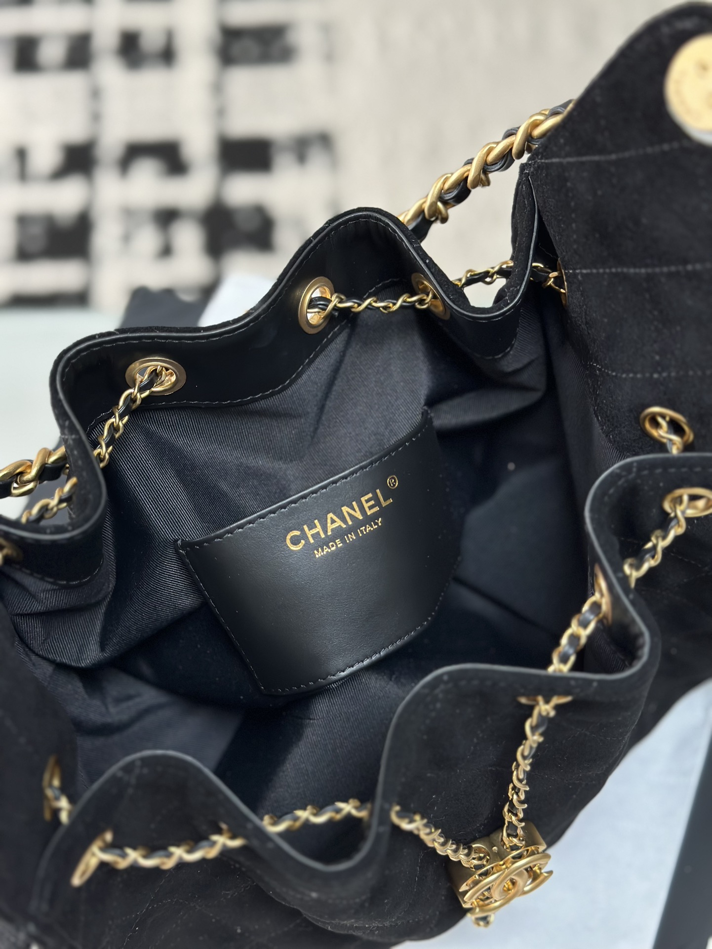 The Chanel 25S Bucket Bag is crafted from soft suede with a drawstring closure, perfect for everyday or travel.
