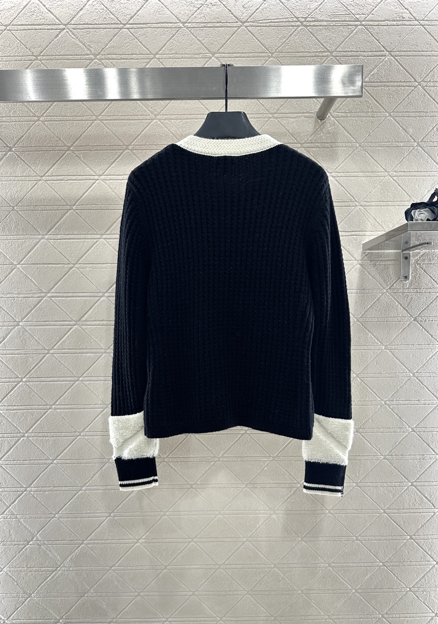 - Black and white color block trim on collar and cuffs.