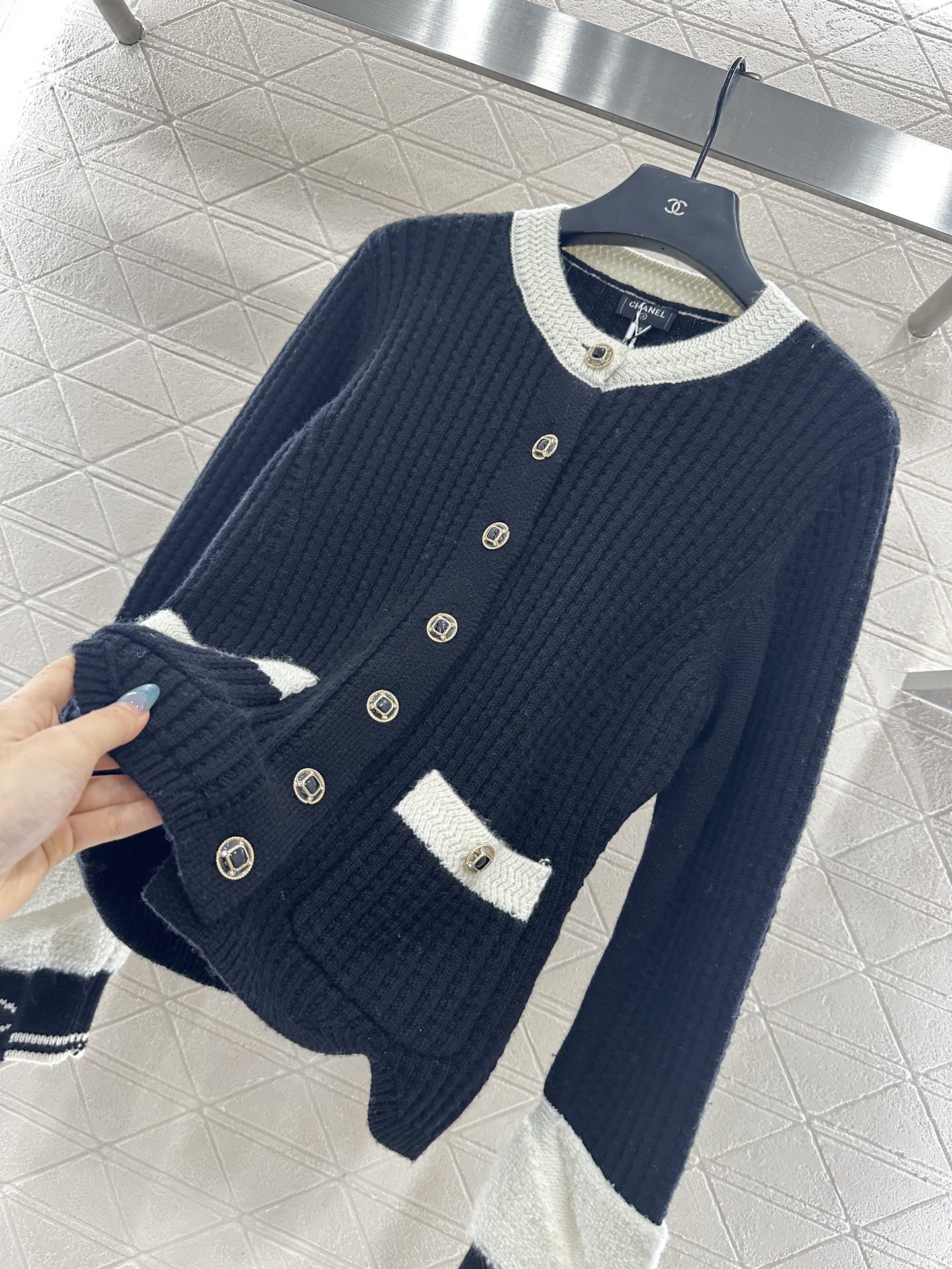 This Chanel 2025 knit cardigan from the Coco Ski collection is a luxurious and stylish addition to any wardrobe. Crafted from custom YB wool yarn, this cardigan offers a soft, skin-friendly texture and a radiant sheen.