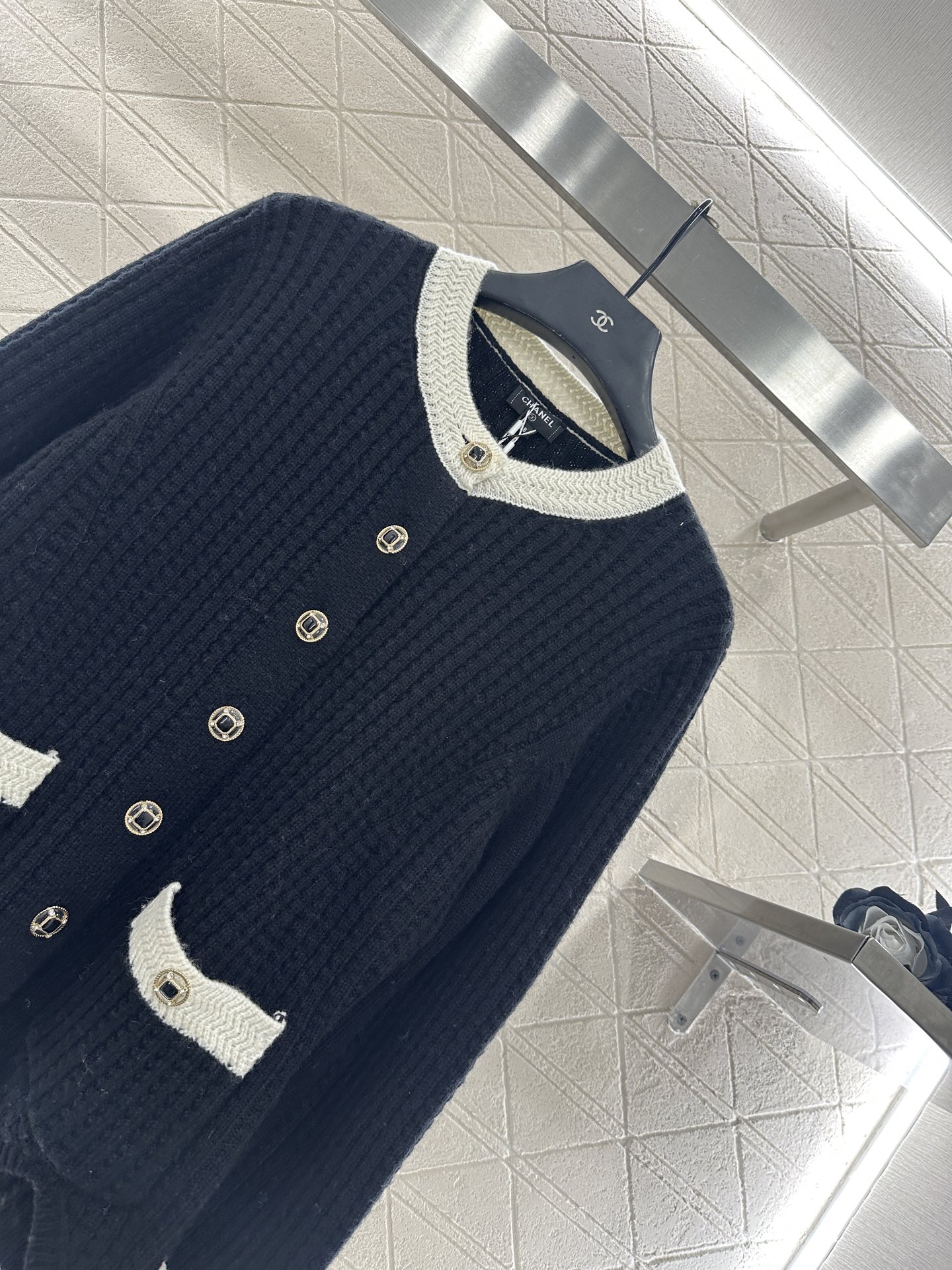 Experience luxury with this Chanel knit cardigan. Features include a round neck, button closure, and pockets, perfect for a chic, relaxed fit.