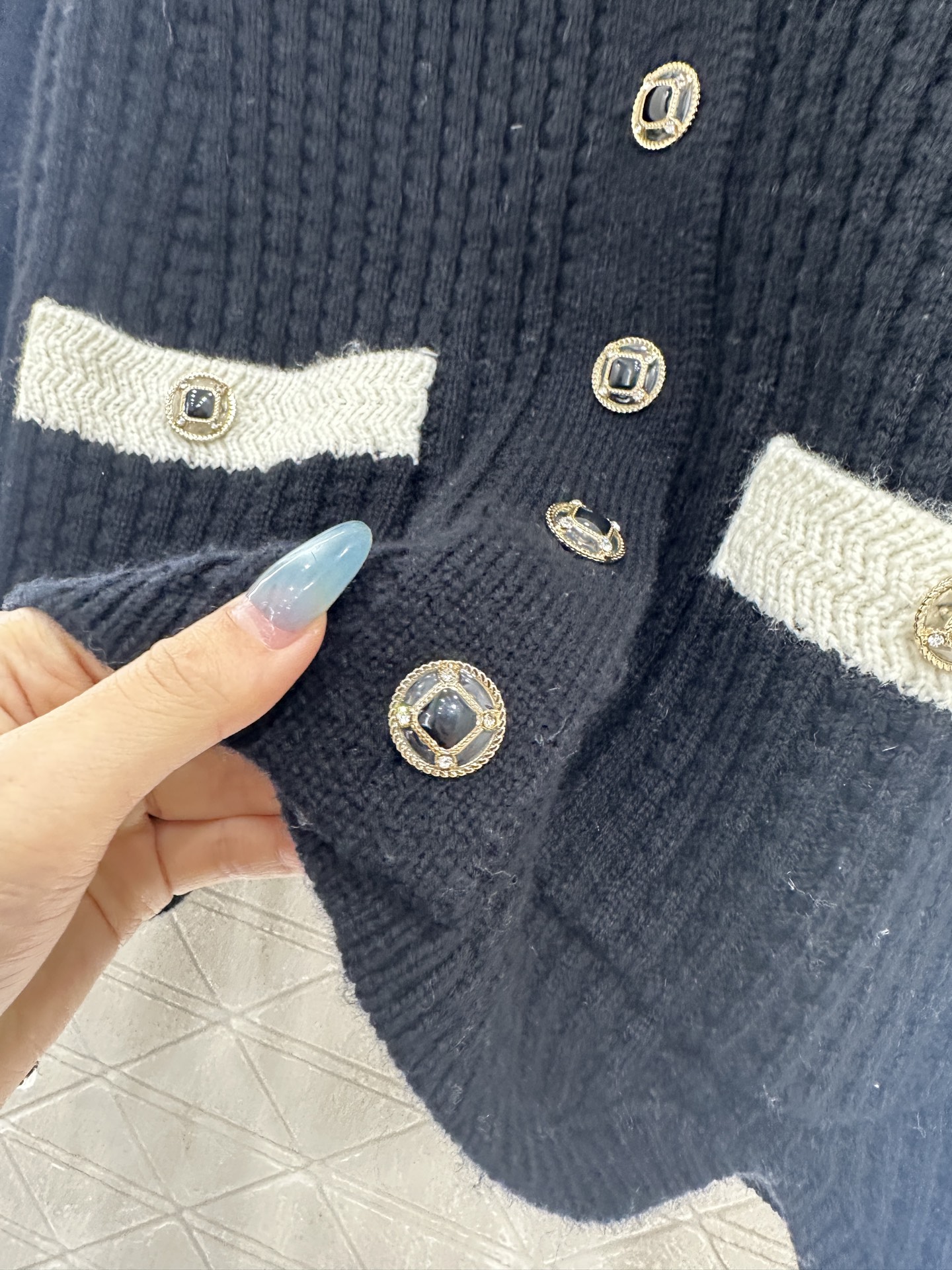 - Decorative hollow round buttons with a glossy finish.