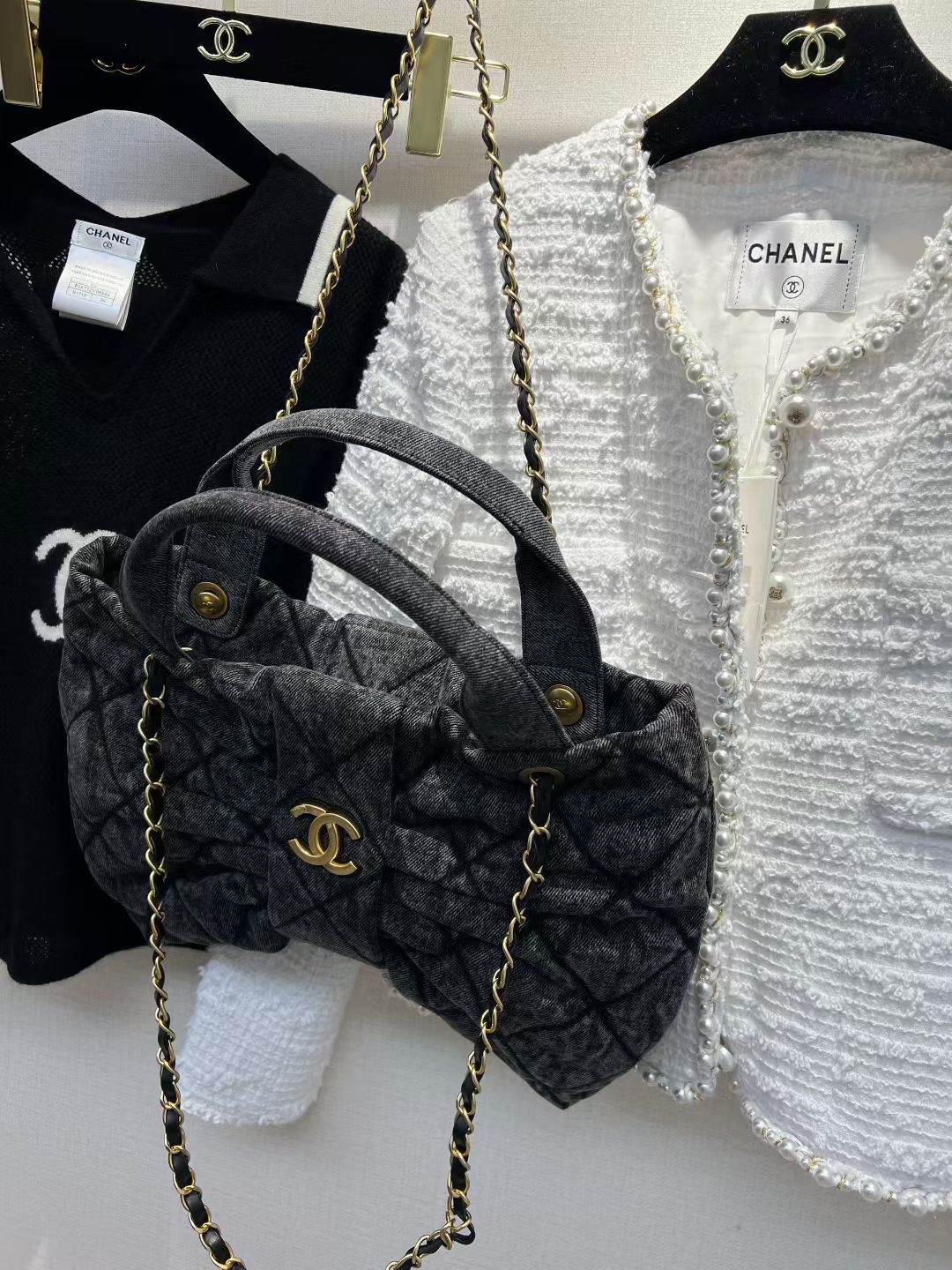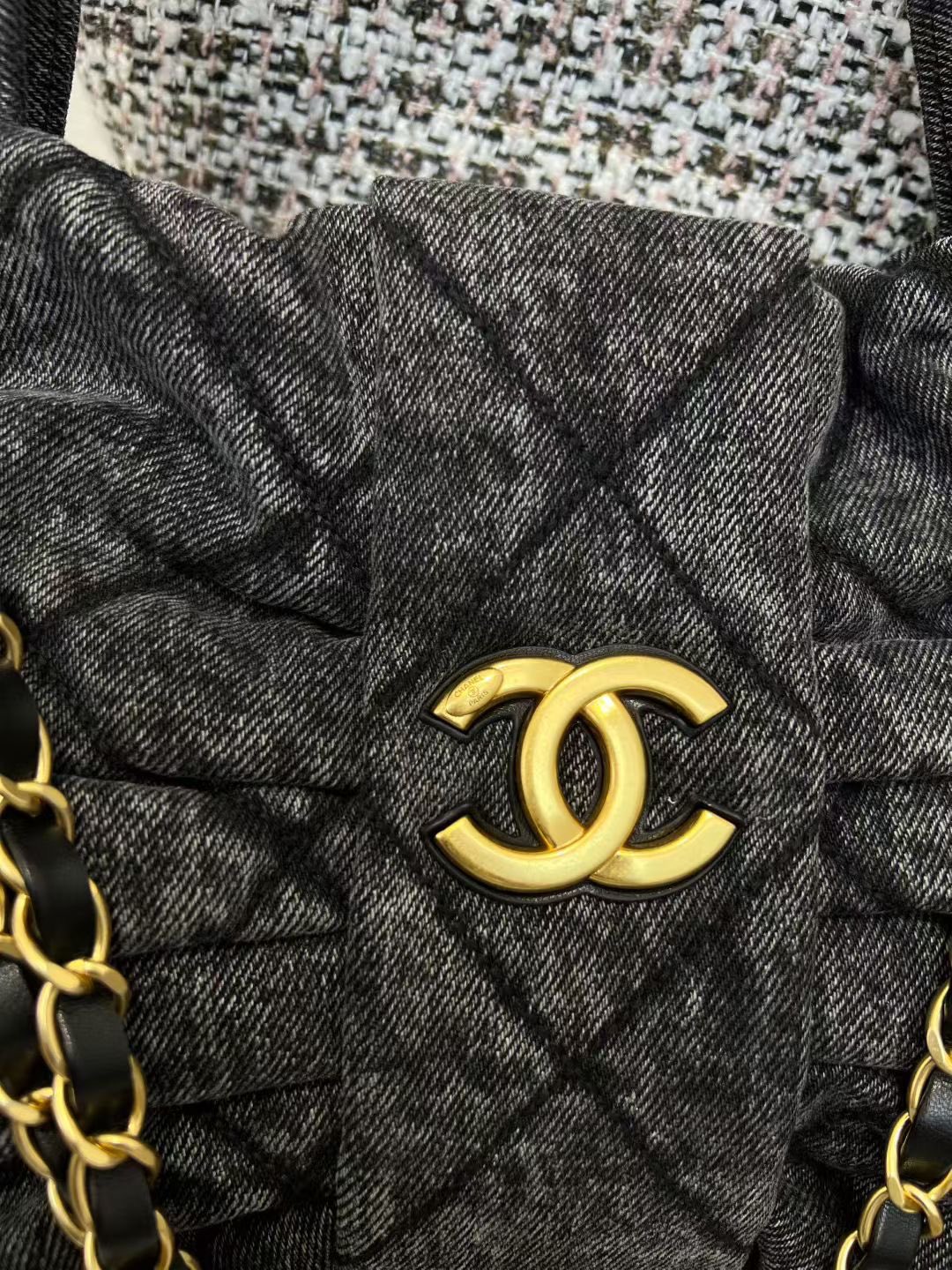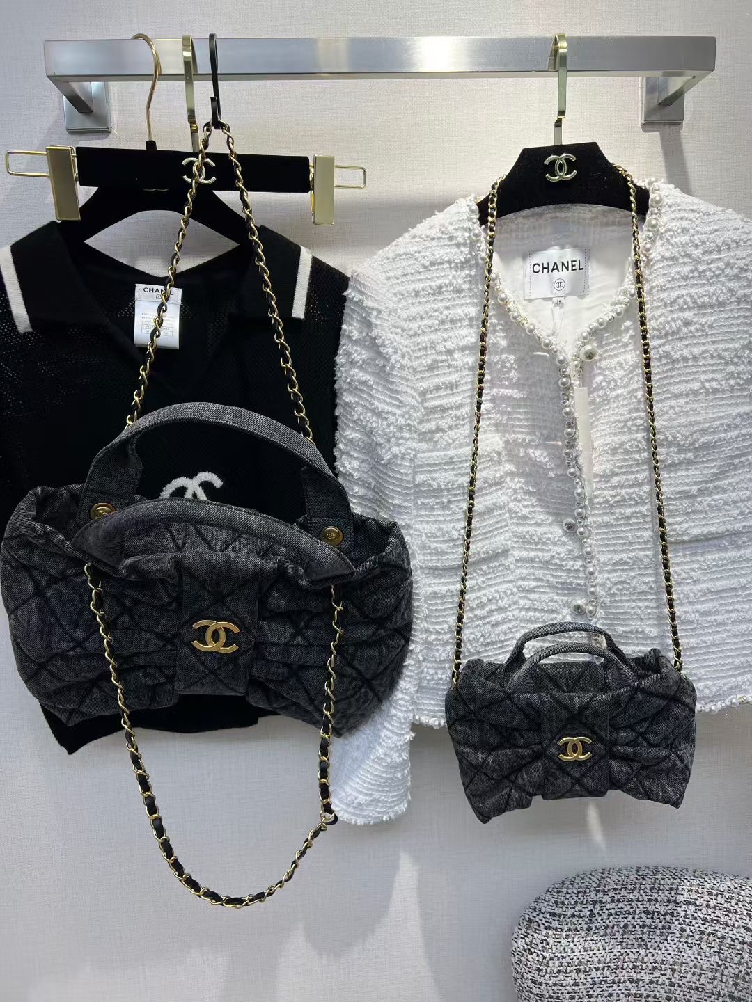Elegant Chanel denim shoulder bag with bow design, featuring a quilted pattern and chain strap. Size: 18/26/5cm.
