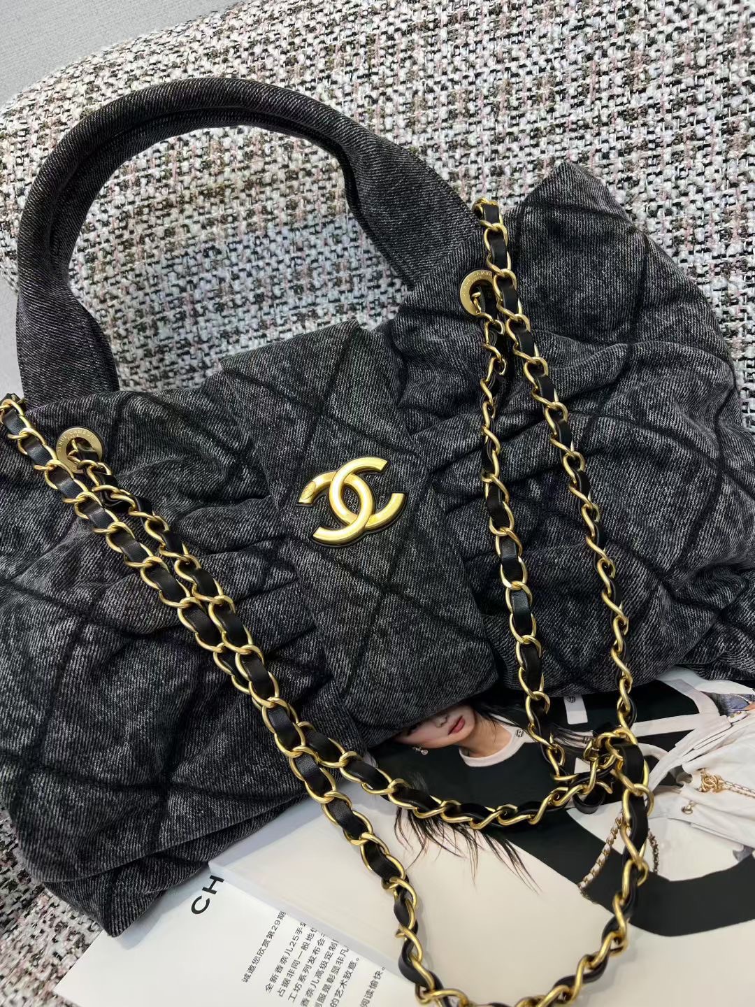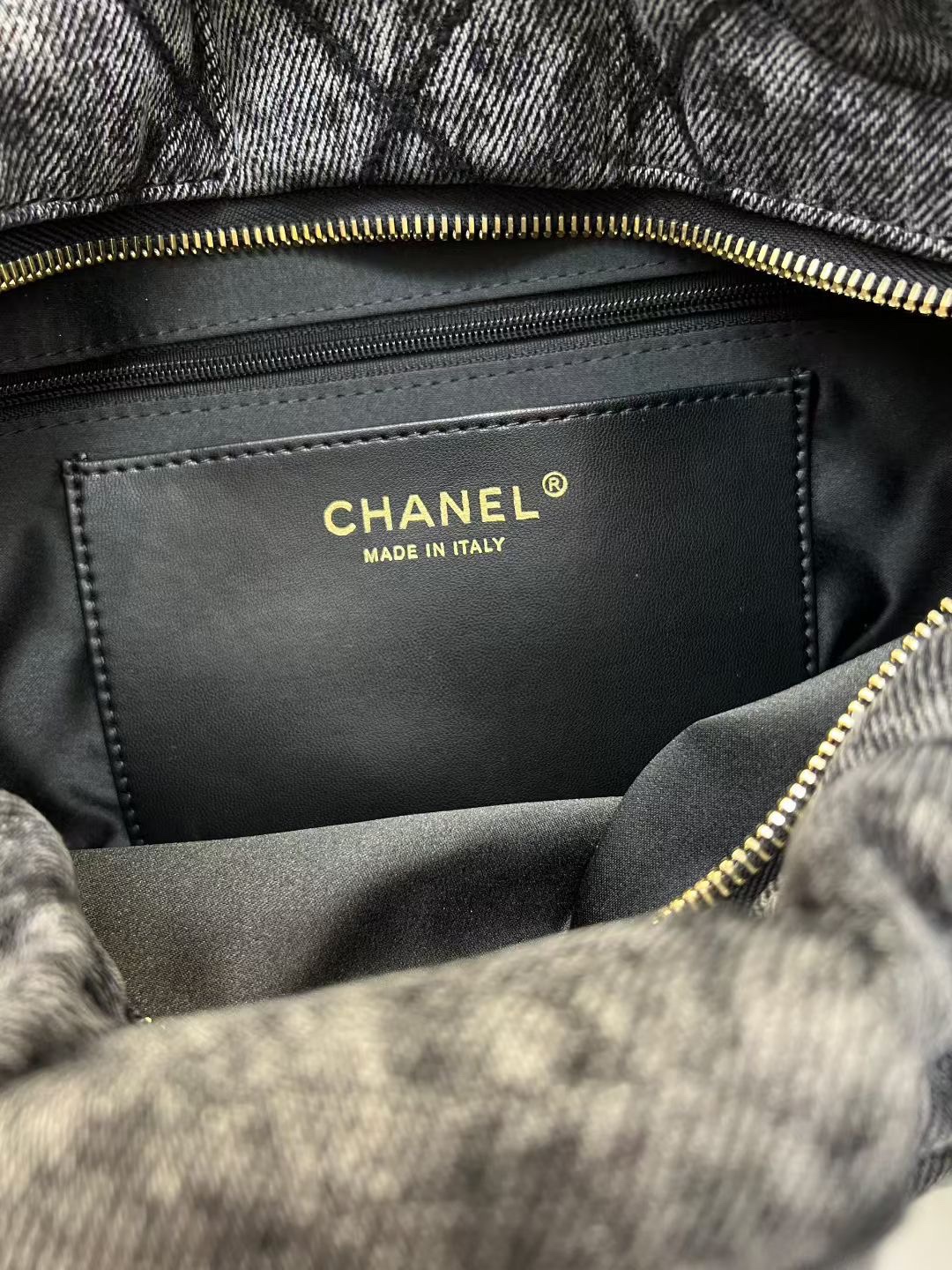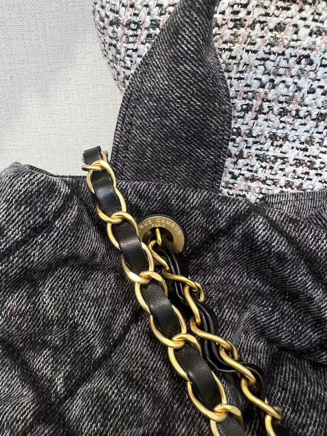 Elegant Chanel denim shoulder bag with bow design, featuring a quilted pattern and chain strap. Size: 18/26/5cm.