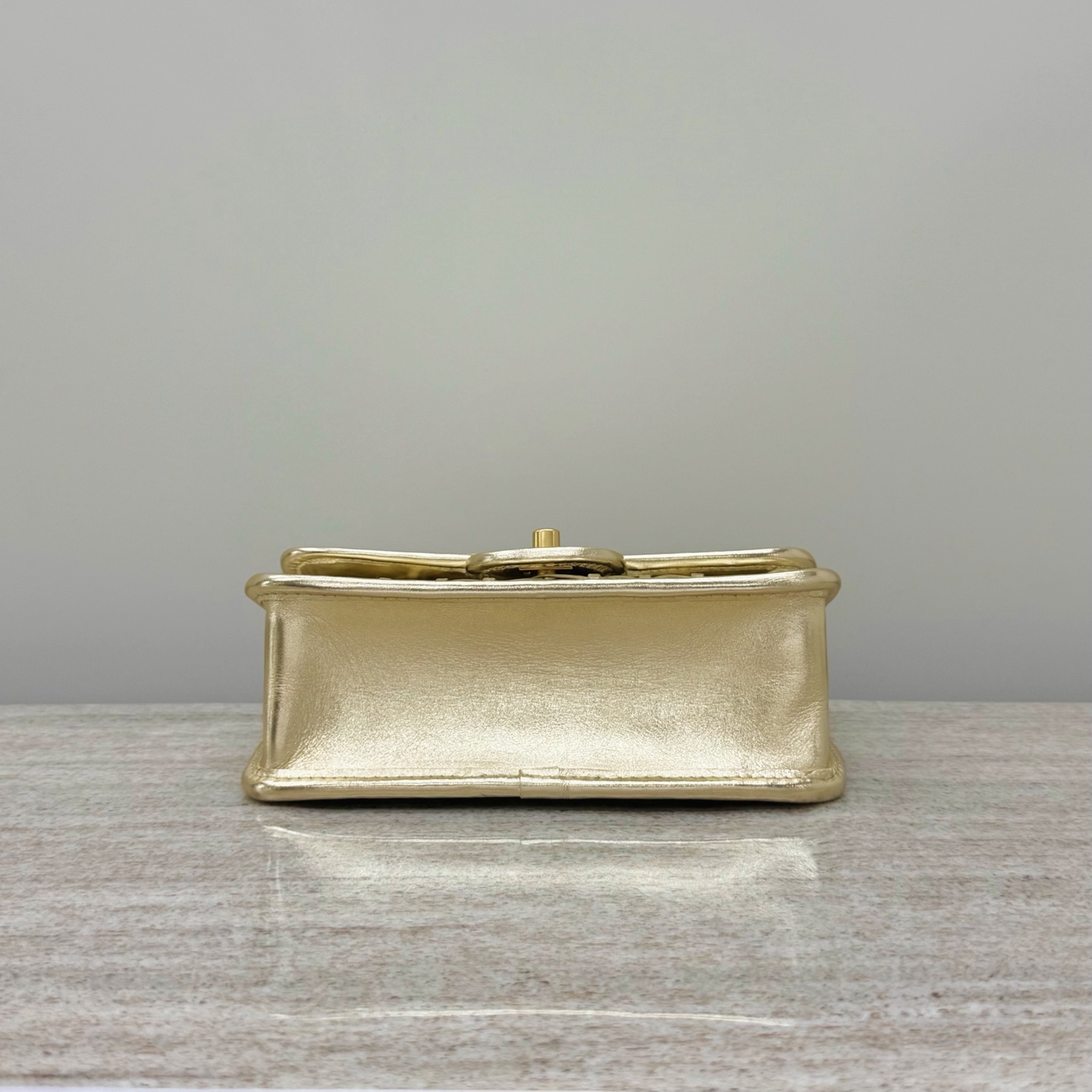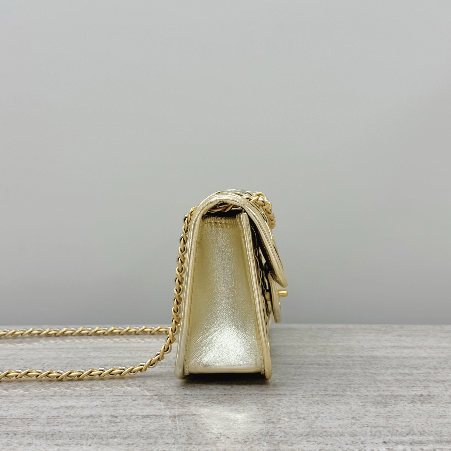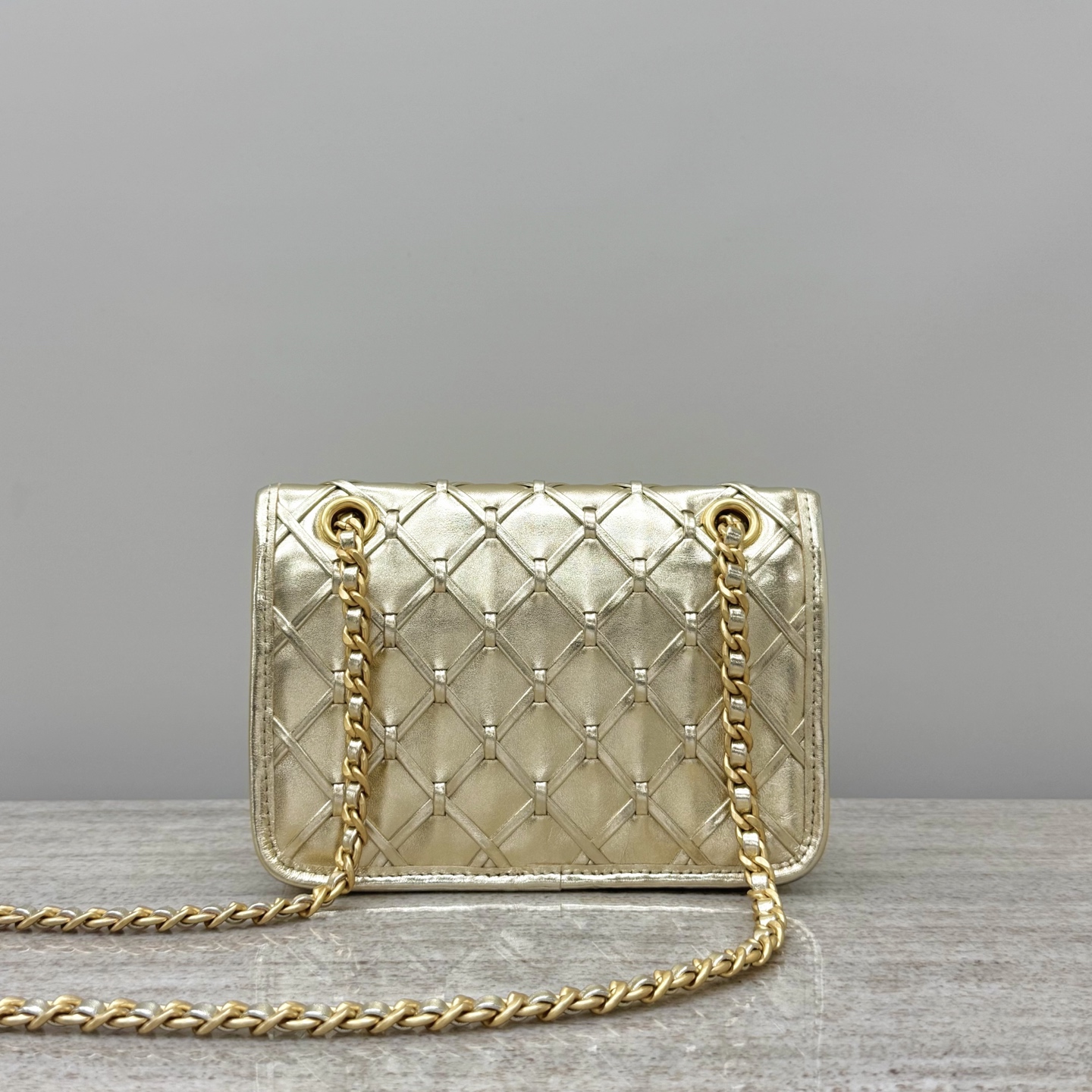 Exquisite Chanel Classic Flap bag in gold leather with interwoven chain. A timeless design, impeccably crafted for enduring elegance.