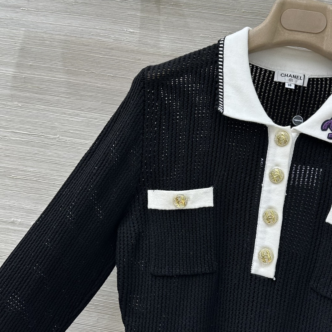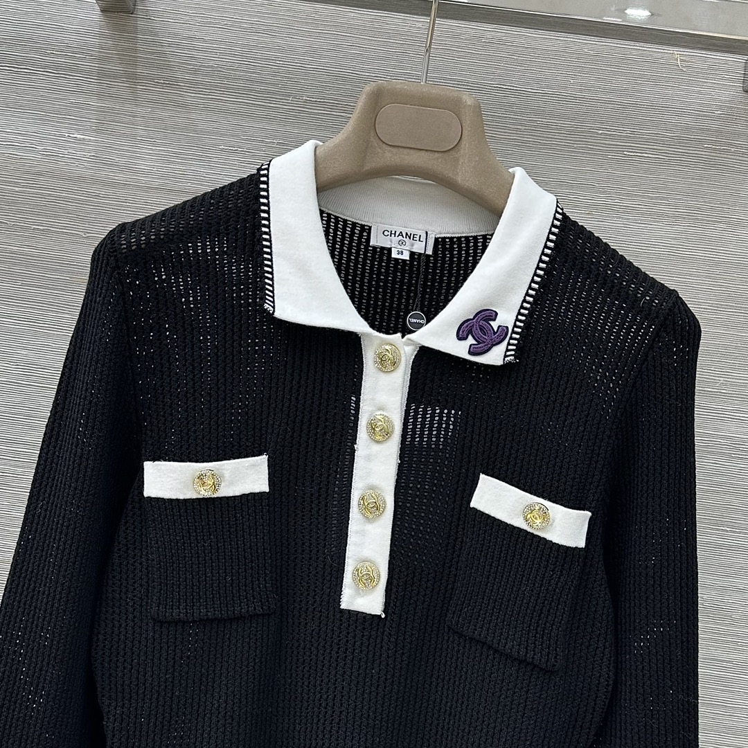 Elevate your wardrobe with this CHANEL knit top. Featuring a flattering V-neck, long sleeves, and chic details, this sweater exudes timeless elegance.