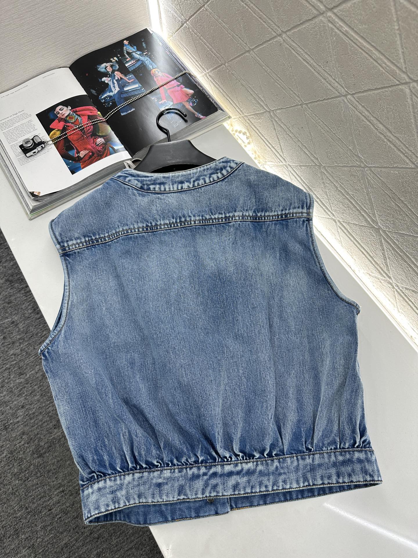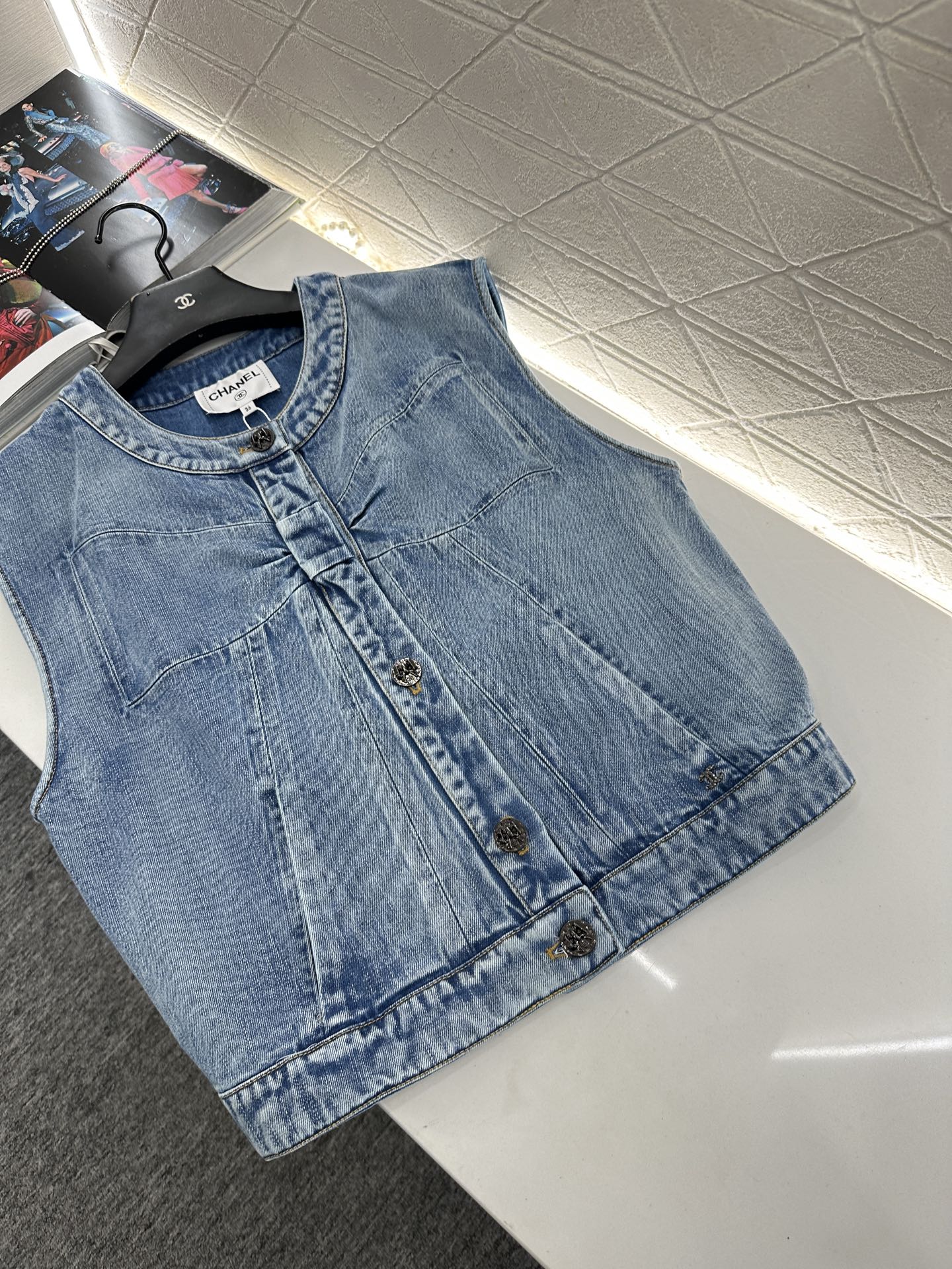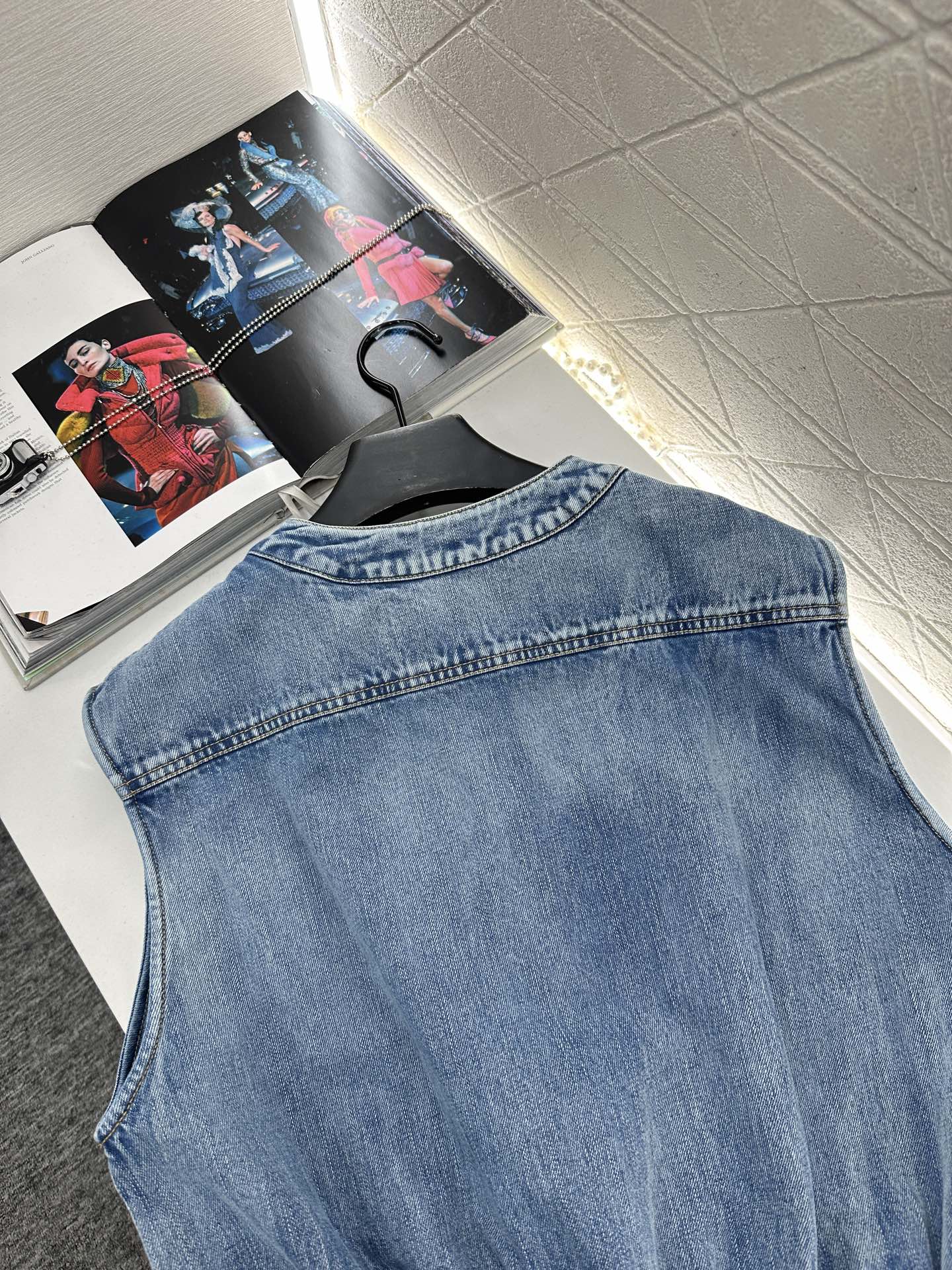 This Chanel 2025 denim vest is a must-have for any fashion-forward wardrobe. It is designed with YB twill cotton denim fabric, multiple washes, presenting a crisp texture.
