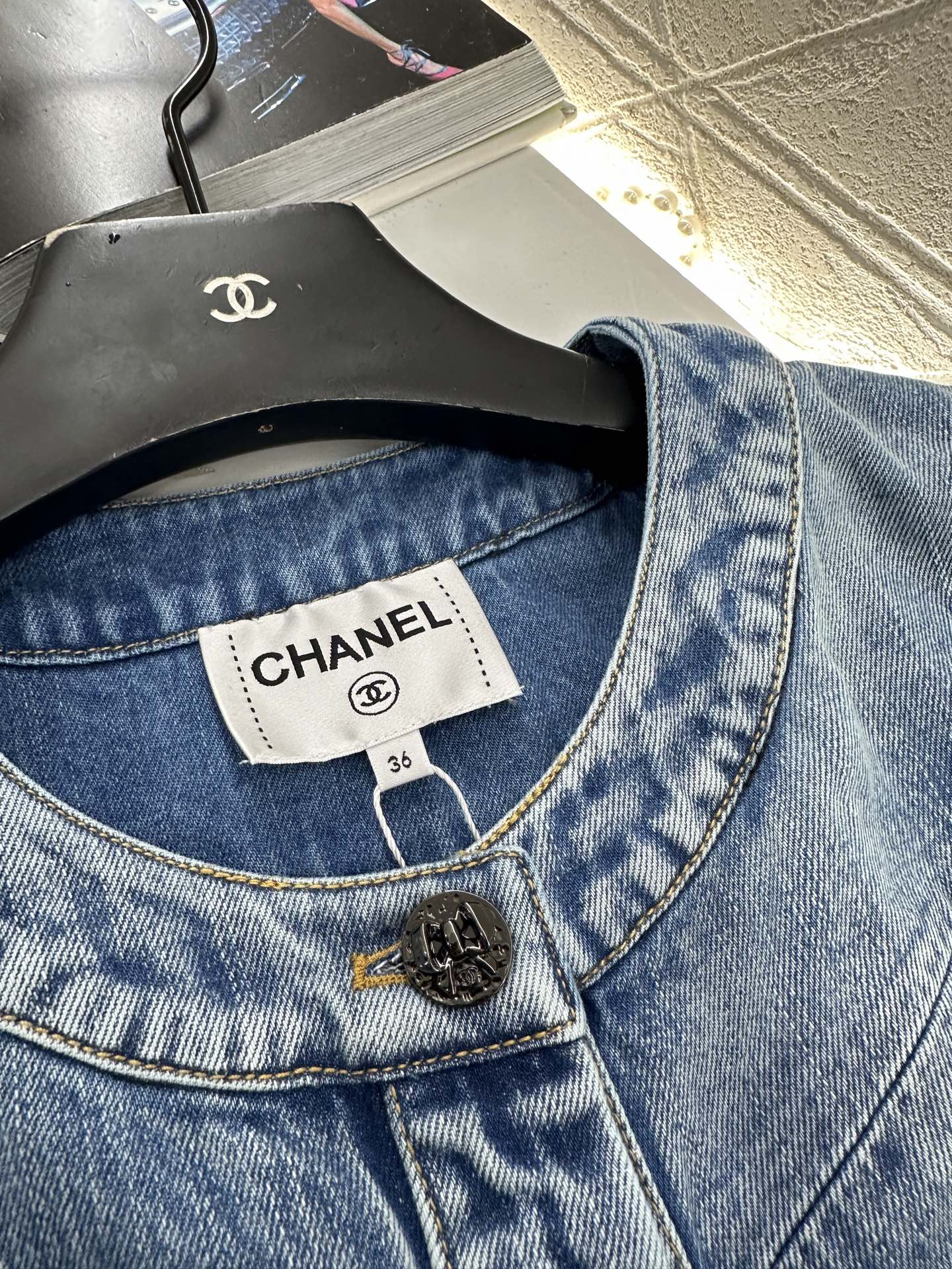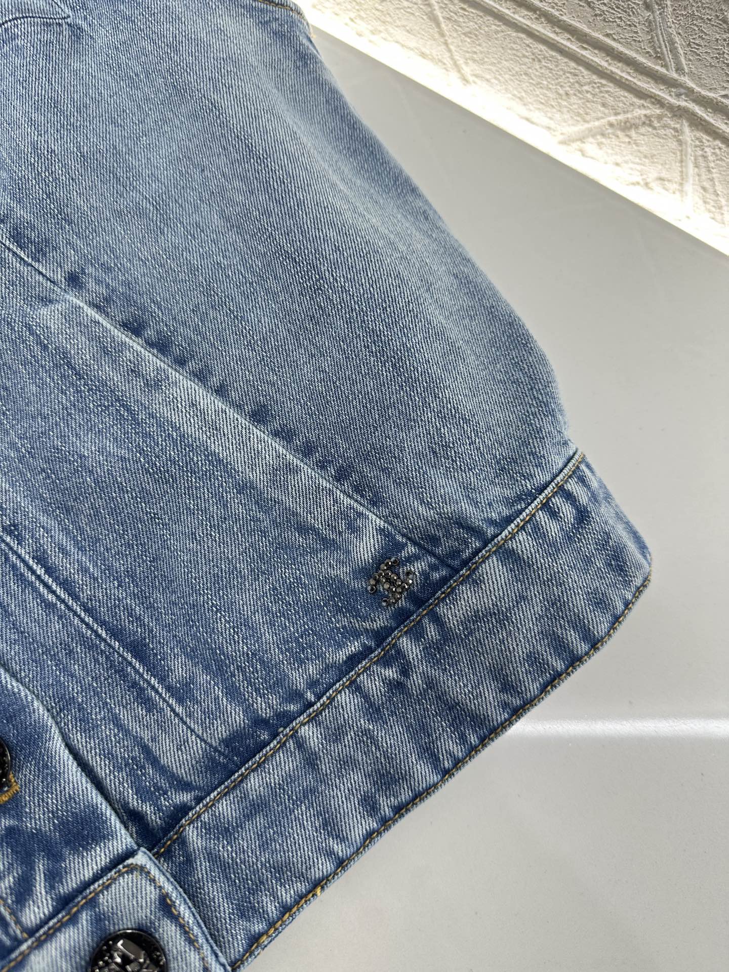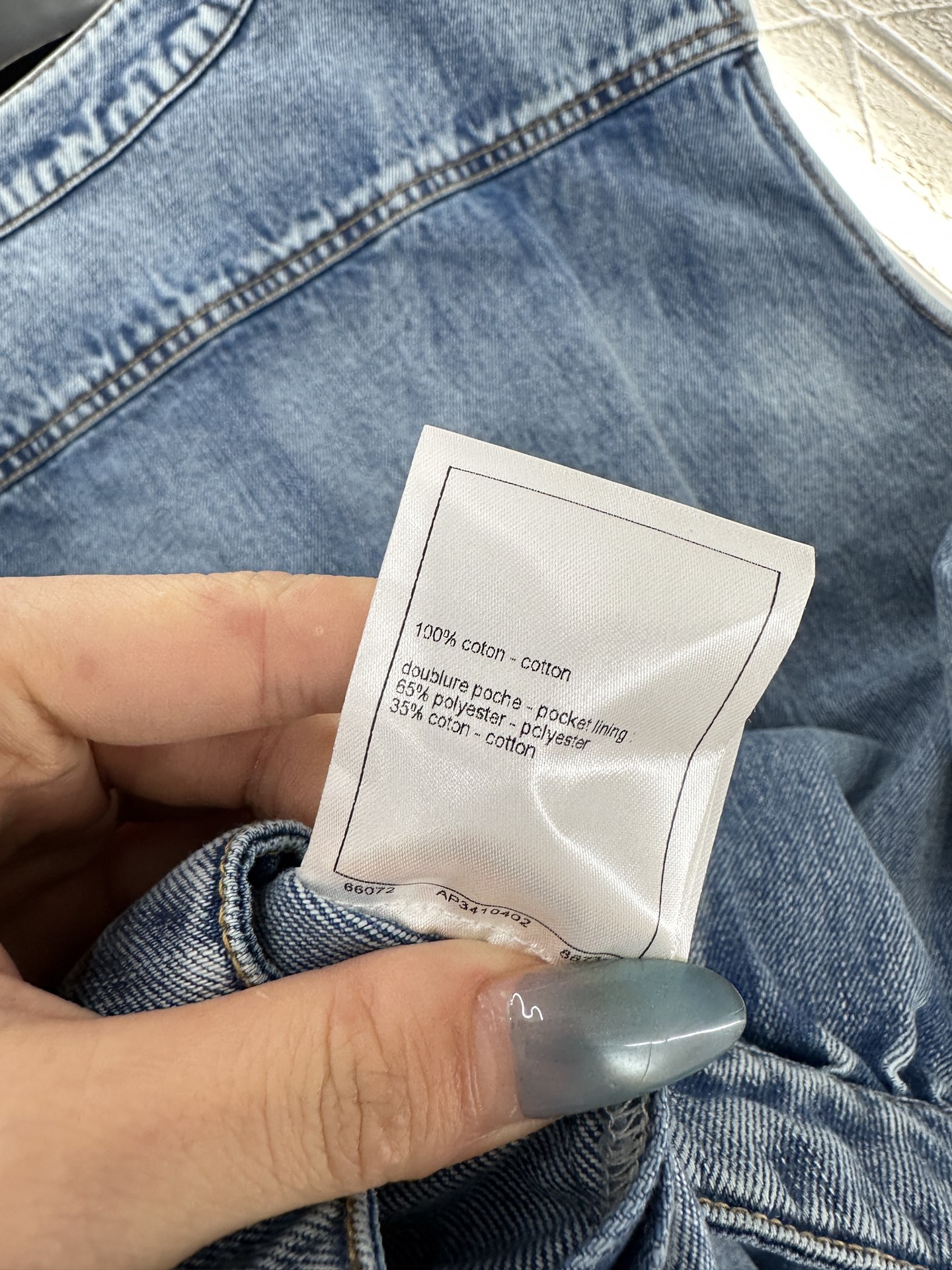 This Chanel 2025 denim vest is a must-have for any fashion-forward wardrobe. It is designed with YB twill cotton denim fabric, multiple washes, presenting a crisp texture.