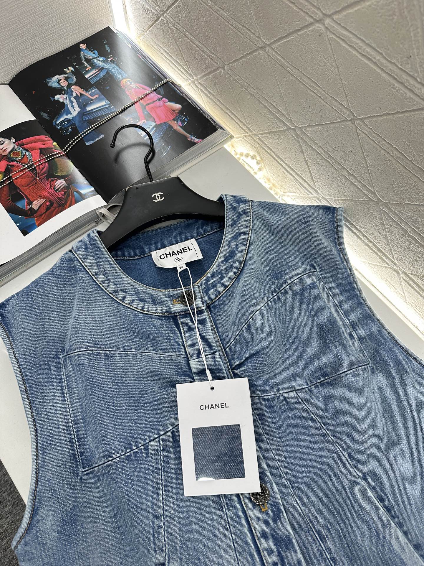 This Chanel denim vest is a versatile and stylish addition to any wardrobe, perfect for layering or wearing on its own.