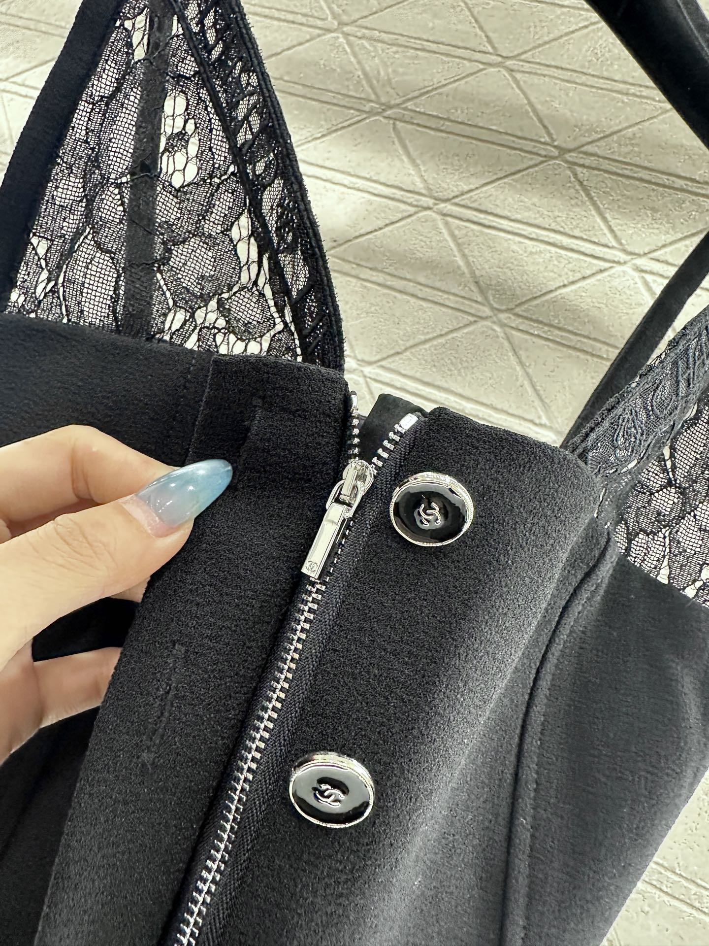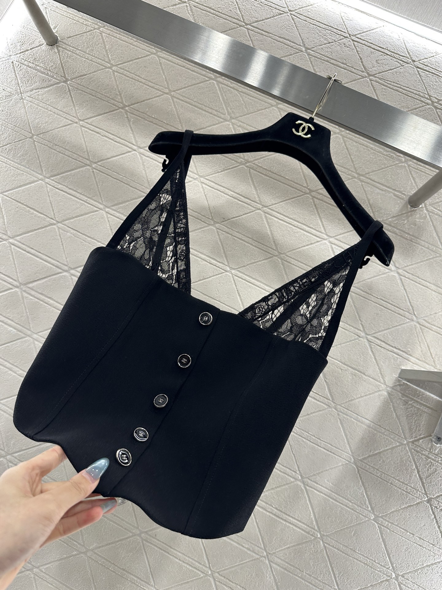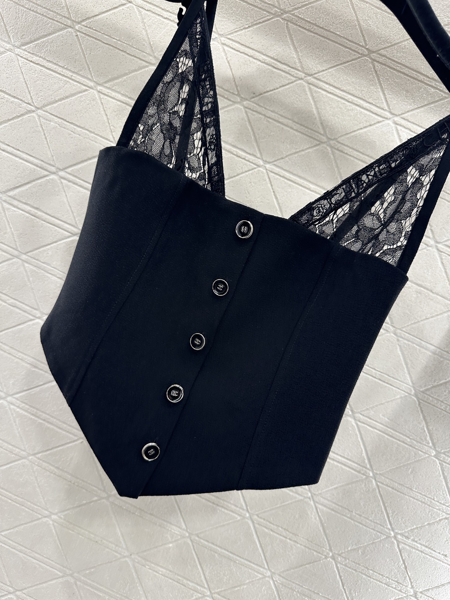 Chanel Lace-Trimmed Wool Blend Corset Top - Deep V-Neck, Sleeveless, Black