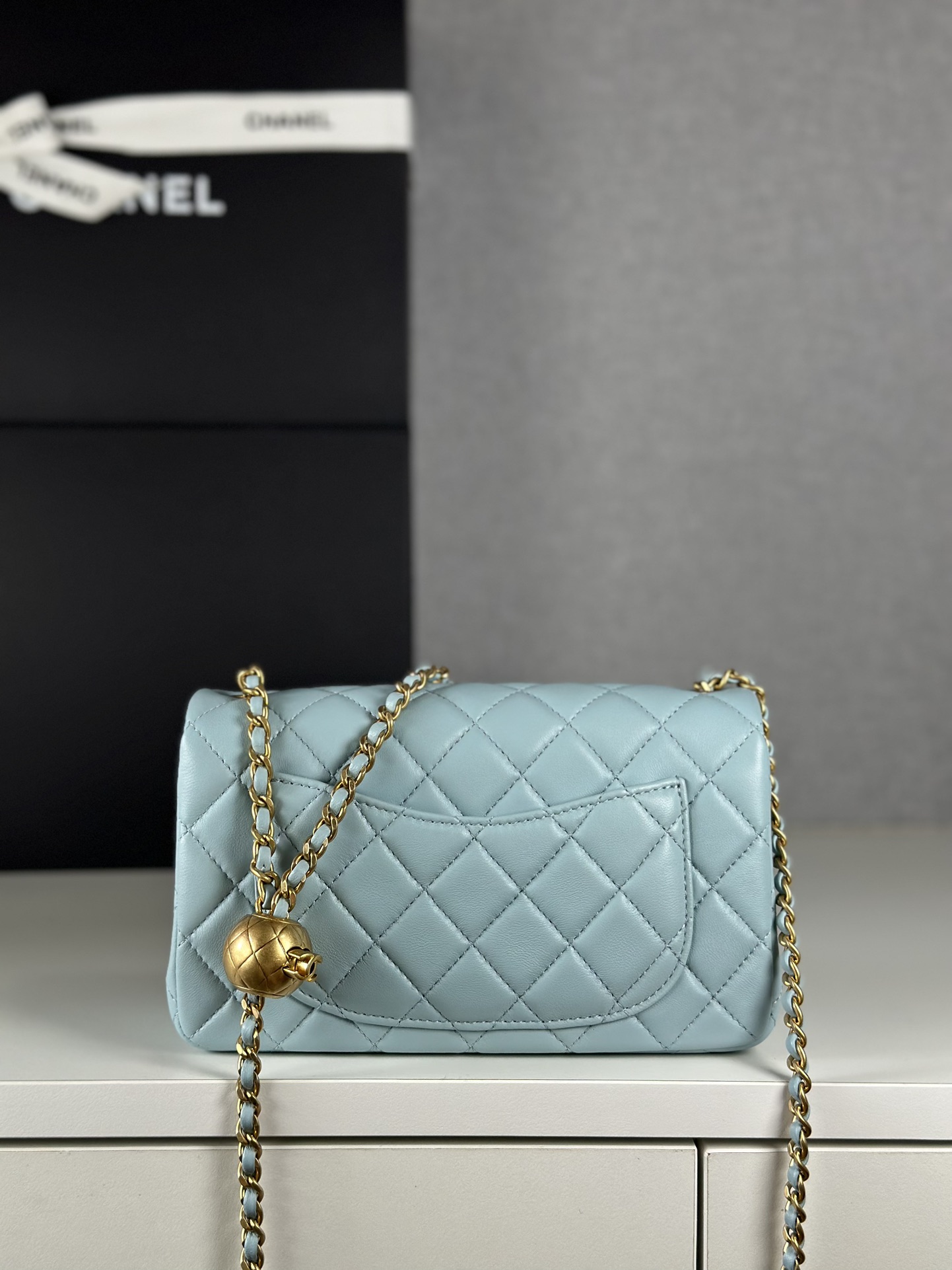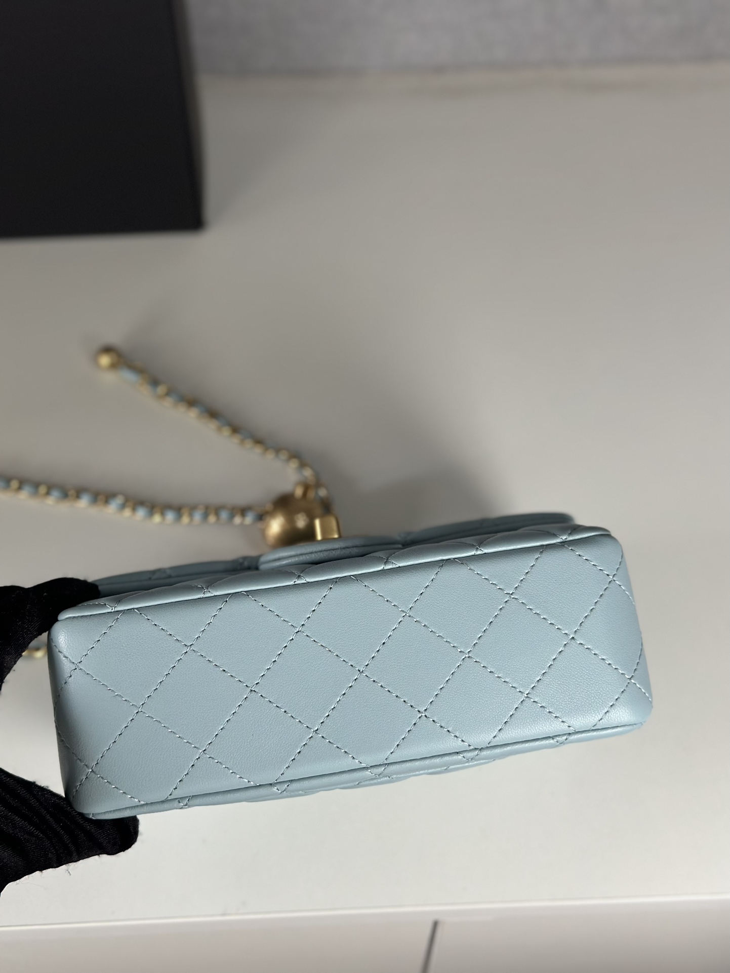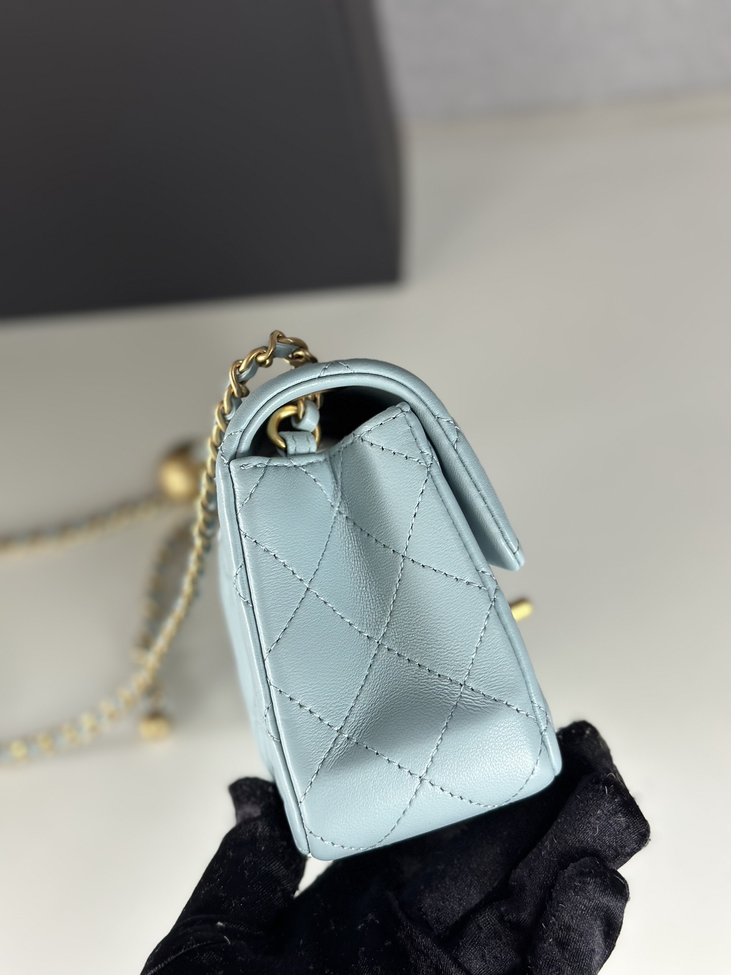 Tags: 24k Gold Ball Bag, Chanel Mini Flap Bag, Designer Crossbody Bag, Light Blue Shoulder Bag, Luxury Handbag, Quilted Leather Bag