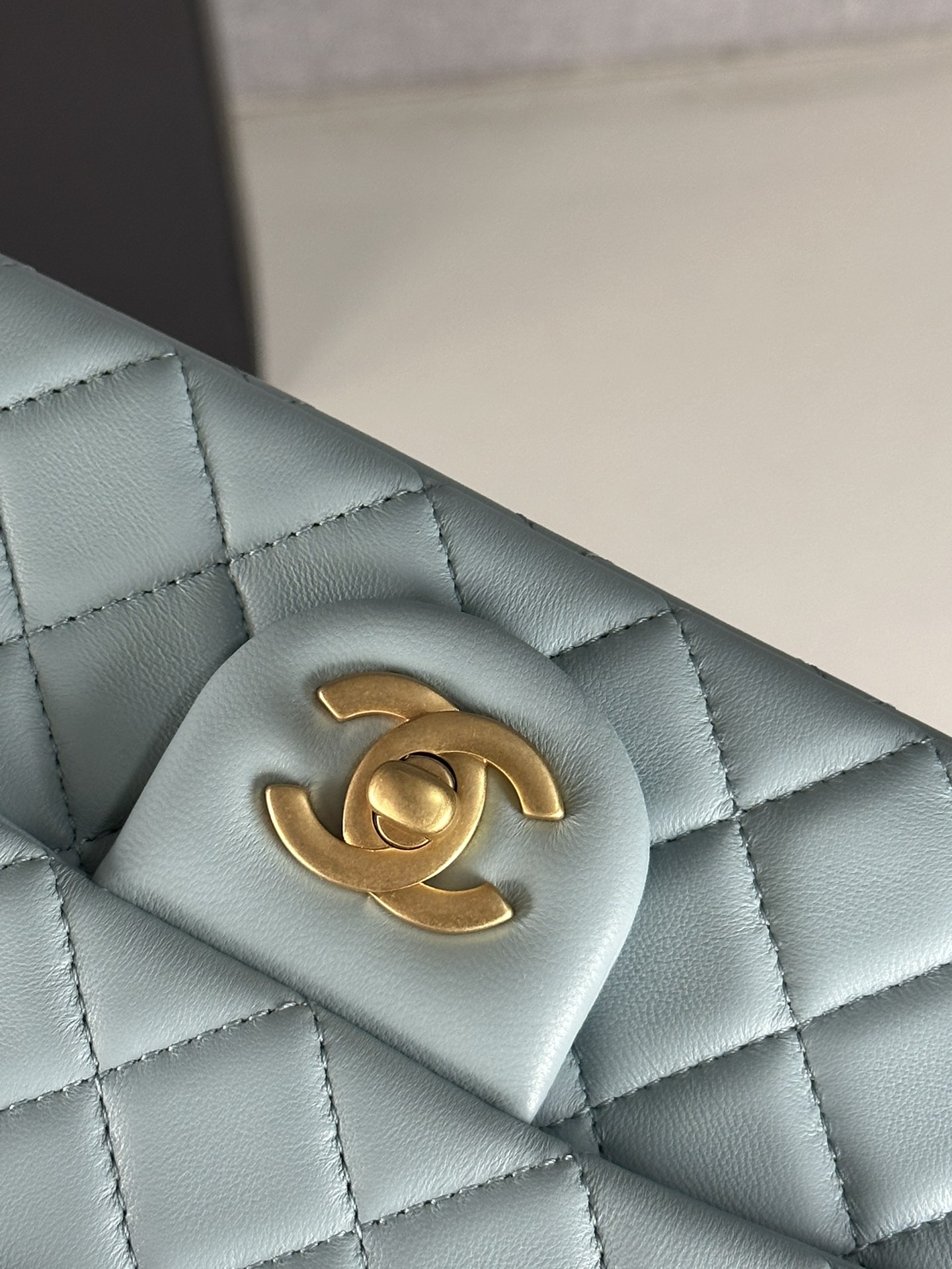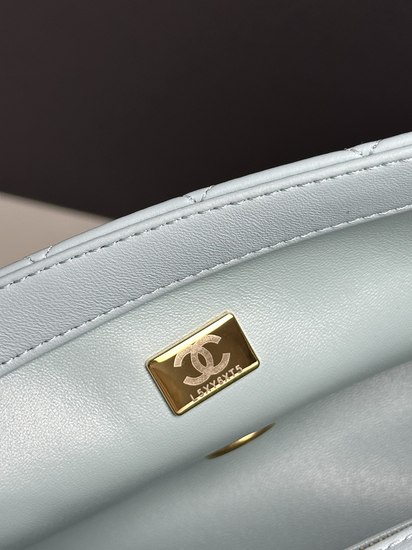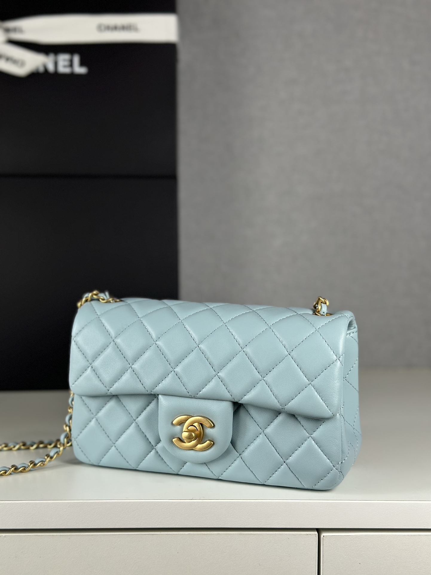 Tags: 24k Gold Ball Bag, Chanel Mini Flap Bag, Designer Crossbody Bag, Light Blue Shoulder Bag, Luxury Handbag, Quilted Leather Bag