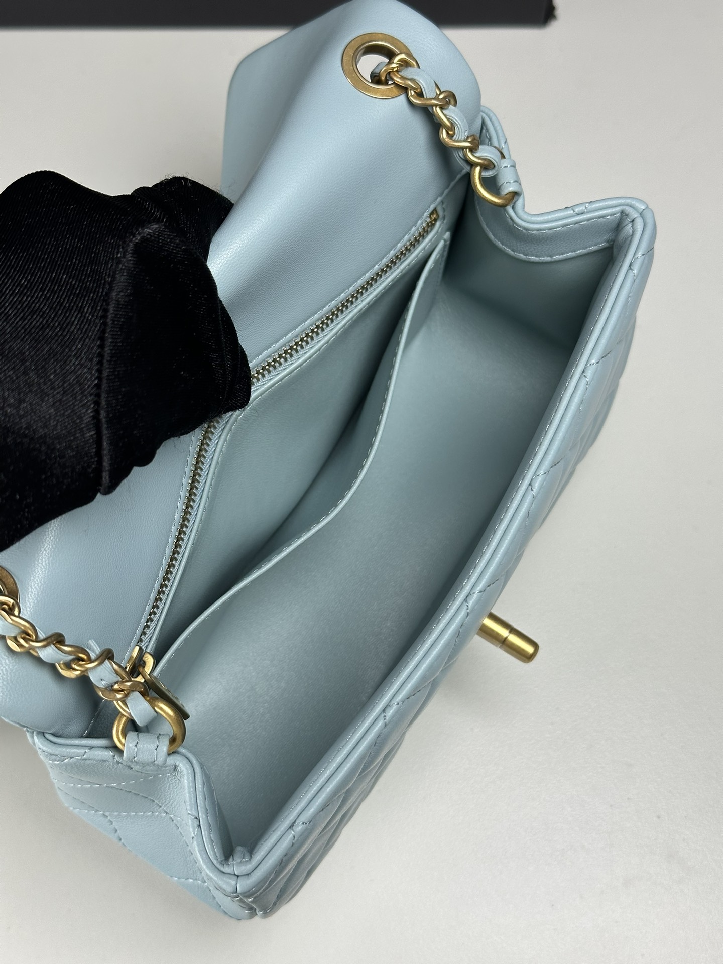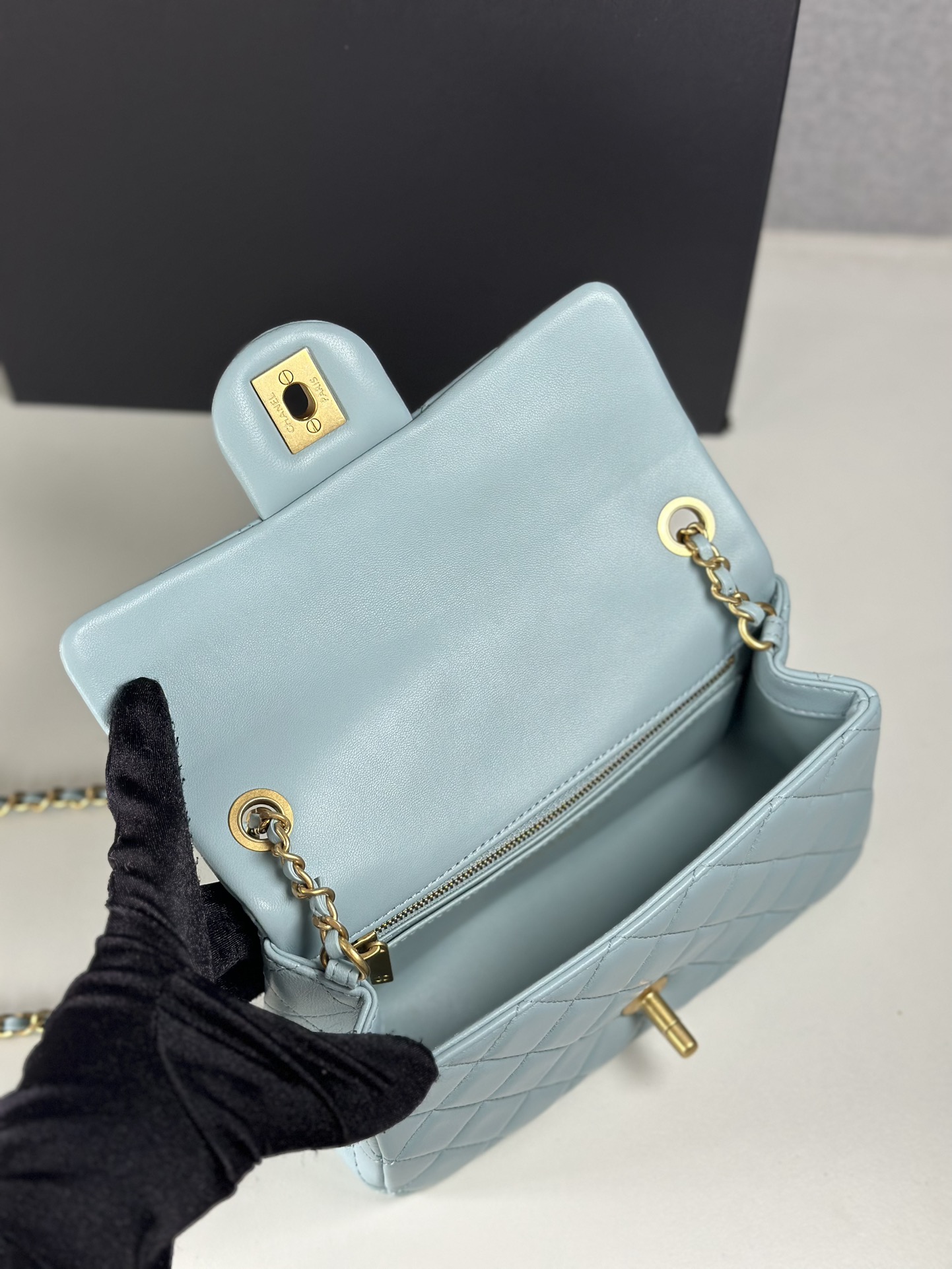 The Chanel Mini CF flap bag features a 24K gold ball clasp, light blue quilted leather, and versatile chain strap for shoulder or crossbody wear.