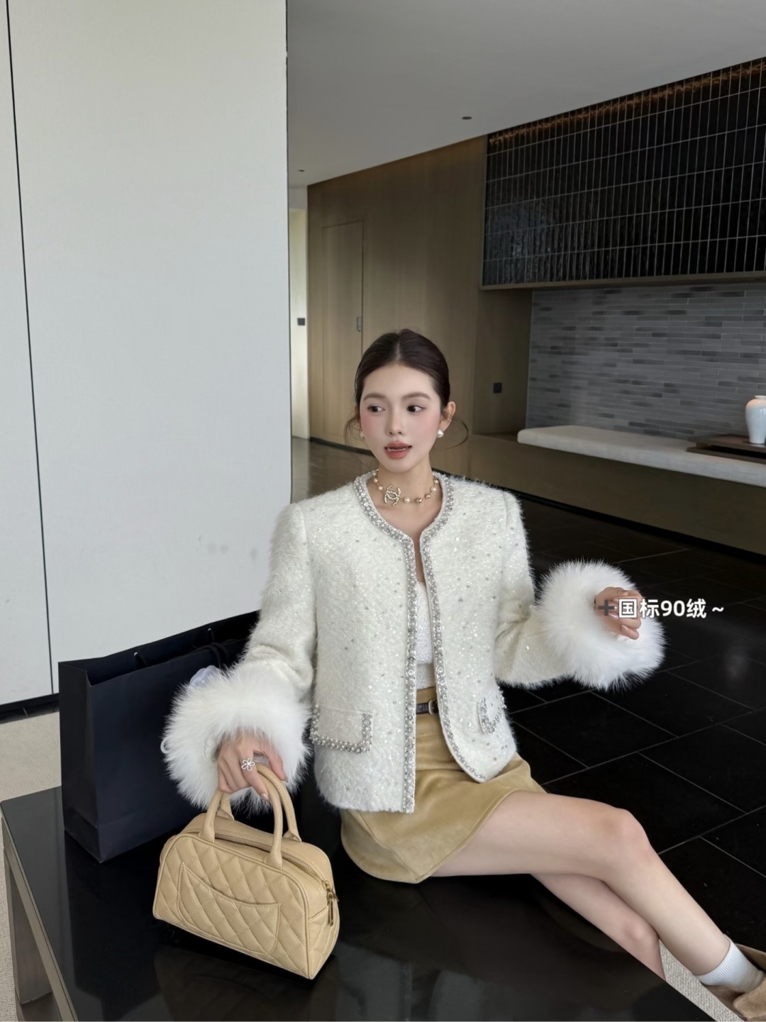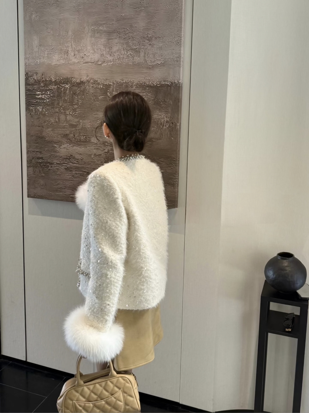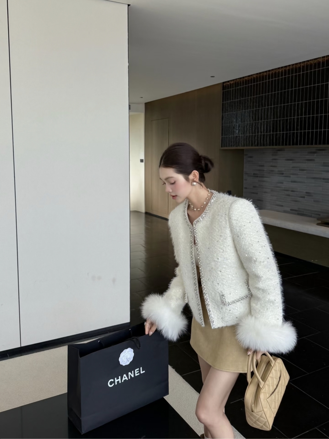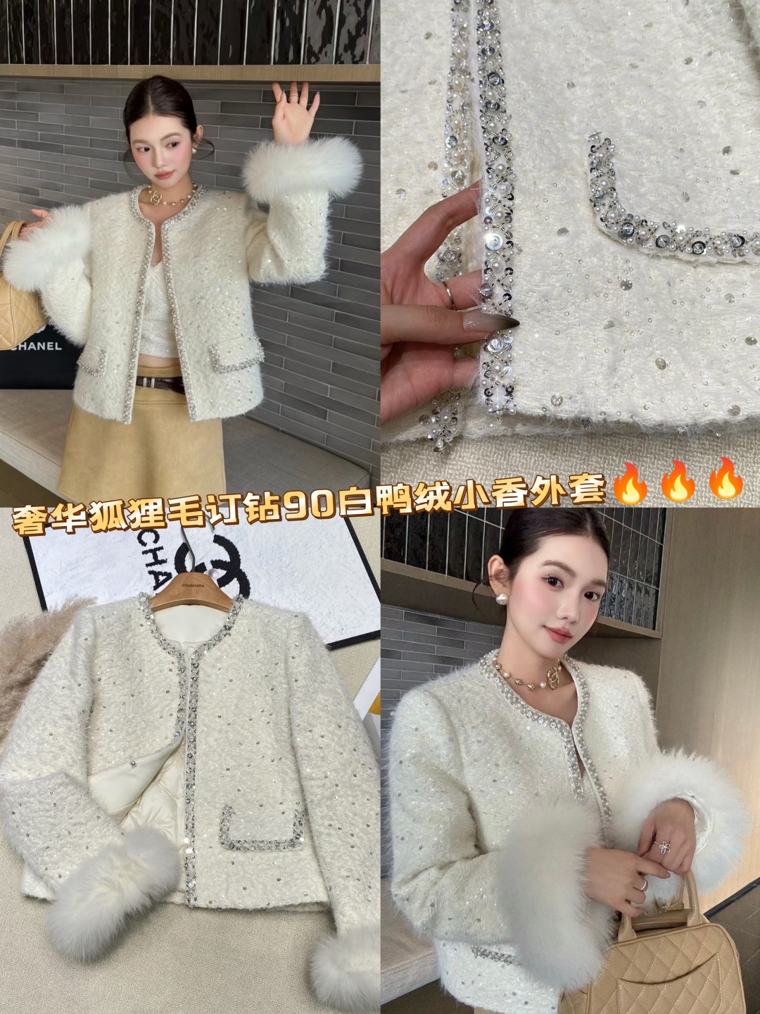 High-end Chanel jacket featuring 90 white duck down, fox fur cuffs, and sequin-embellished fabric. A luxurious and stylish statement piece.