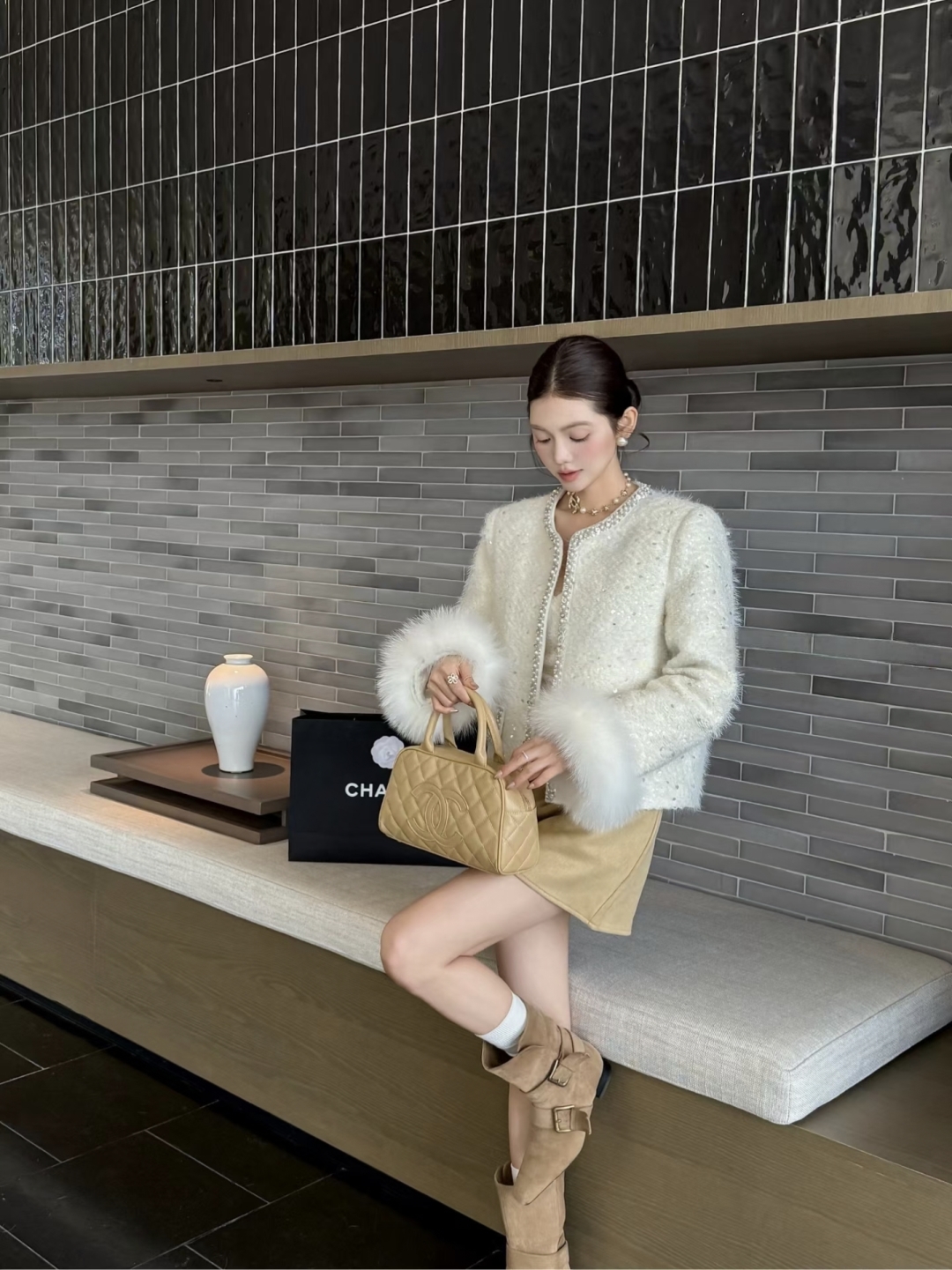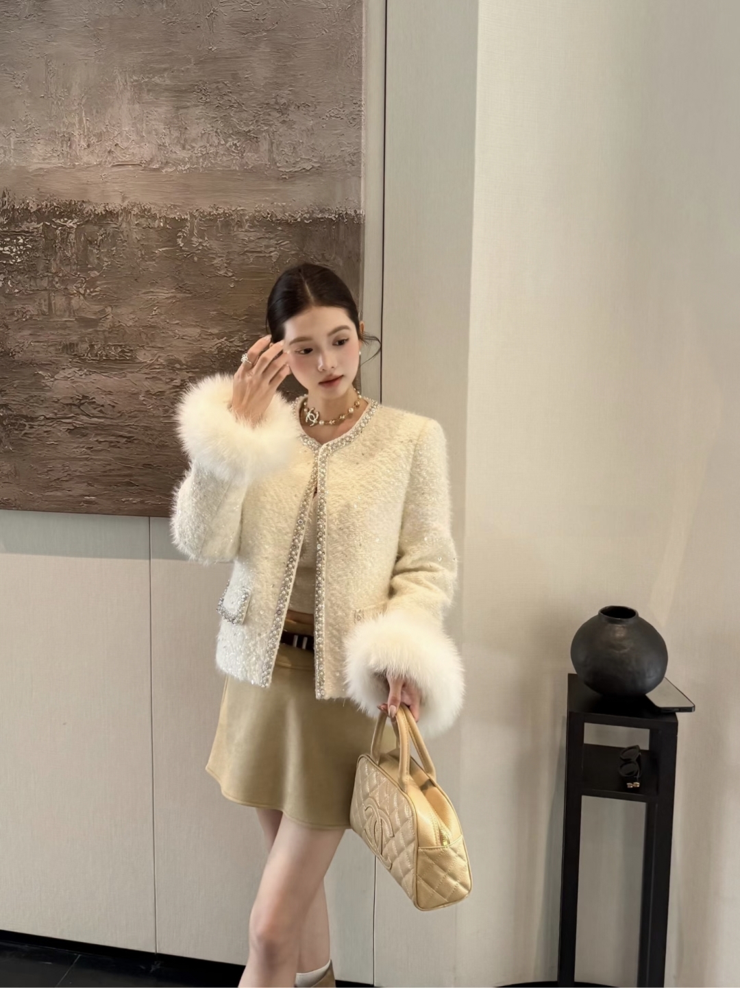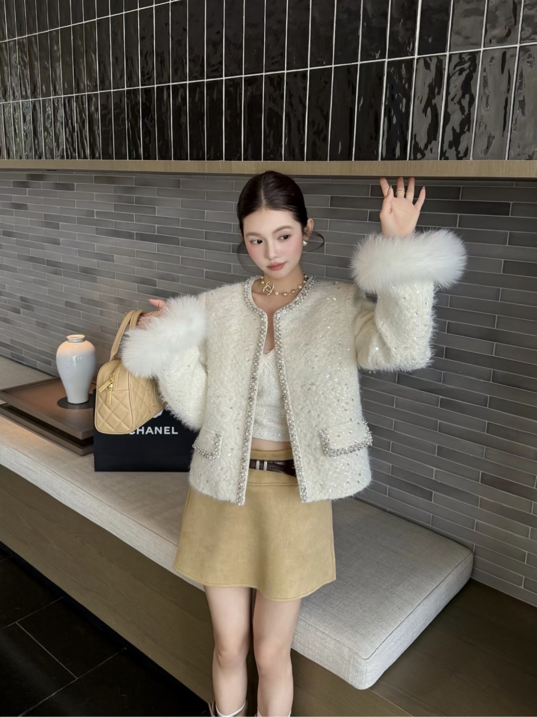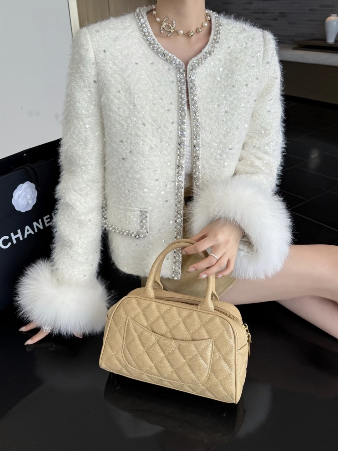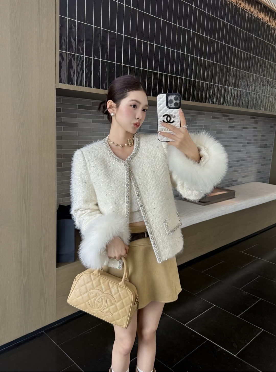 High-end Chanel jacket featuring 90 white duck down, fox fur cuffs, and sequin-embellished fabric. A luxurious and stylish statement piece.