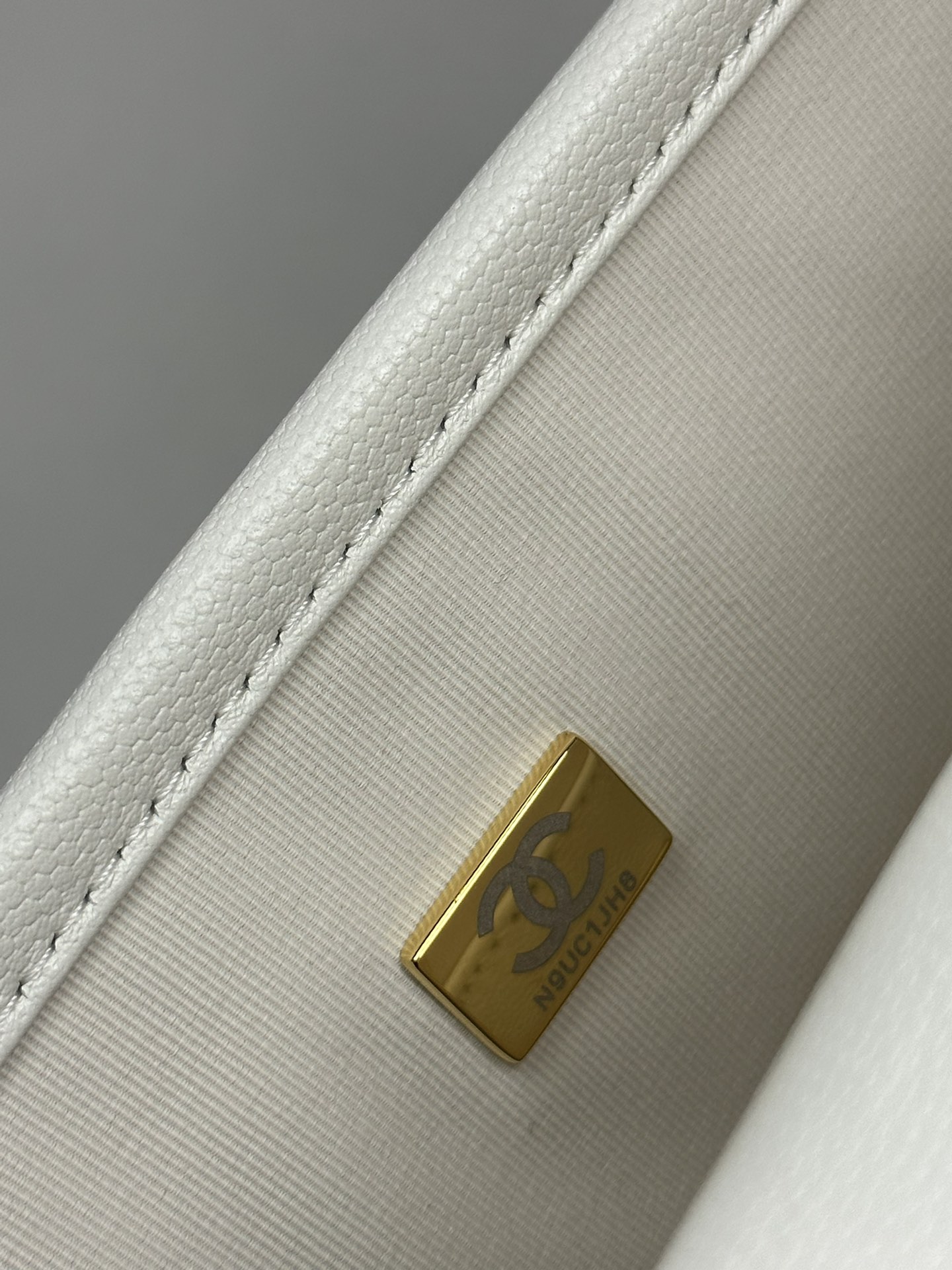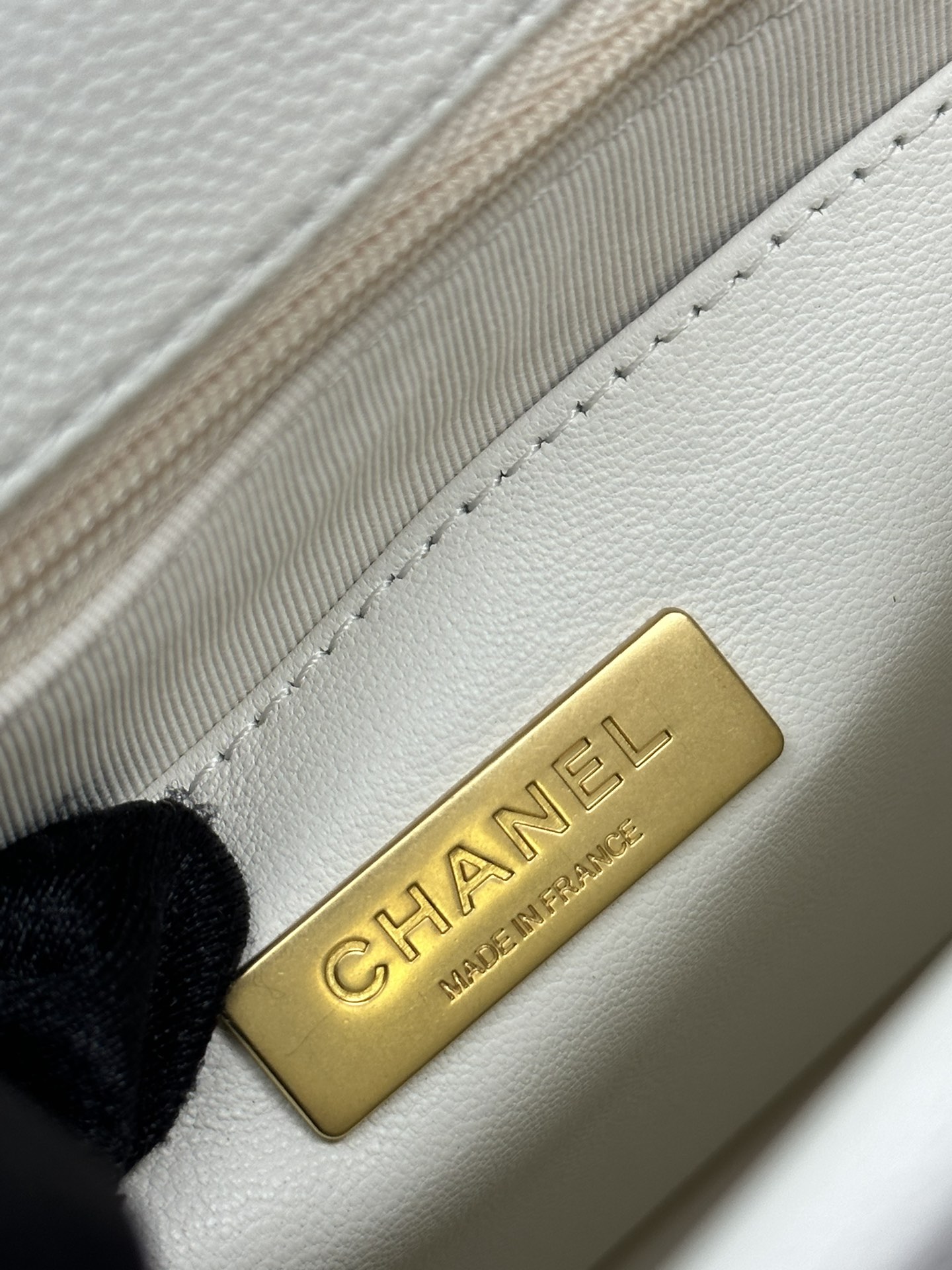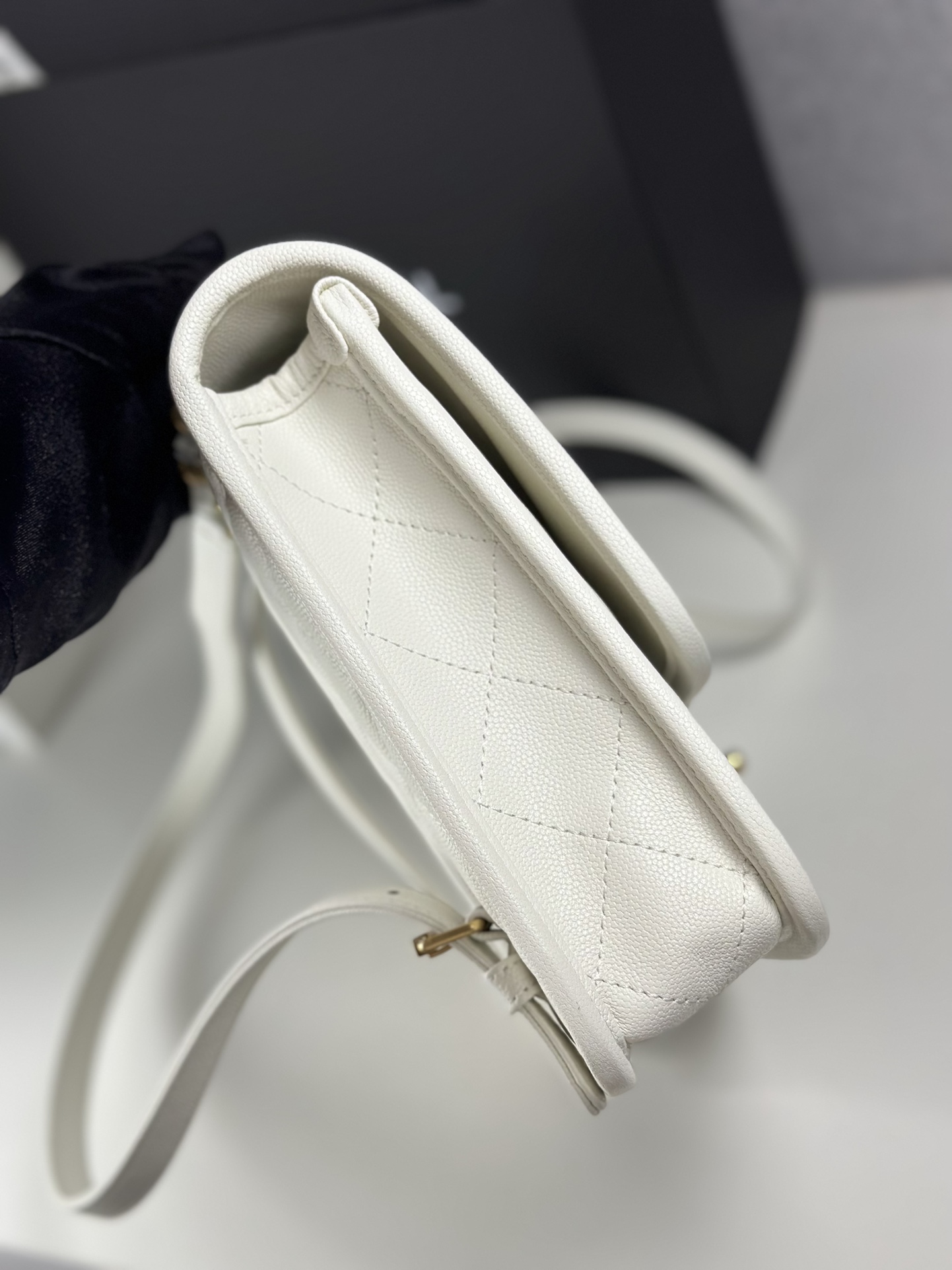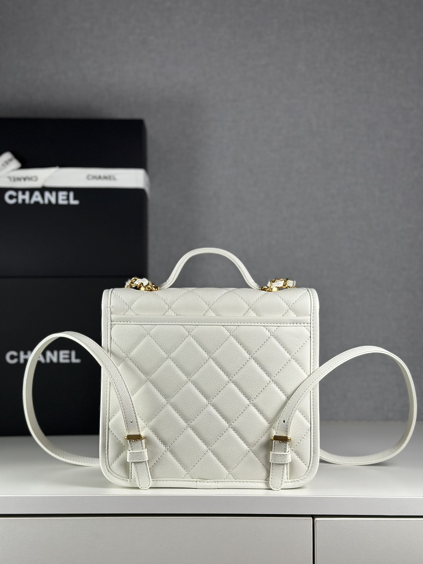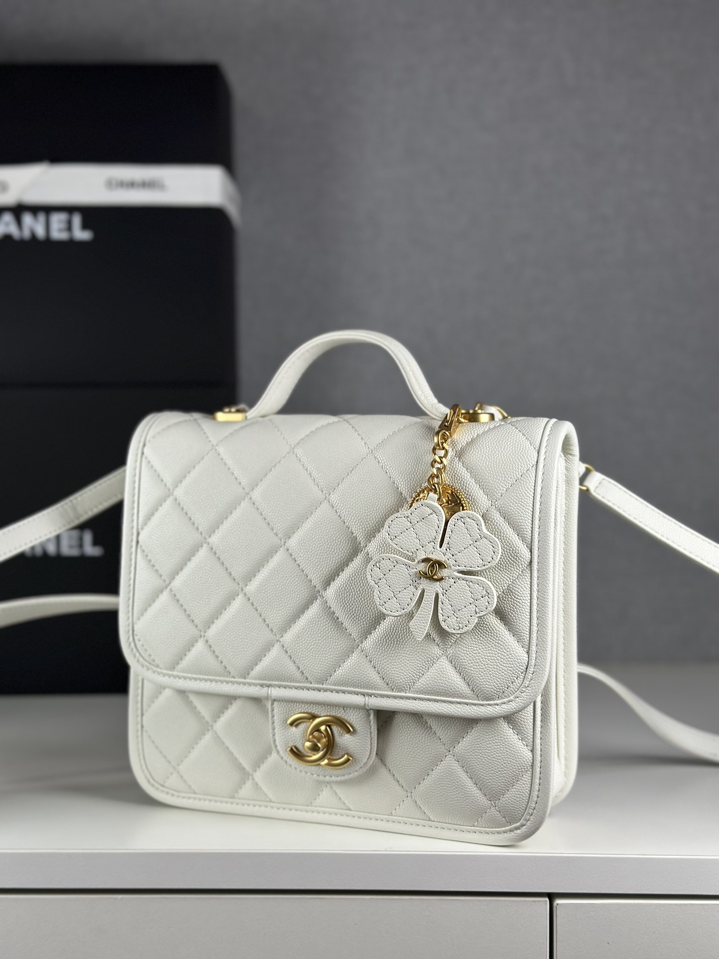 Elevate your style with this Chanel backpack. Features white quilted leather, clover charm, and vintage appeal. Perfect for any occasion. Size: 22x19.5x7cm.