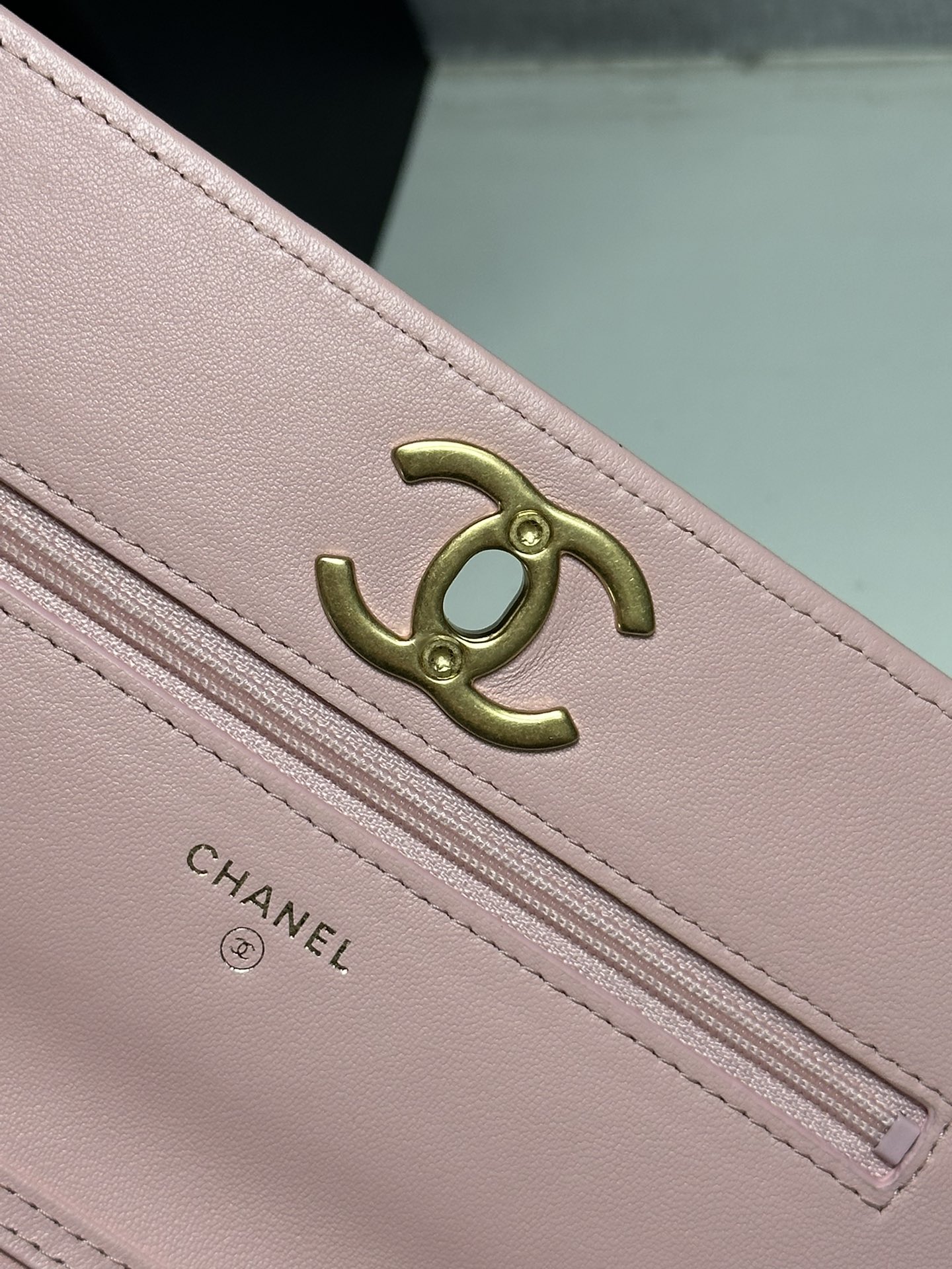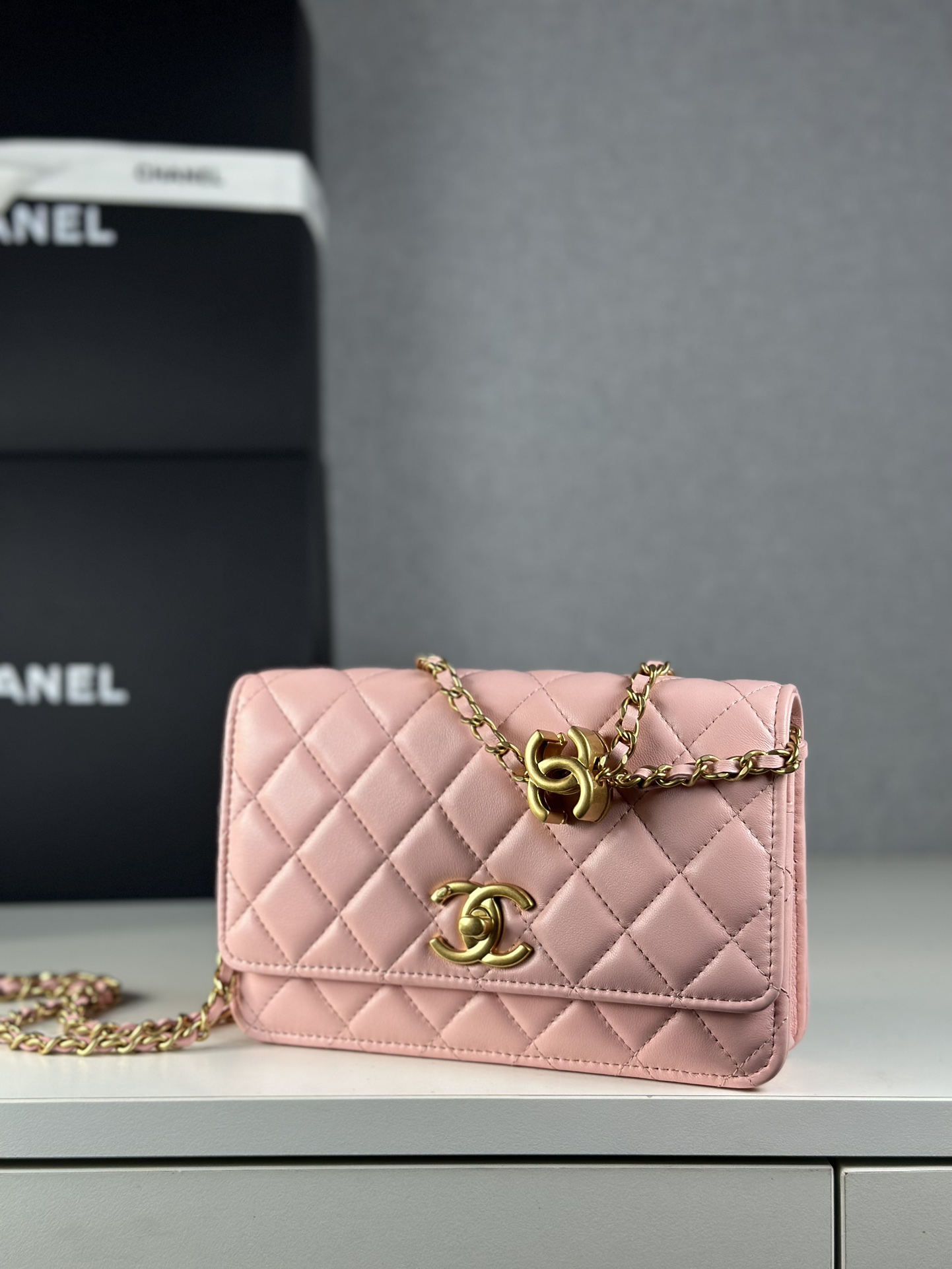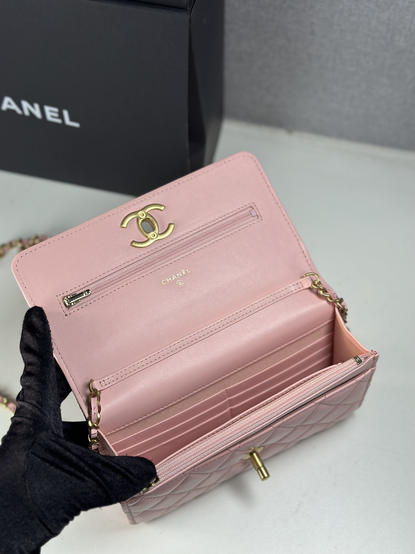 The Chanel Wallet On Chain boasts classic lambskin, a retro double C clasp, and adjustable chain. Compact and versatile for any occasion.