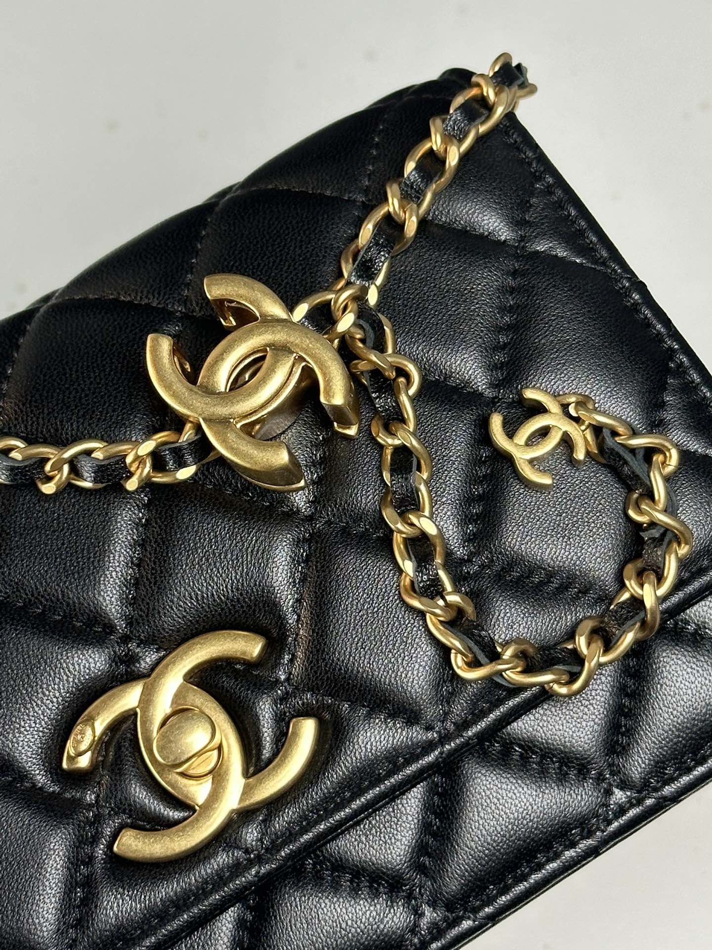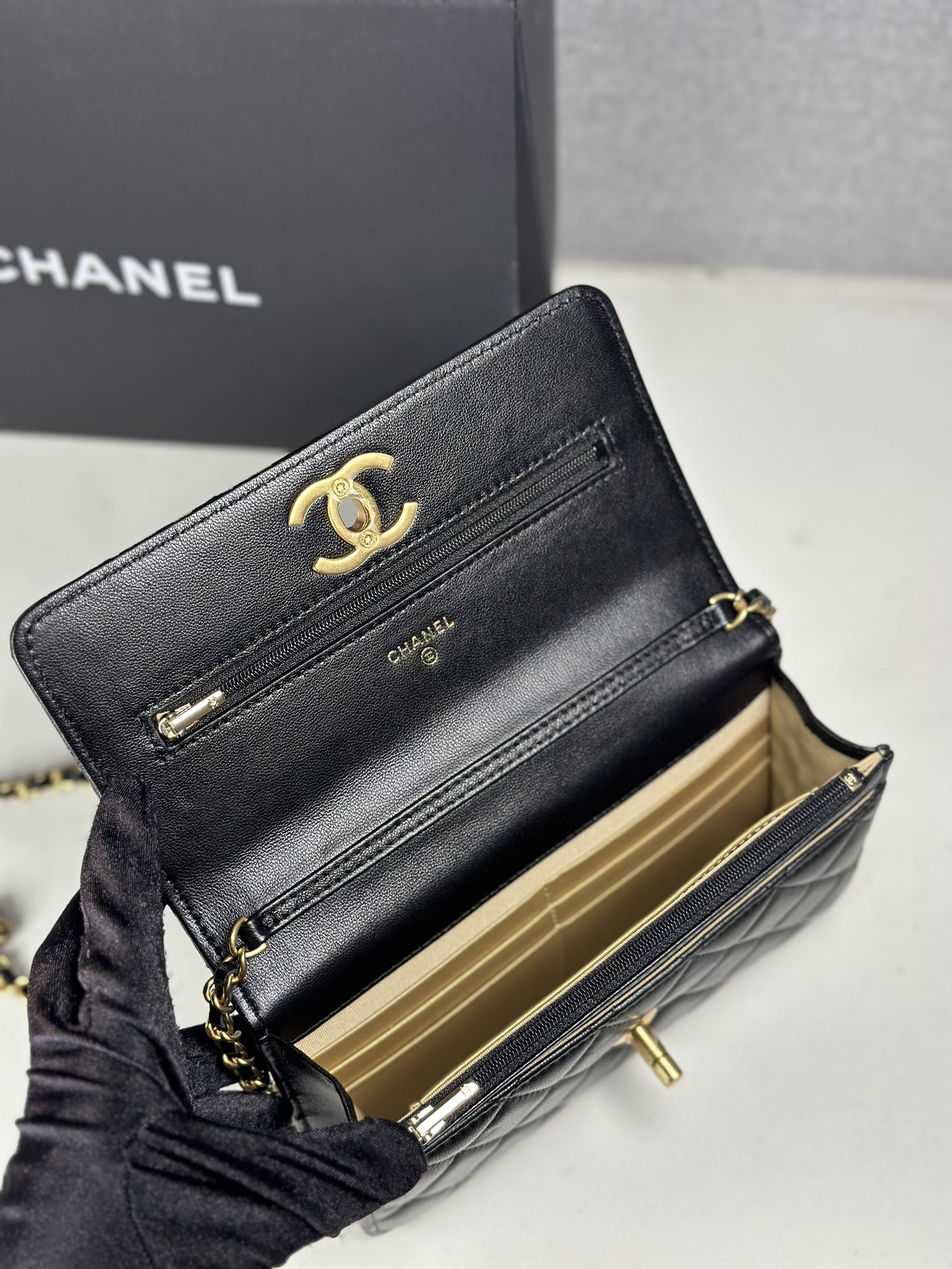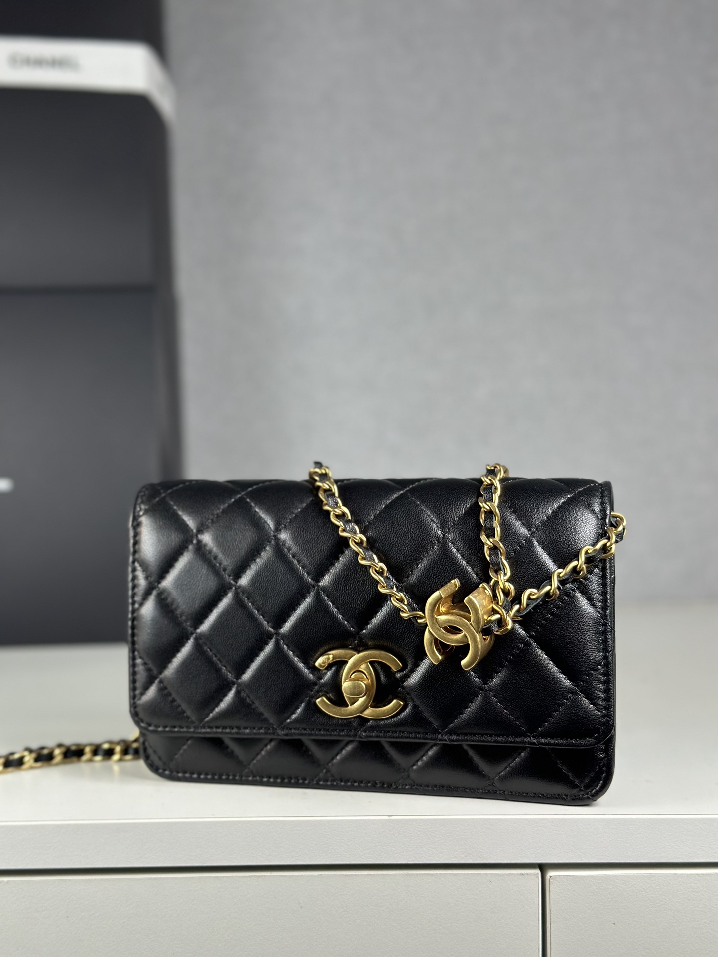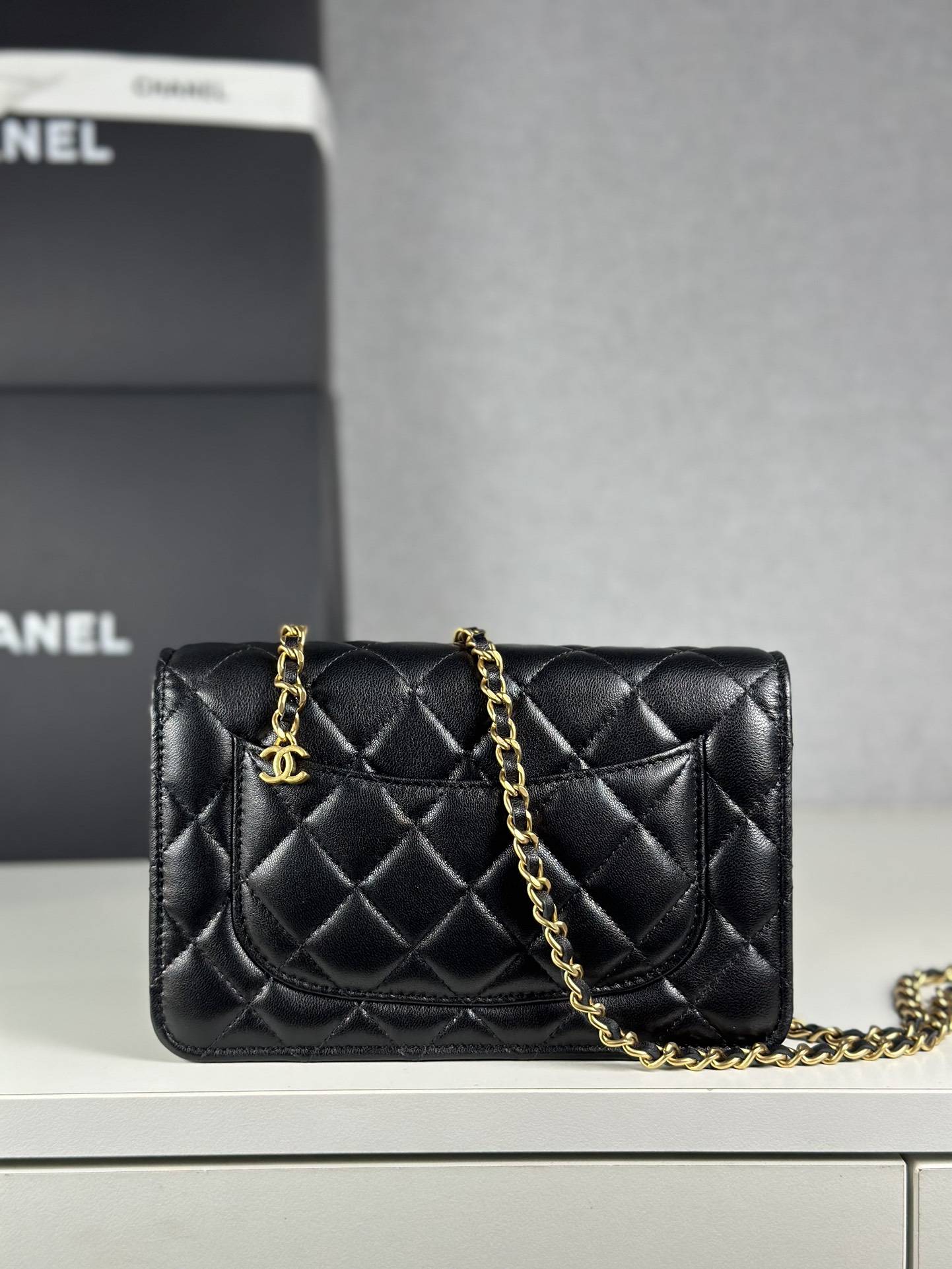 Timeless Chanel WOC bag in luxurious lambskin. Features iconic double C logo, adjustable chain, and compact design. Perfect for any occasion.