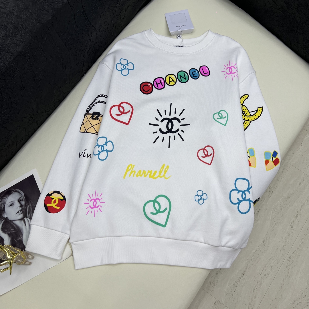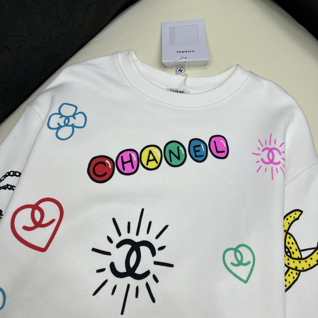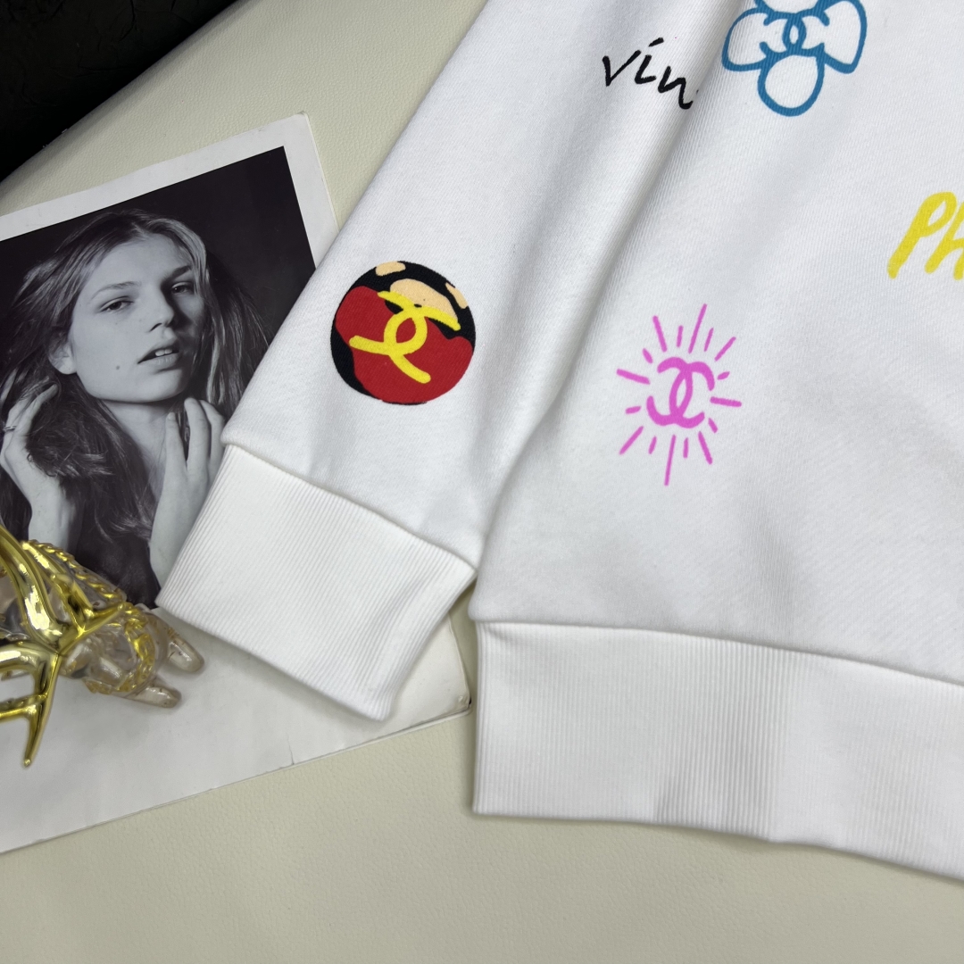 Elevate your casual wardrobe with this soft cotton Chanel sweatshirt. Features a round neck, loose fit, and colorful prints. Available in sizes S-L.