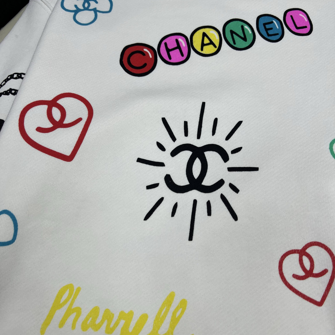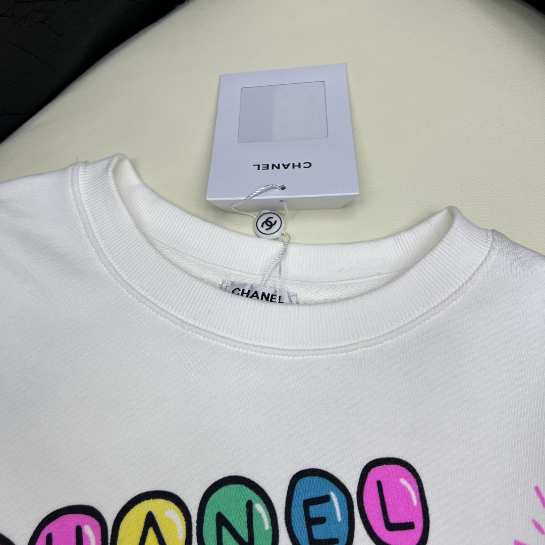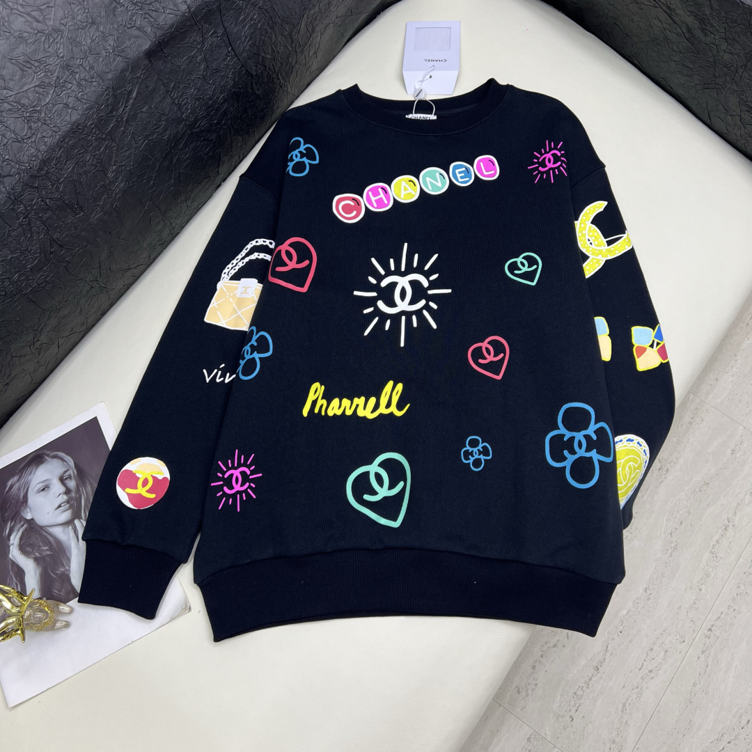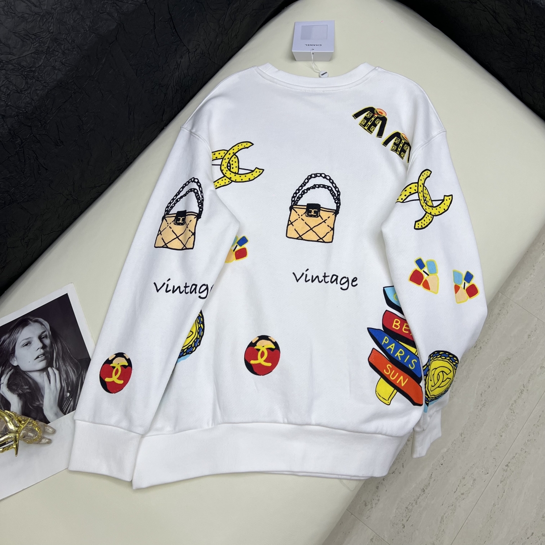 Elevate your casual wardrobe with this soft cotton Chanel sweatshirt. Features a round neck, loose fit, and colorful prints. Available in sizes S-L.