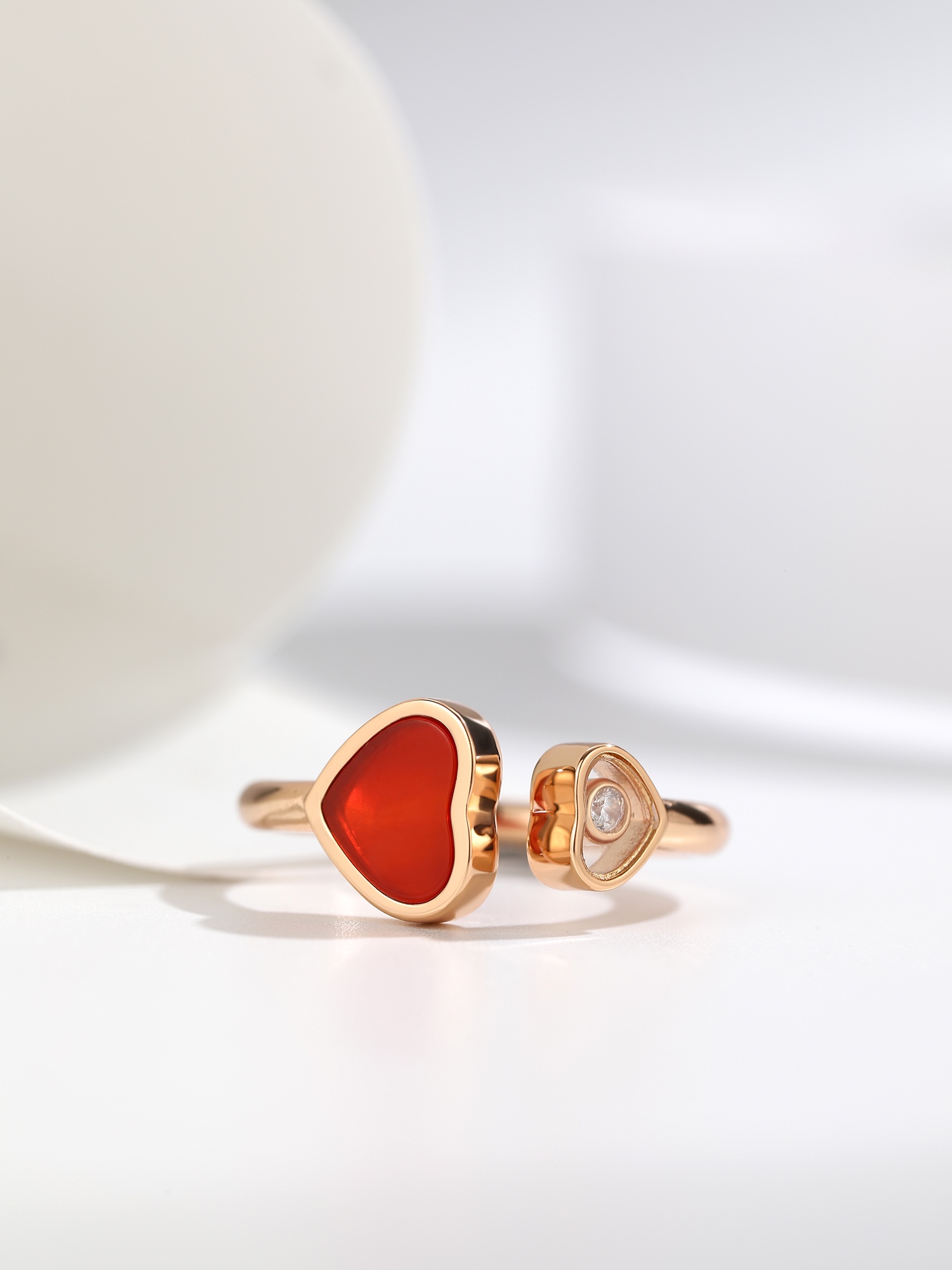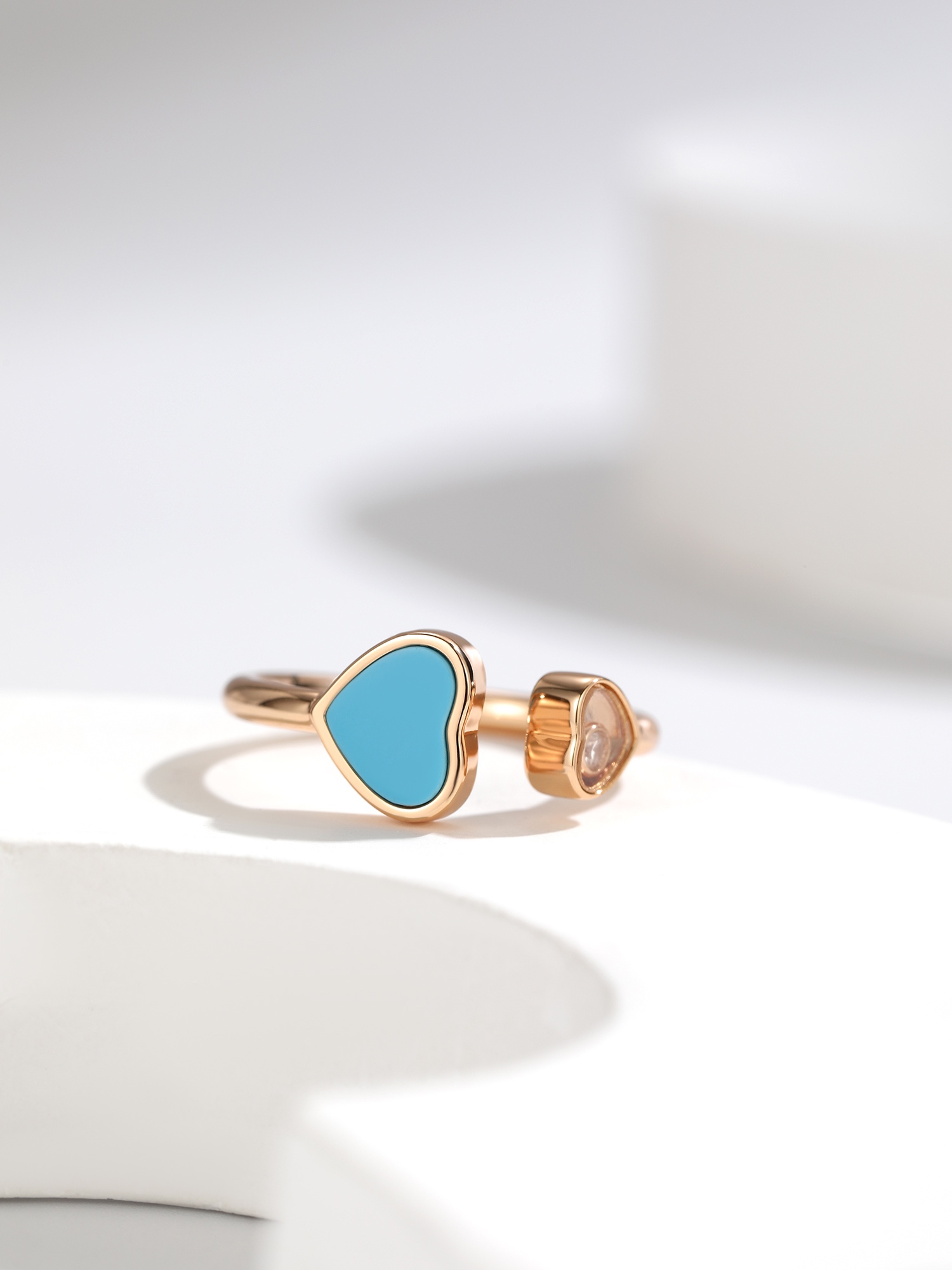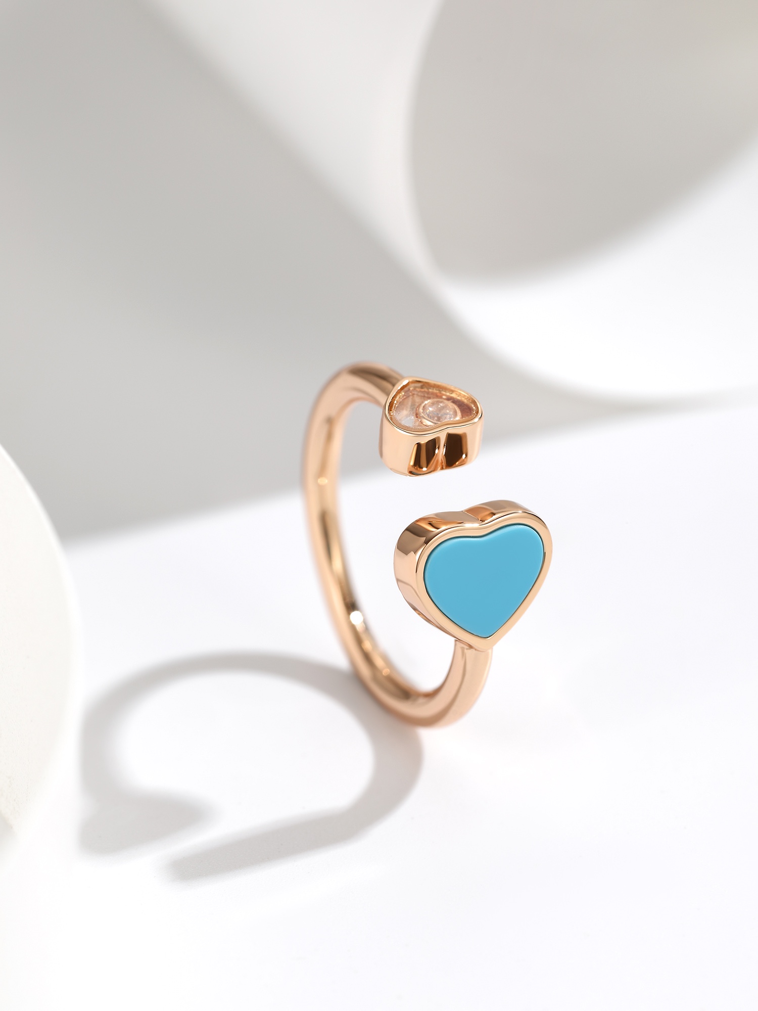 Elegant Chopard Happy Hearts ring featuring rose gold, a sparkling diamond, and colorful stones. Perfect for adding a touch of love and luxury to any look.