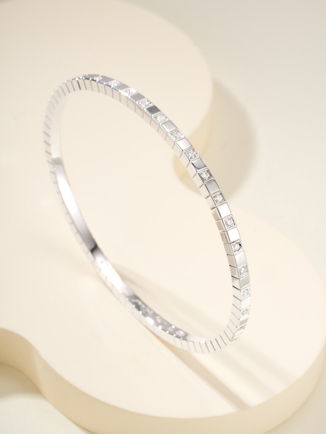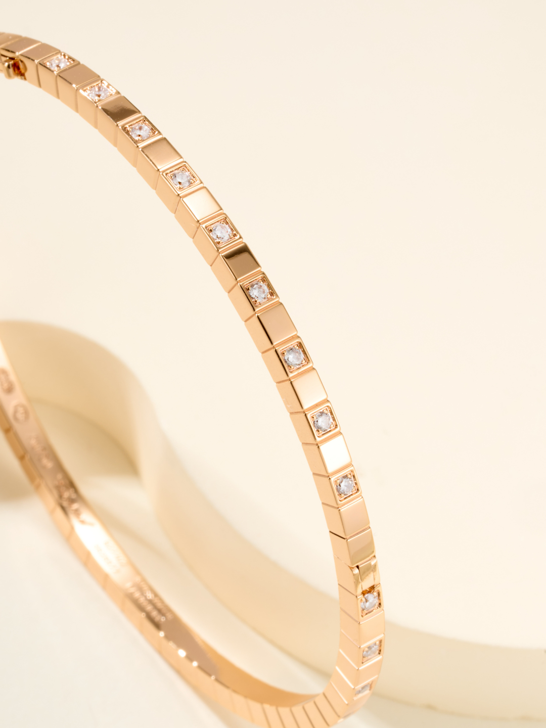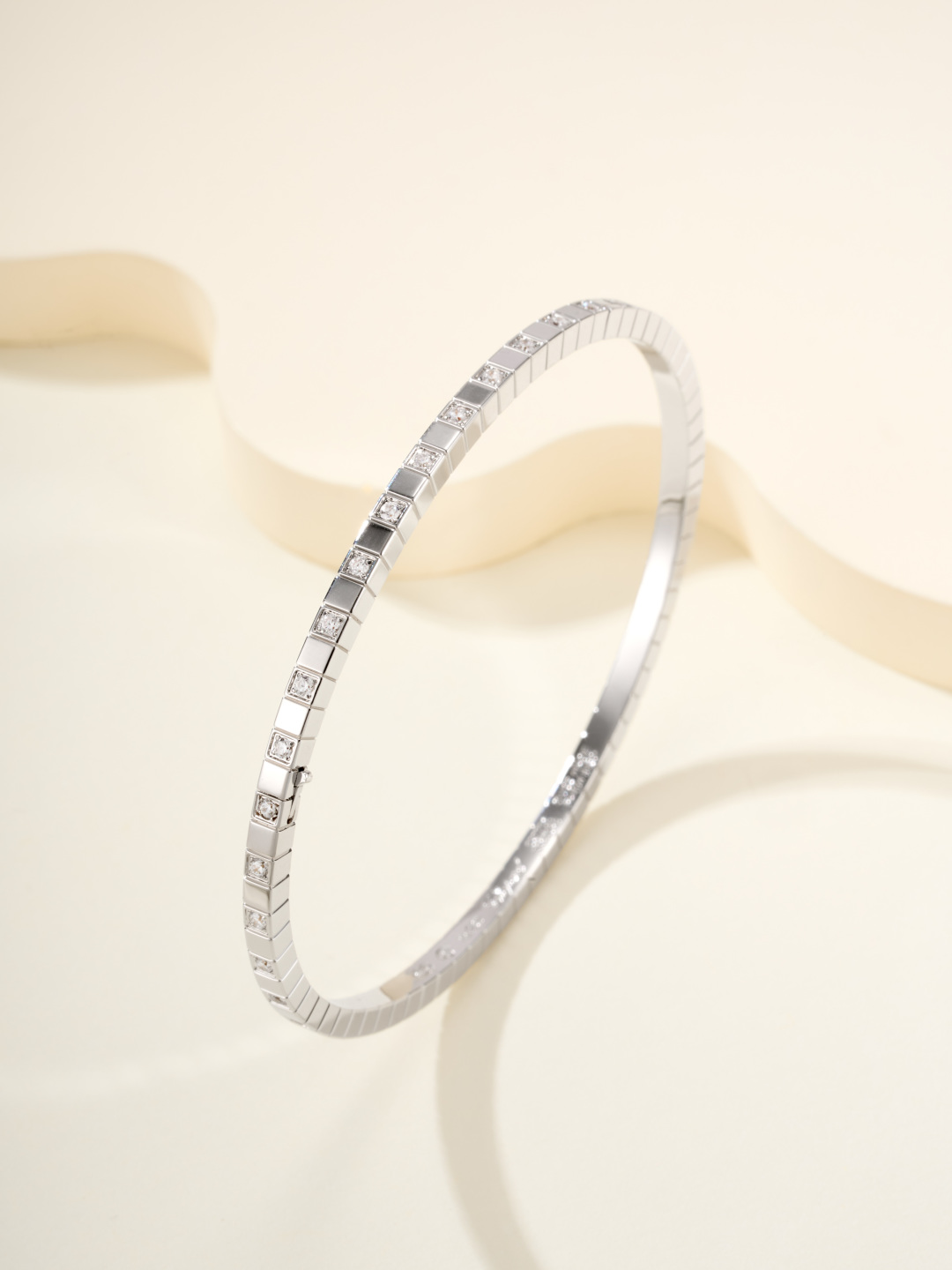 Introducing the epitome of elegance and modern design – the Chopard Ice Cube Diamond Bangle Bracelet. This exquisite piece combines minimalist aesthetics with the luxurious sparkle of diamonds, making it a versatile addition to any jewelry collection.