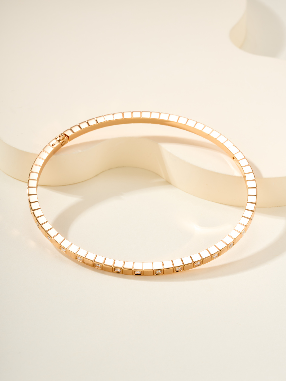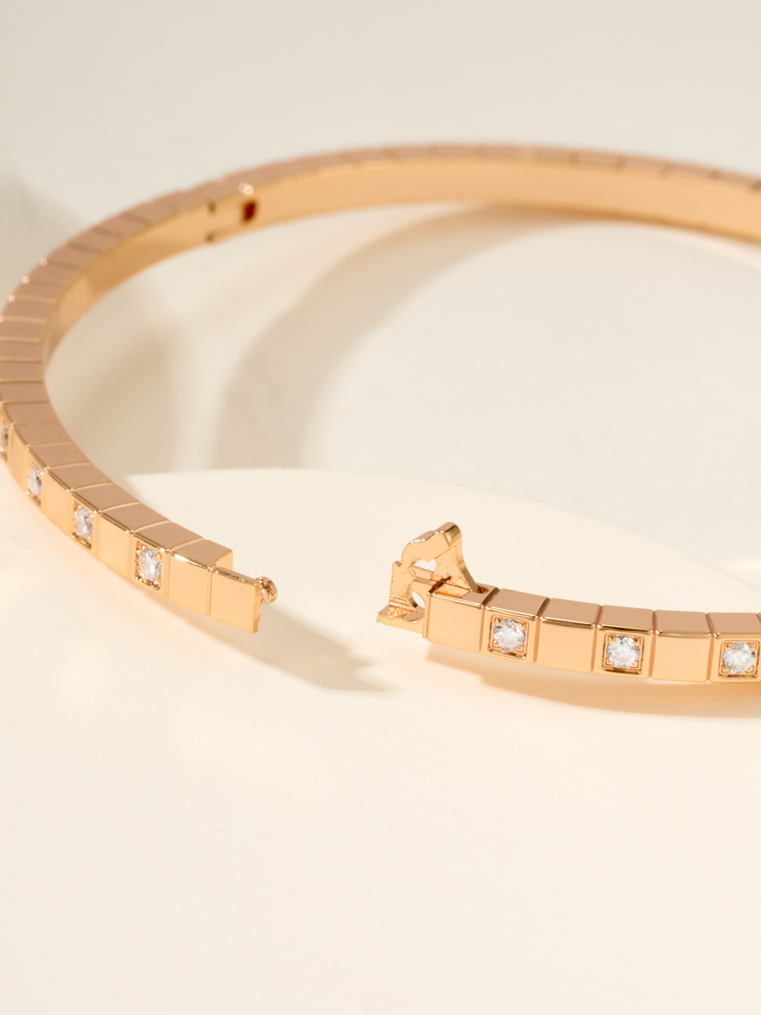 Dazzle with Chopard's Ice Cube bangle. Featuring a sleek design with diamond accents, this bracelet adds elegance to any outfit. Available in rose & white gold.